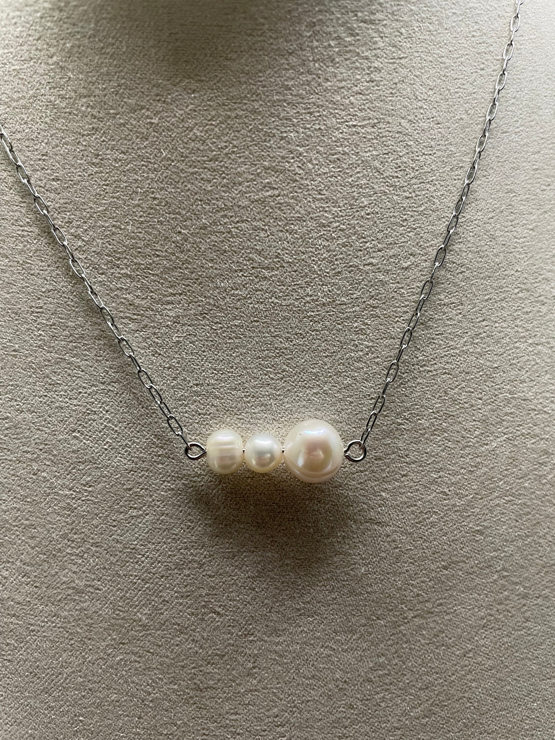 Ce collier délicat en perles d’eau douce présente un design minimaliste composé de trois perles naturelles, disposées en dégradé pour une allure élégante et équilibrée. La perle du bout, légèrement plus grande, est accompagnée de deux perles plus petites, créant une composition intemporelle facile à porter au quotidien comme lors d’occasions spéciales.