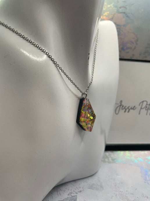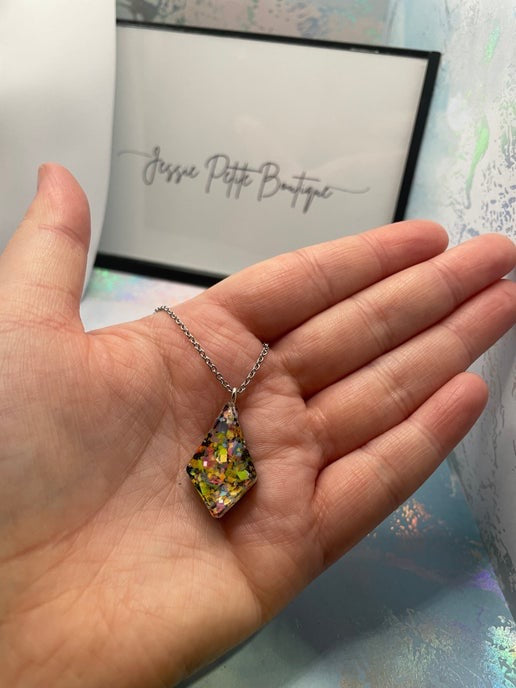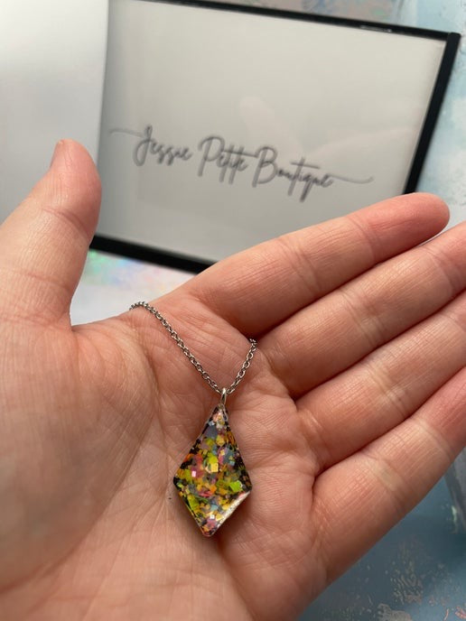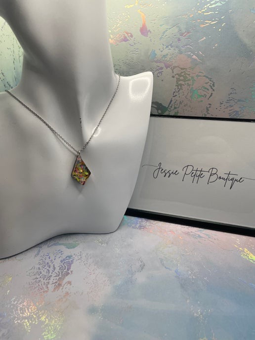 Ajoutez une touche de couleur et de modernité à votre collection d'accessoires avec ce collier pendentif losange original. Doté d'un pendentif audacieux en forme de losange aux teintes vibrantes de rose, bleu, vert, jaune, noir et transparent, ce collier allie un design saisissant à une utilisation ludique de résine, de poudre de mica et de paillettes. Chaque couleur se marie harmonieusement pour créer une pièce unique et accrocheuse.