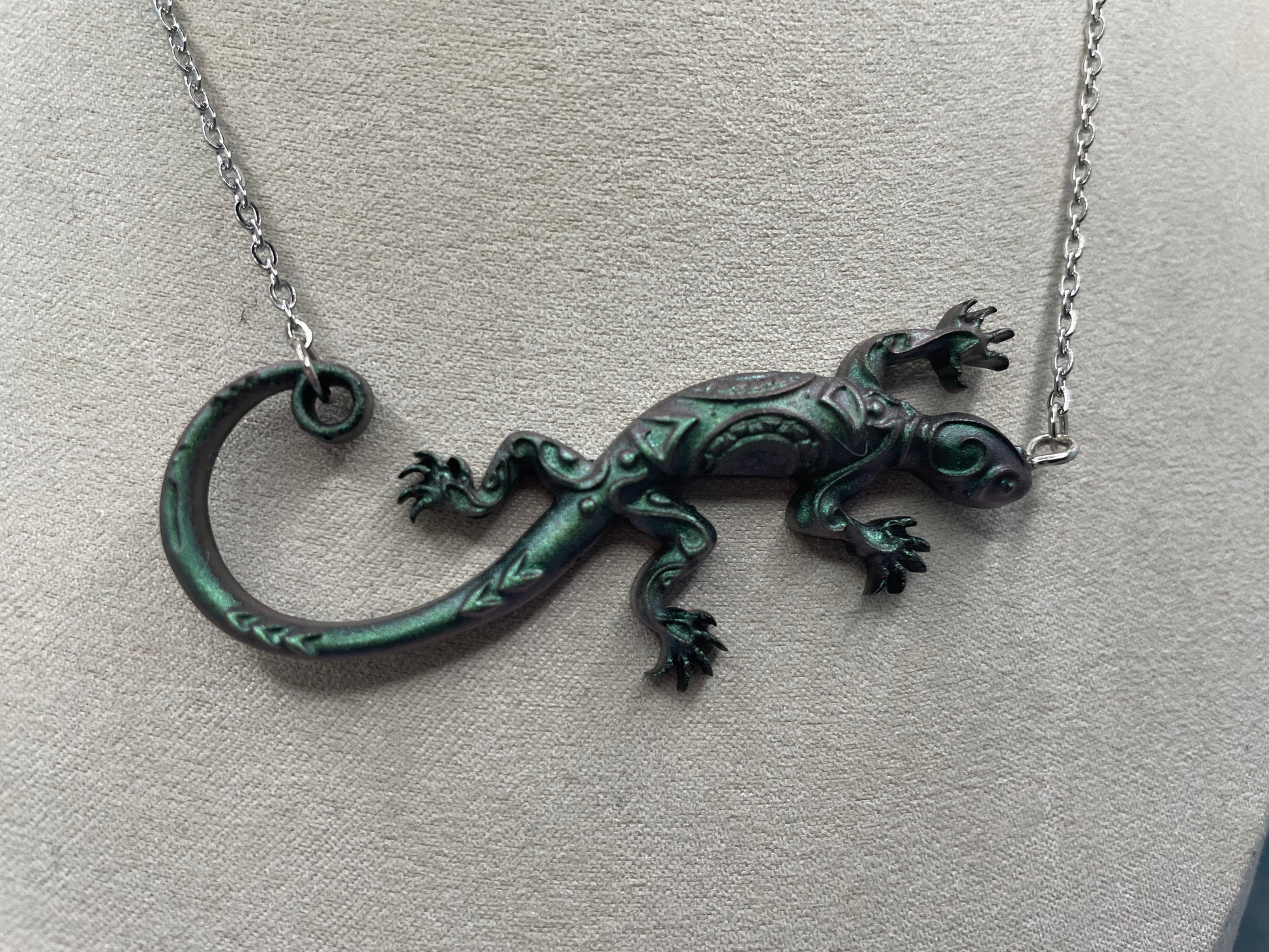 Ce collier met en valeur un lézard finement détaillé, au design allongé et dynamique. Réalisé en résine avec de la poudre de mica, le pendentif présente de subtils reflets verts et foncés qui accentuent les textures et les détails sculptés de la pièce. Sa forme expressive et légèrement courbée apporte une touche originale et artistique, tout en restant facile à porter au quotidien.