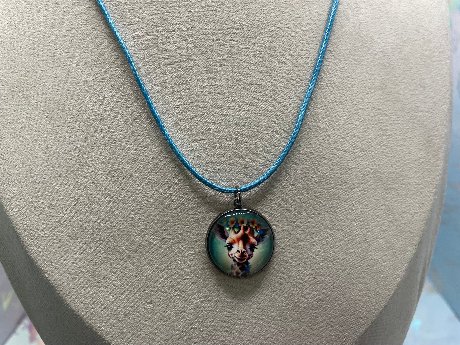 Apportez une touche de douceur et de fantaisie à votre tenue avec ce collier mettant en vedette une adorable girafe illustrée. Le cabochon en verre met en valeur les détails et les couleurs de l’illustration, tandis que le cordon bleu ajoute une note fraîche et légère. Un bijou charmant, facile à porter au quotidien ou à offrir en cadeau.