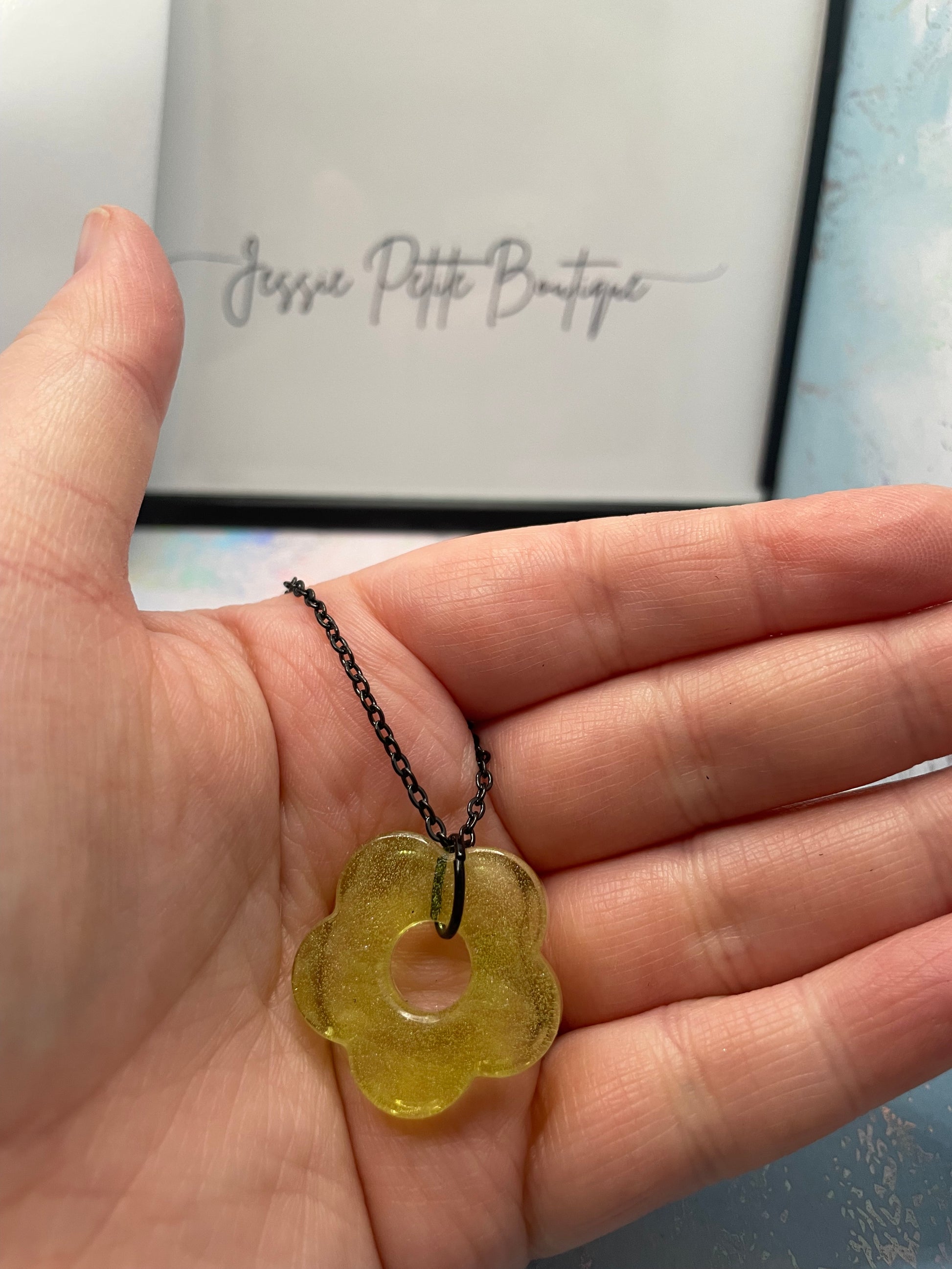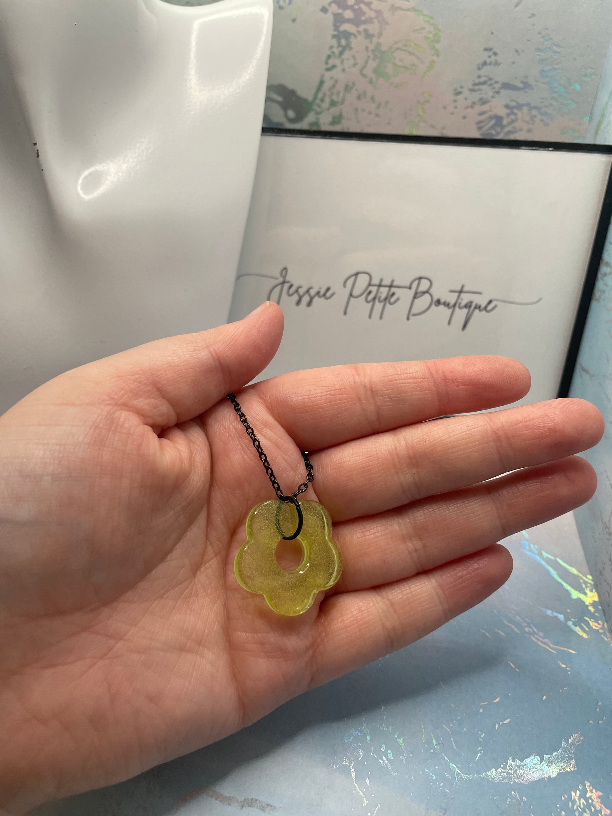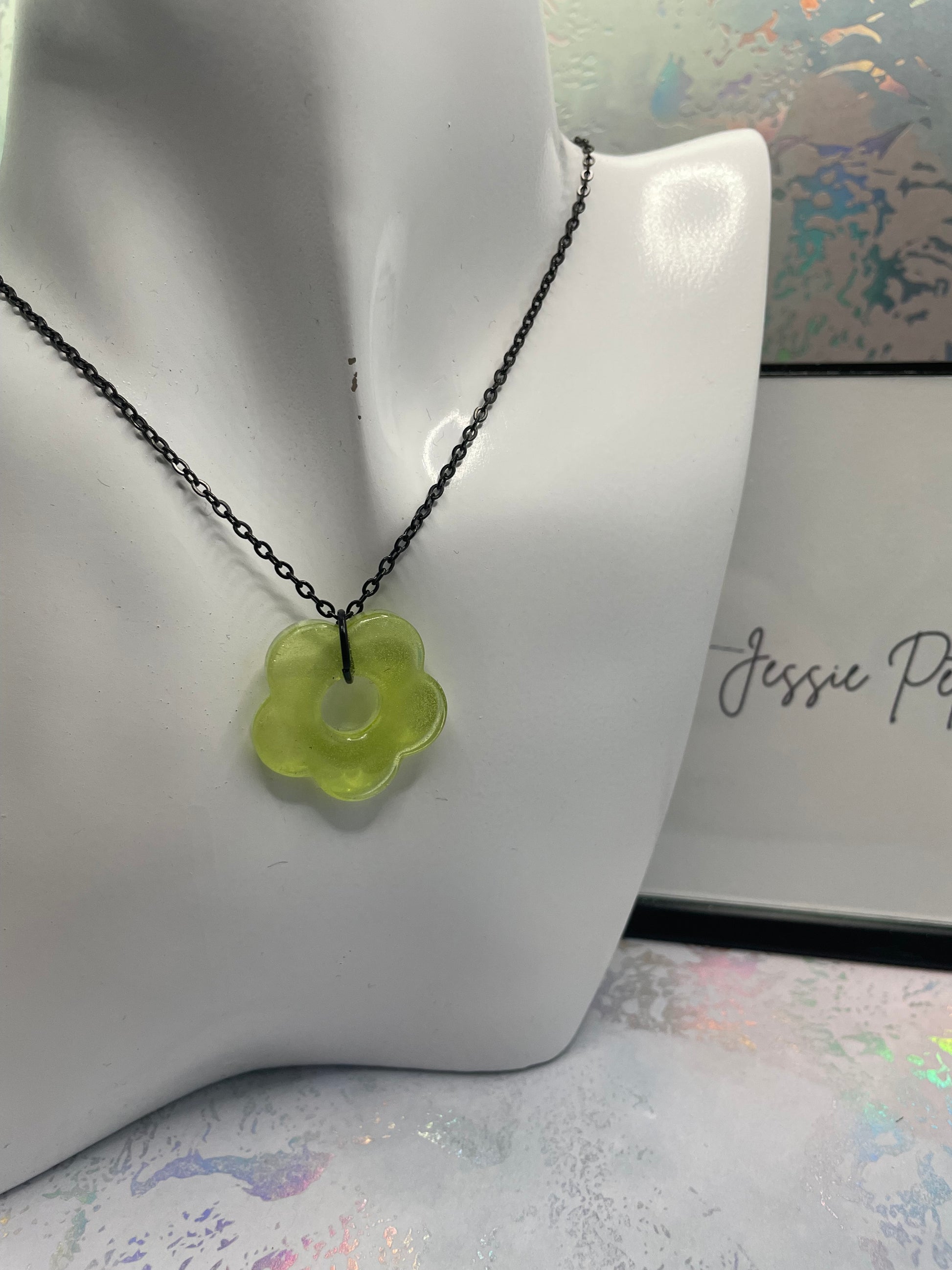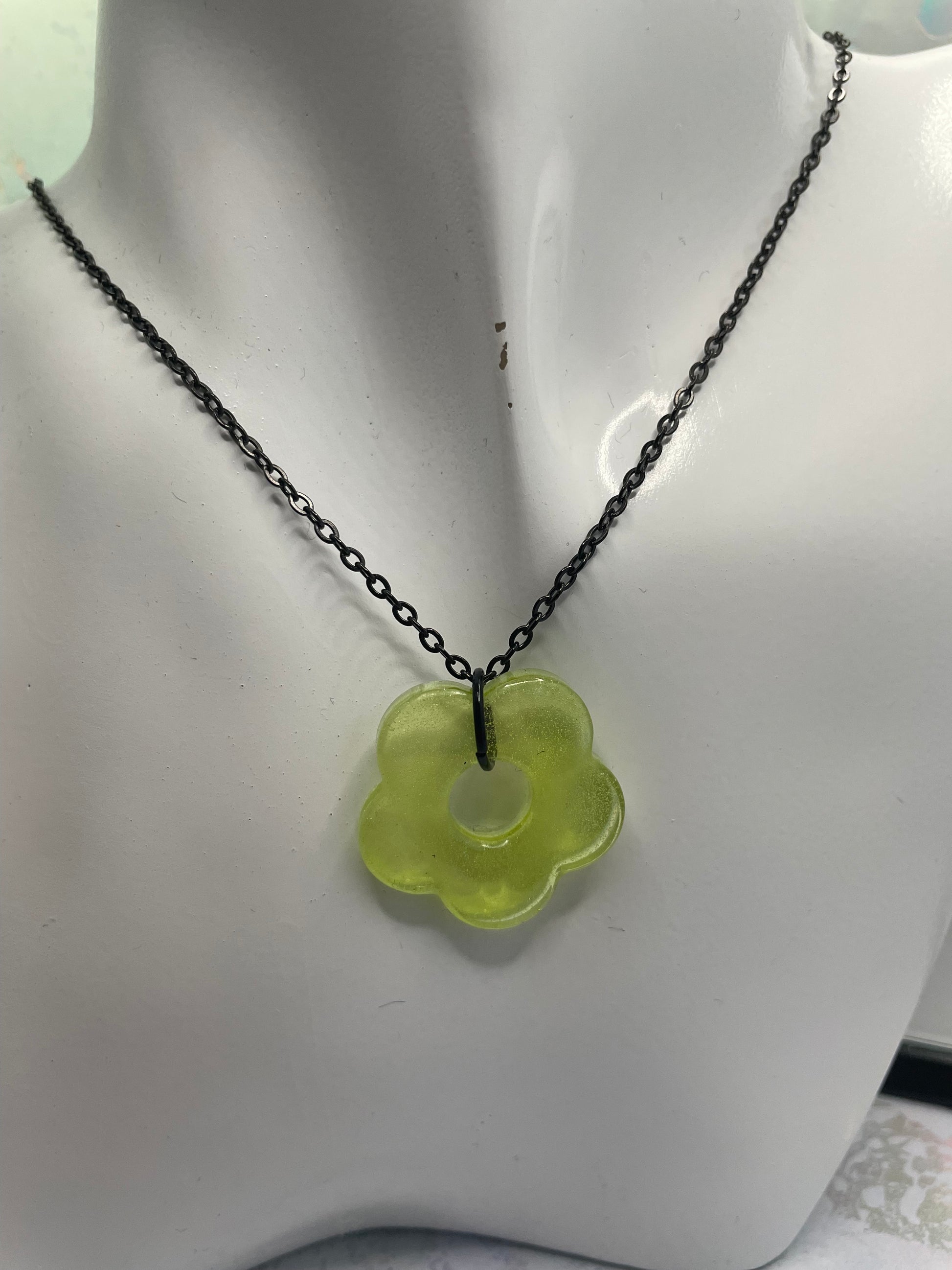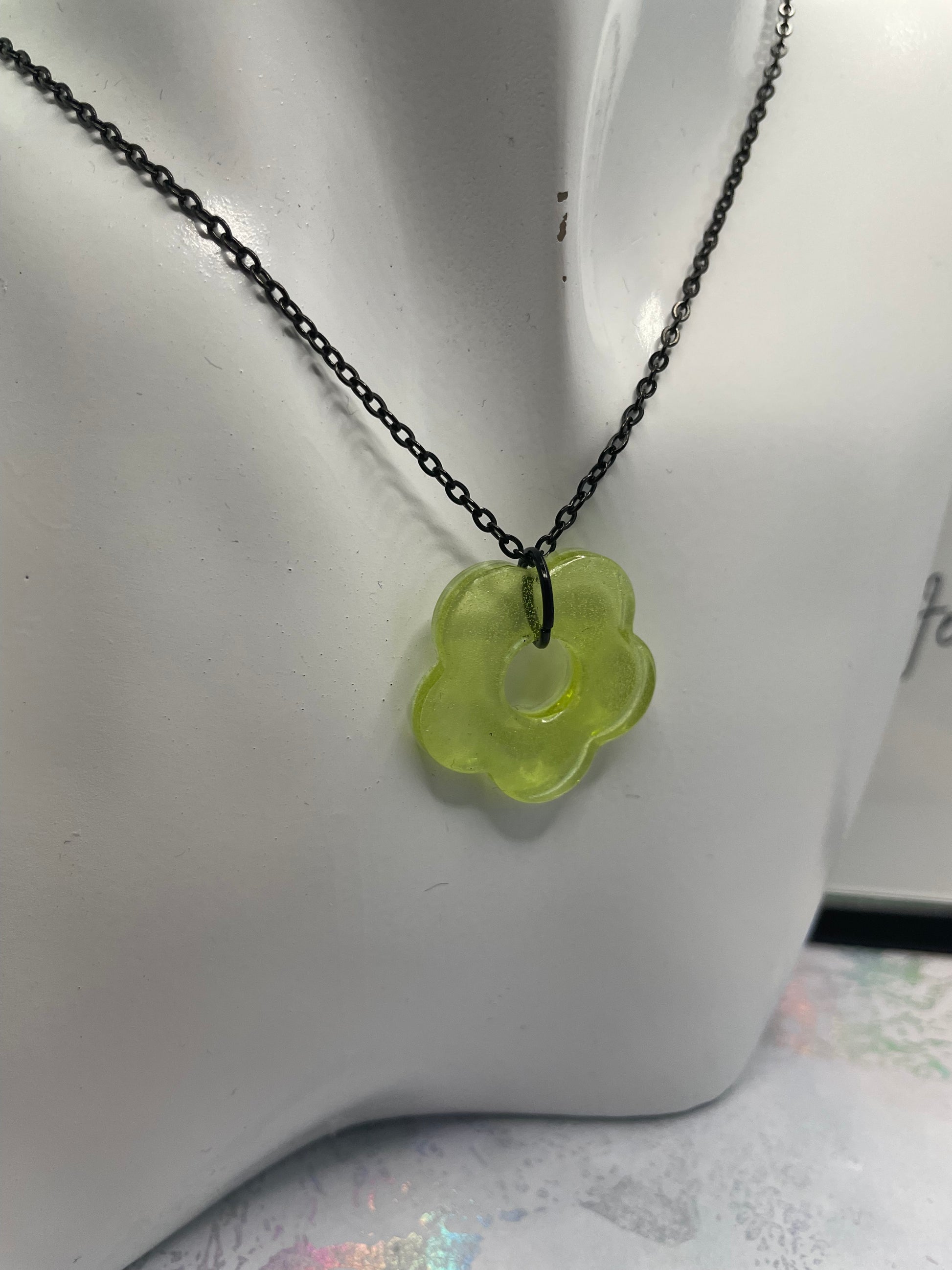 Ajoutez une touche d'éclat et de beauté inspirée de la nature à votre collection de bijoux avec ce collier pendentif fleur verte scintillante. En forme de fleur, ce pendentif arbore une teinte verte scintillante et éclatante qui scintille à chaque mouvement. Réalisé en résine et encre à alcool, ce pendentif incarne l'élégance et le charme espiègle.