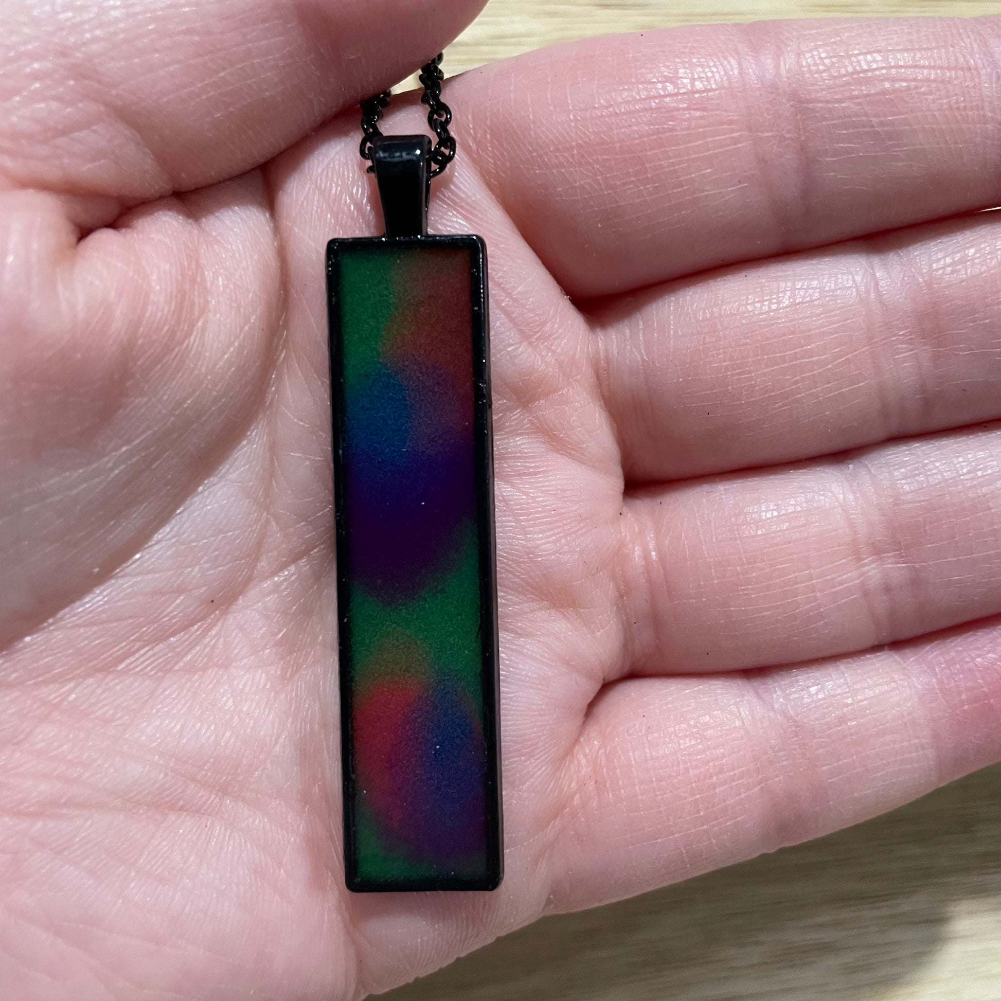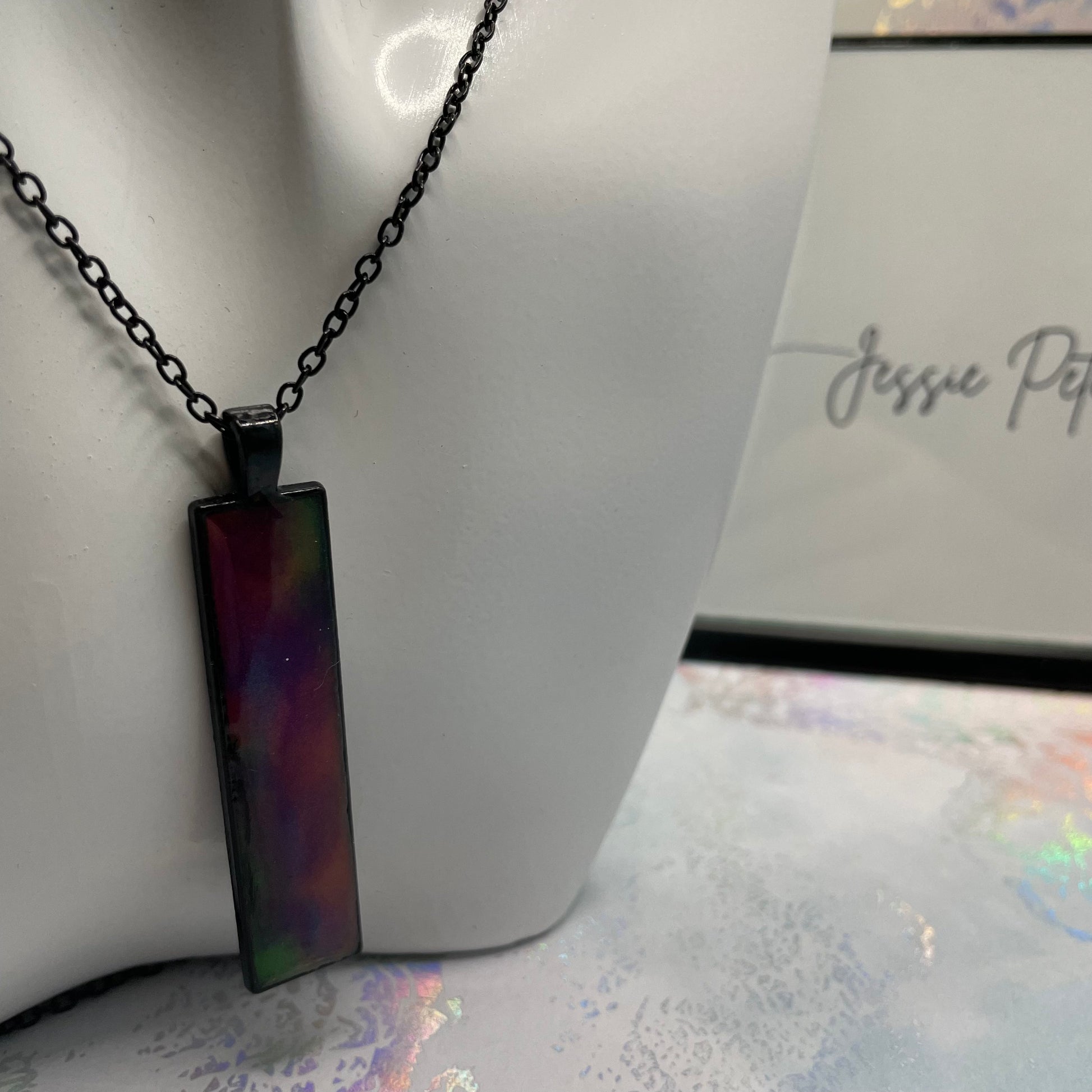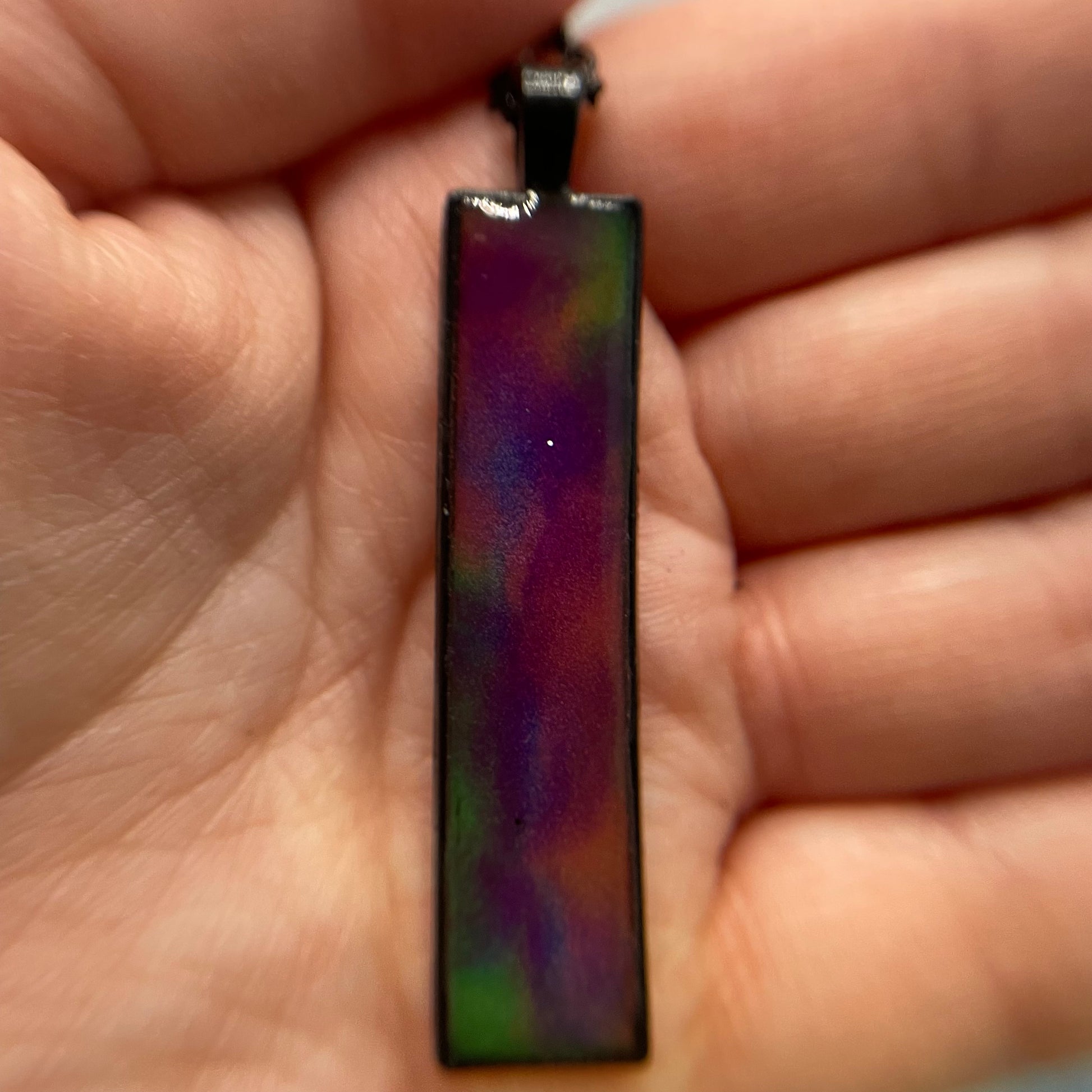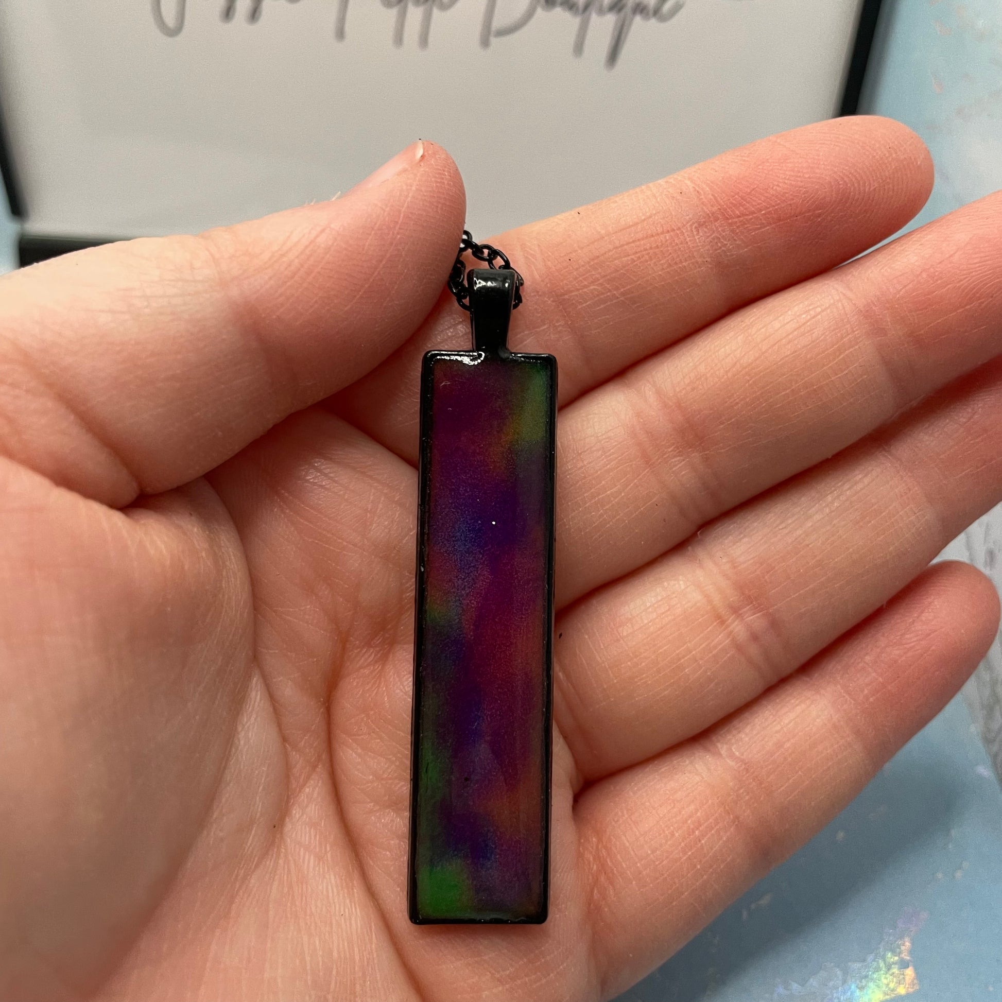 Admirez la beauté envoûtante des aurores boréales avec ce collier pendentif rectangulaire phosphorescent. Ce long pendentif élégant mesure 6 cm de haut et 1,1 cm de large et arbore un mélange saisissant de teintes roses, mauves, bleues et vertes qui brillent dans l'obscurité, imitant les couleurs éthérées des aurores boréales. Ce bijou accrocheur ajoute une touche mystique à votre look, qu'il soit porté de jour ou comme touche lumineuse la nuit.