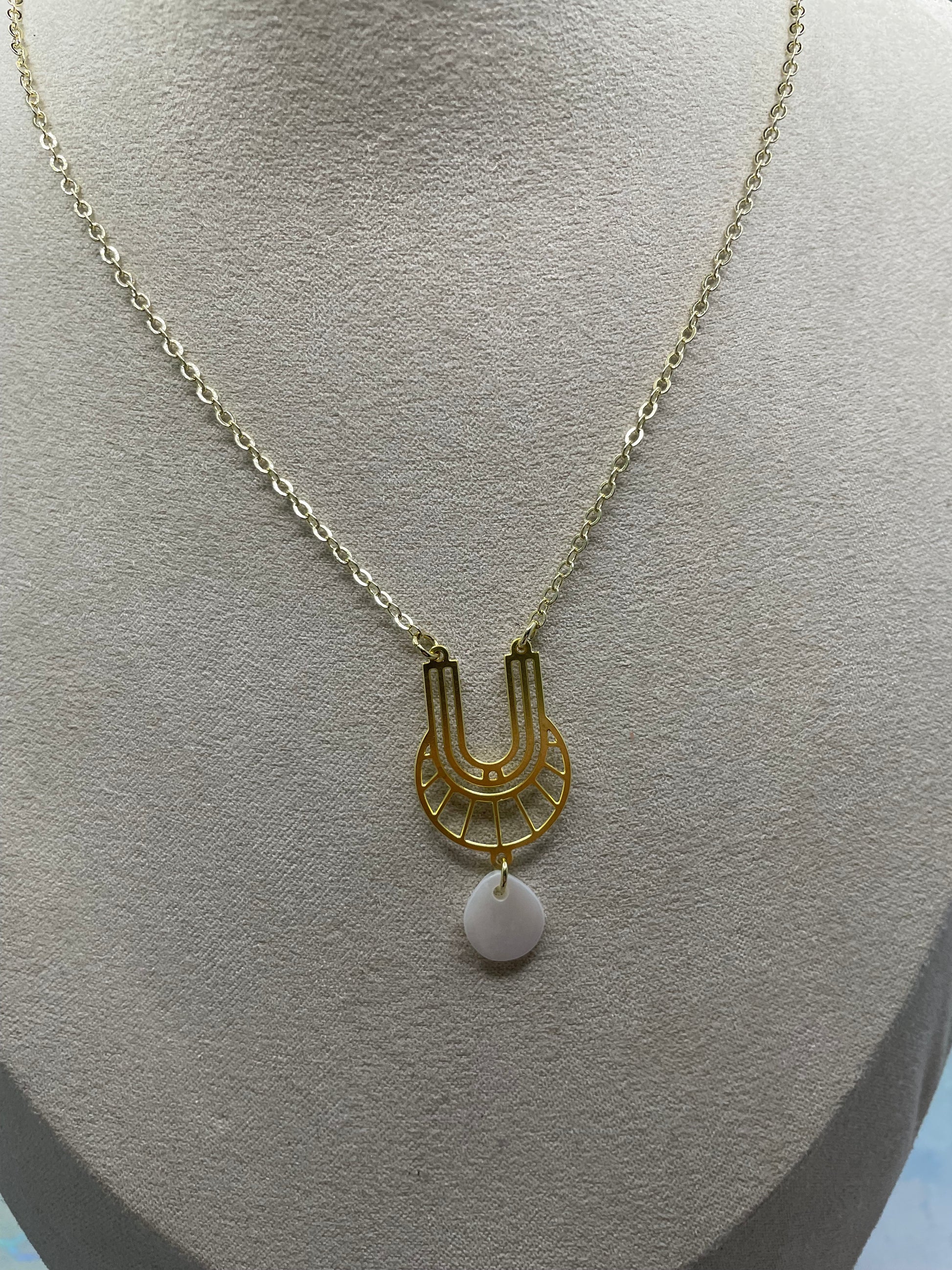 Ce collier élégant met en valeur un pendentif en forme d’arche organique plaqué or, accompagné d’un pendentif en coquillage en forme de goutte qui apporte une touche douce et lumineuse. Les lignes géométriques de l’arche contrastent harmonieusement avec la simplicité naturelle du coquillage, pour un design à la fois moderne et raffiné.
