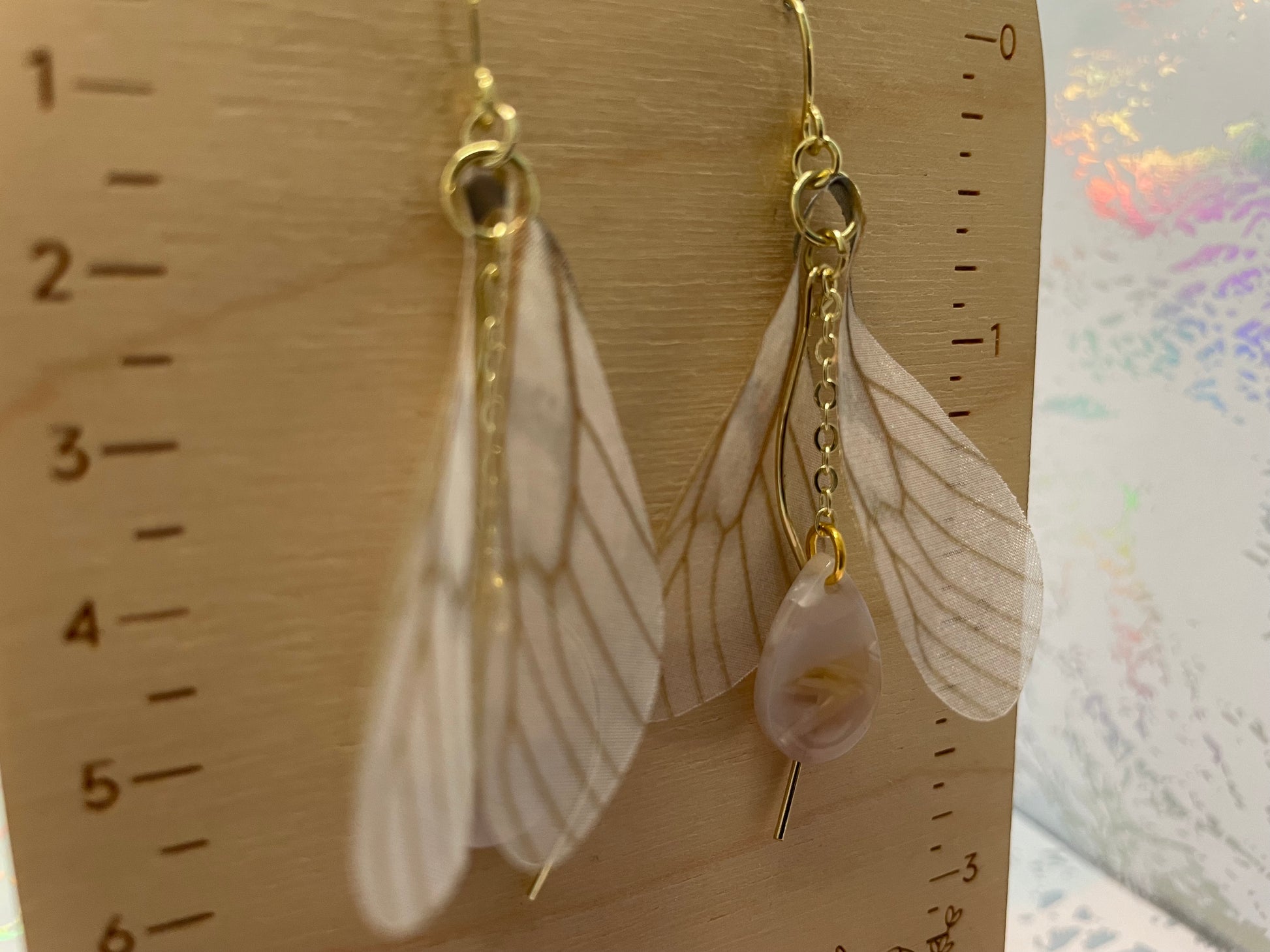 Ces boucles d’oreilles délicates inspirées des ailes de papillon offrent un design aérien et poétique. Les ailes en tissu translucide sont accompagnées d’une goutte en acrylique aux teintes douces, suspendue à une fine chaîne pour un mouvement fluide et léger. Montées sur des crochets sans nickel, elles allient élégance et légèreté.