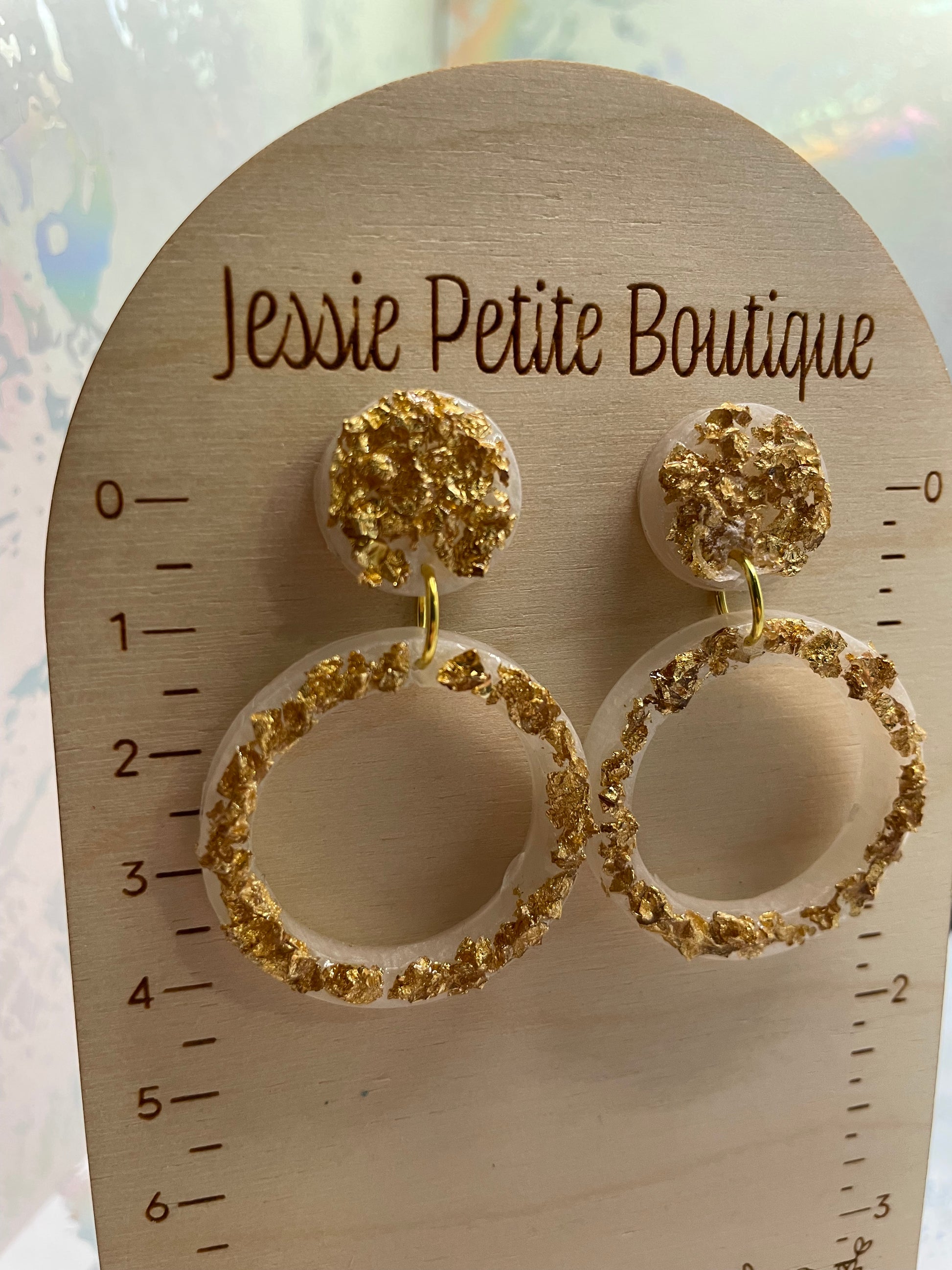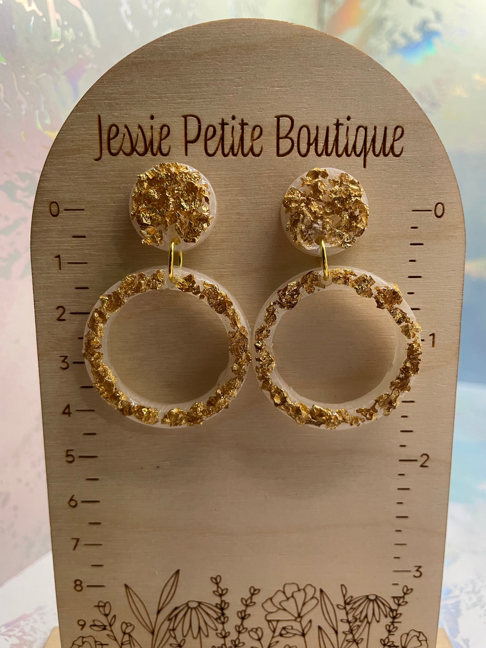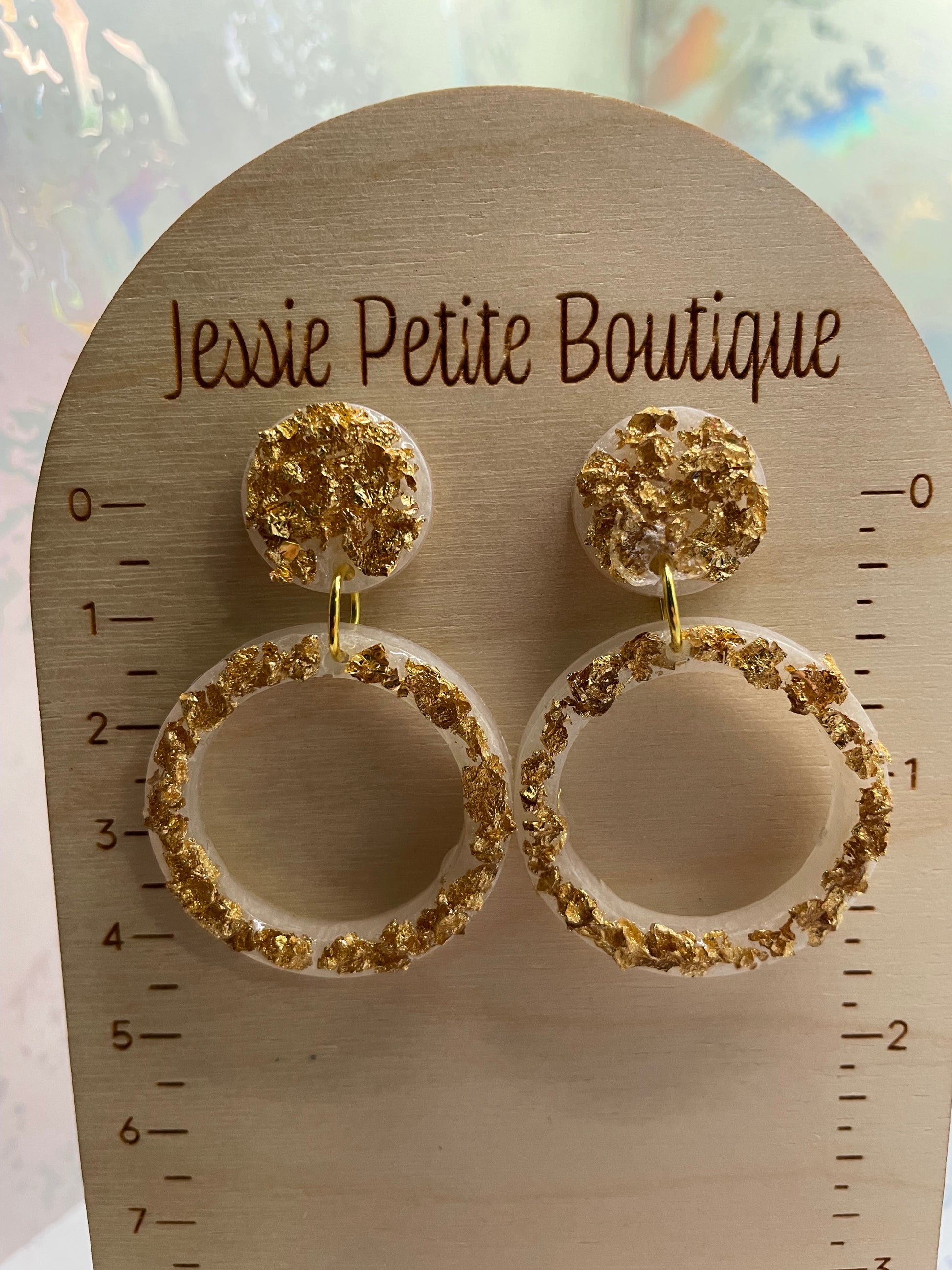 Ces superbes boucles d'oreilles arborent un design circulaire chic avec d'élégants détails en feuille d'or sur fond blanc. Fabriquées en résine légère et en poudre de mica, elles offrent un look moderne et sophistiqué, tout en étant sans nickel pour les oreilles sensibles. Parfaites pour ajouter une touche glamour à toutes vos tenues !
