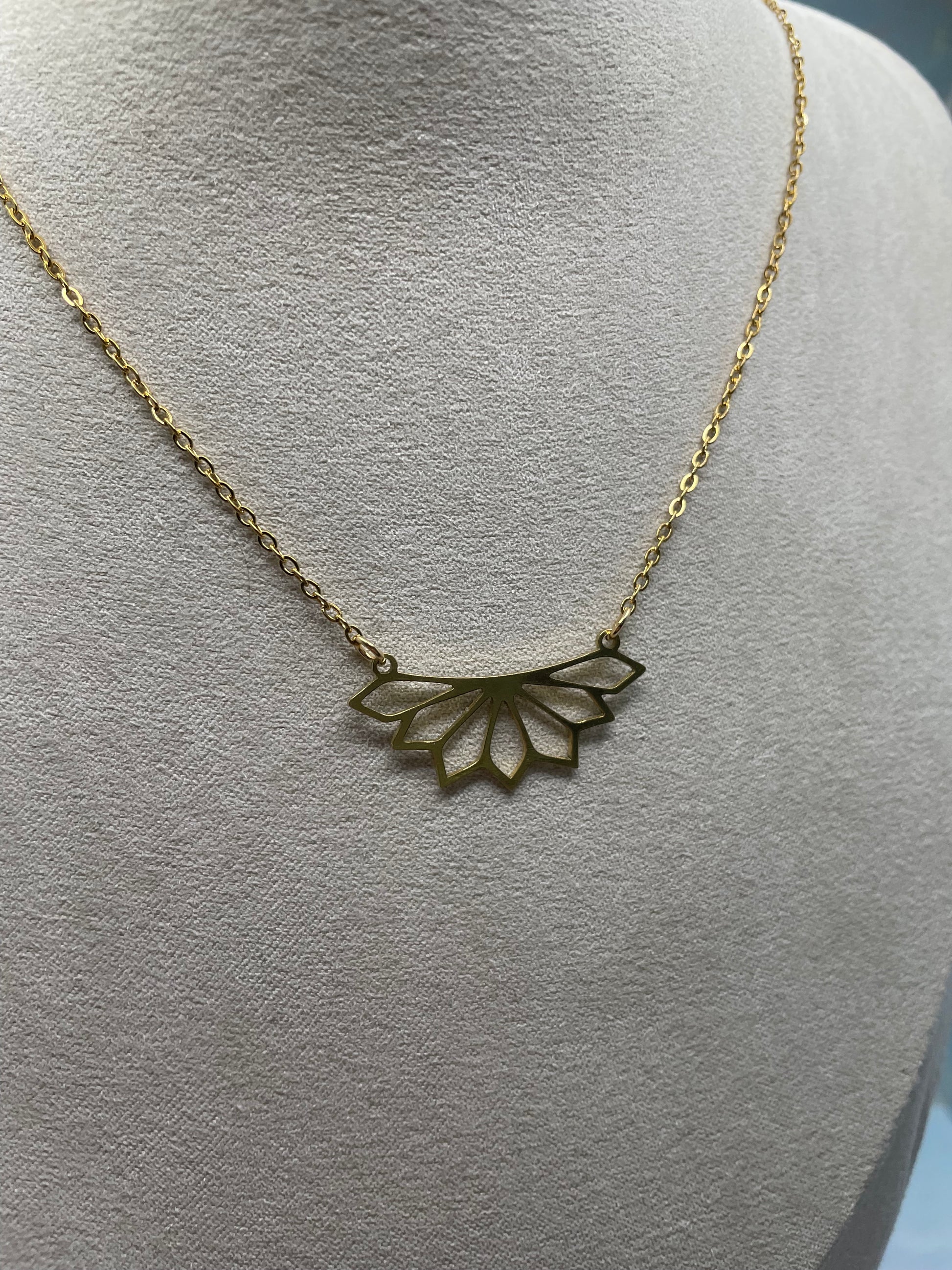 Délicate et intemporelle, cette chaîne dorée est ornée d’un pendentif lotus ajouré au design minimaliste. Sa silhouette légère et ses lignes épurées reposent élégamment au creux du cou, offrant une touche raffinée idéale au quotidien ou pour superposer avec d’autres colliers.