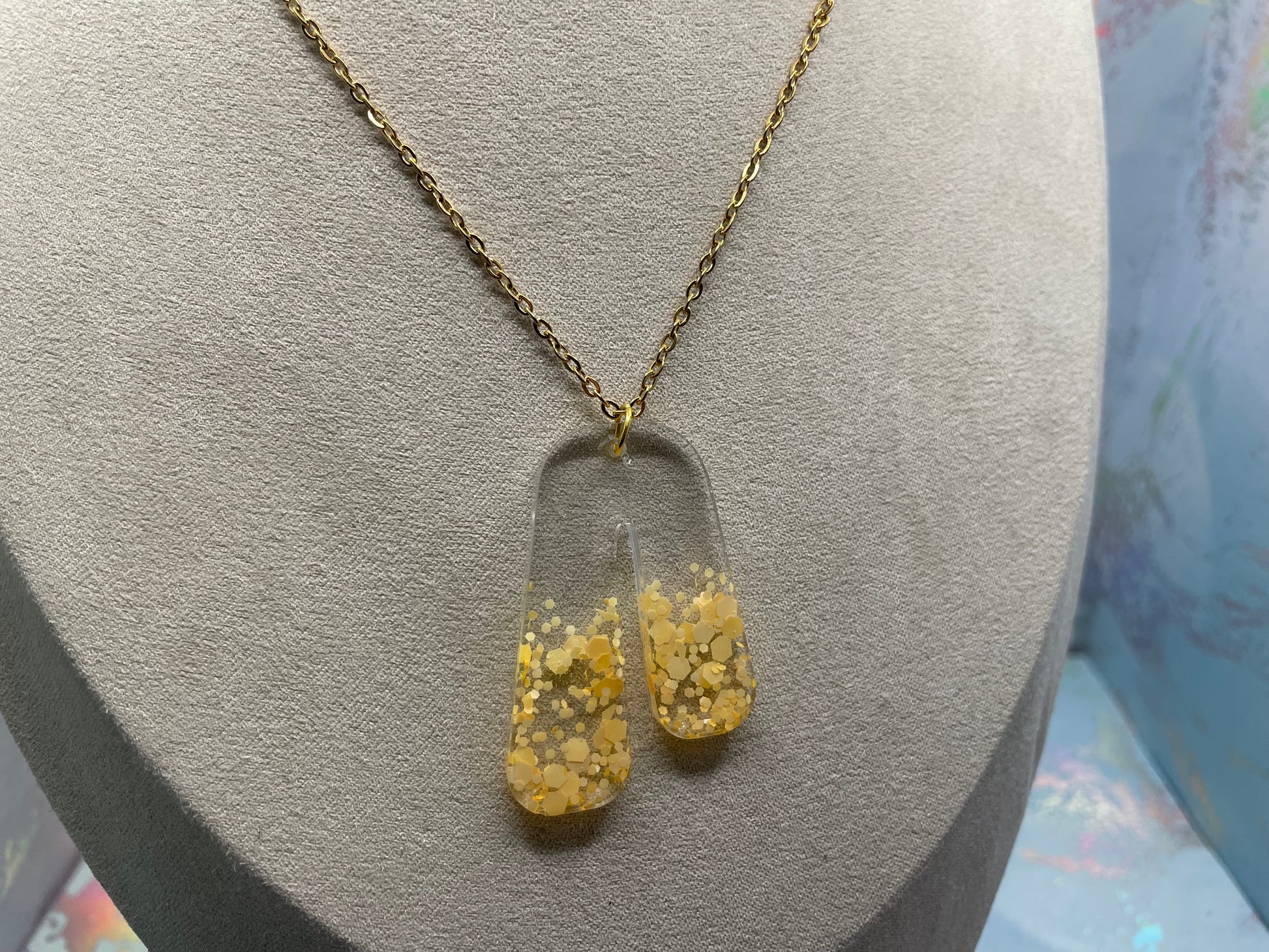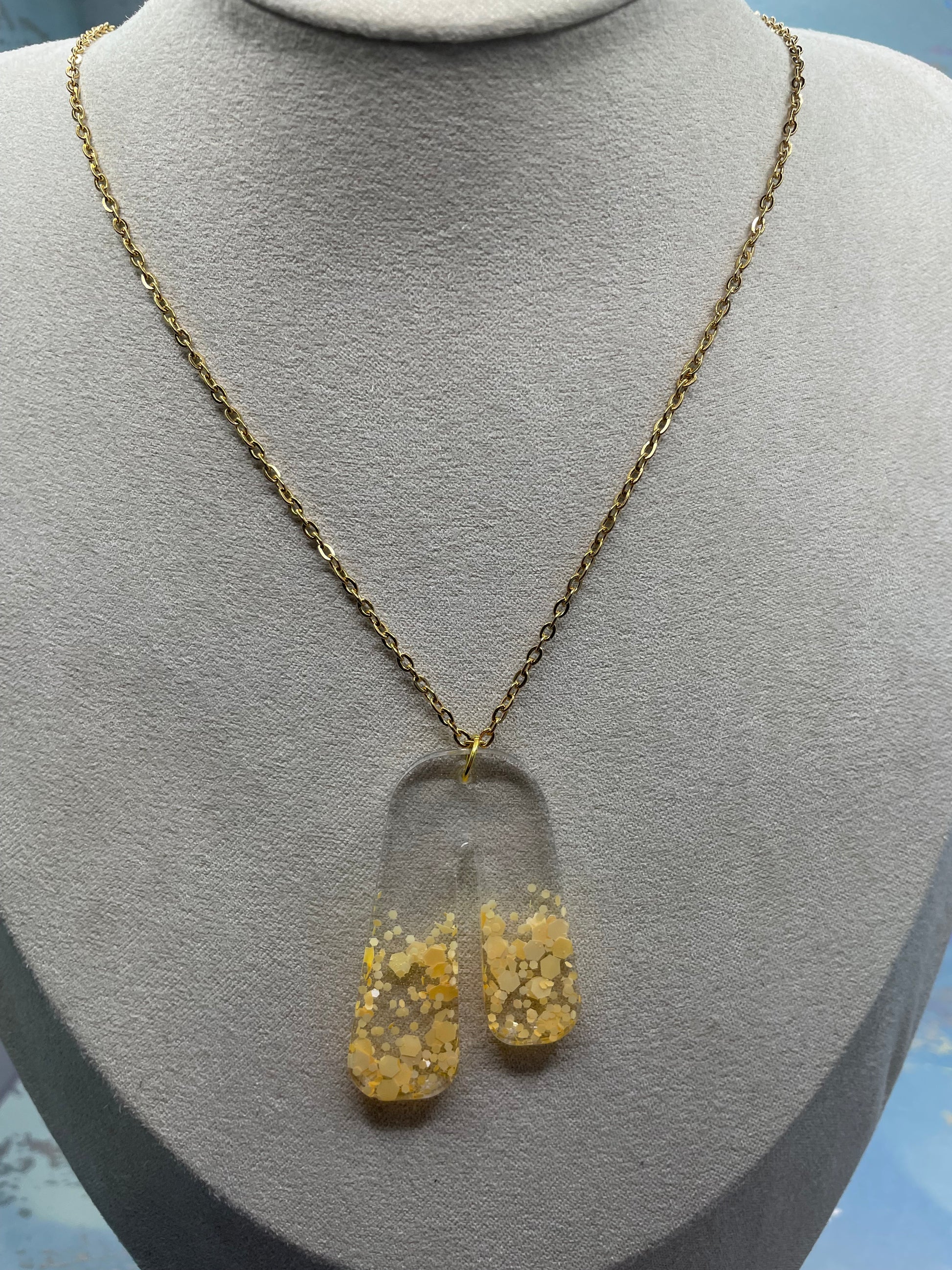 Un collier moderne au design affirmé présentant une silhouette en arche ouverte élégamment incurvée. Le pendentif en résine transparente se divise en deux formes allongées, créant un effet fluide et contemporain. La partie inférieure est remplie de brillants dorés de différentes tailles, donnant l’impression de particules d’or suspendues dans la résine cristalline.
