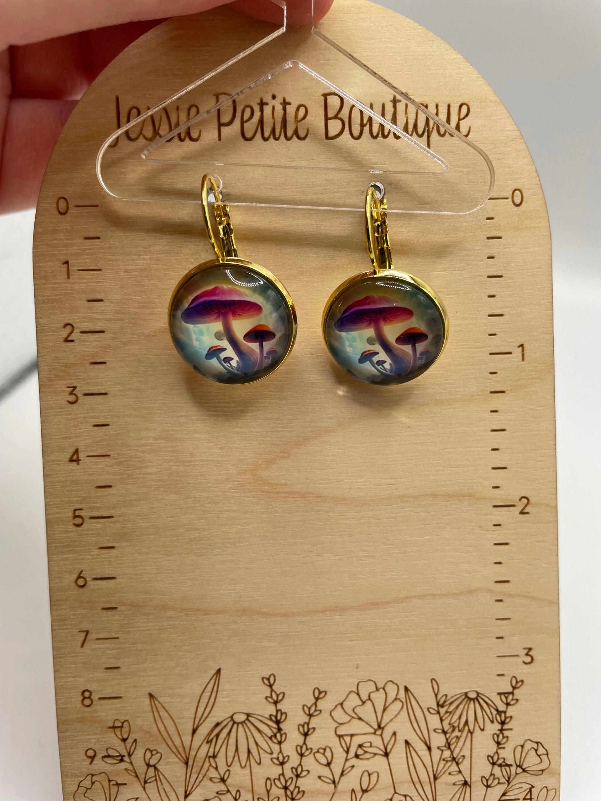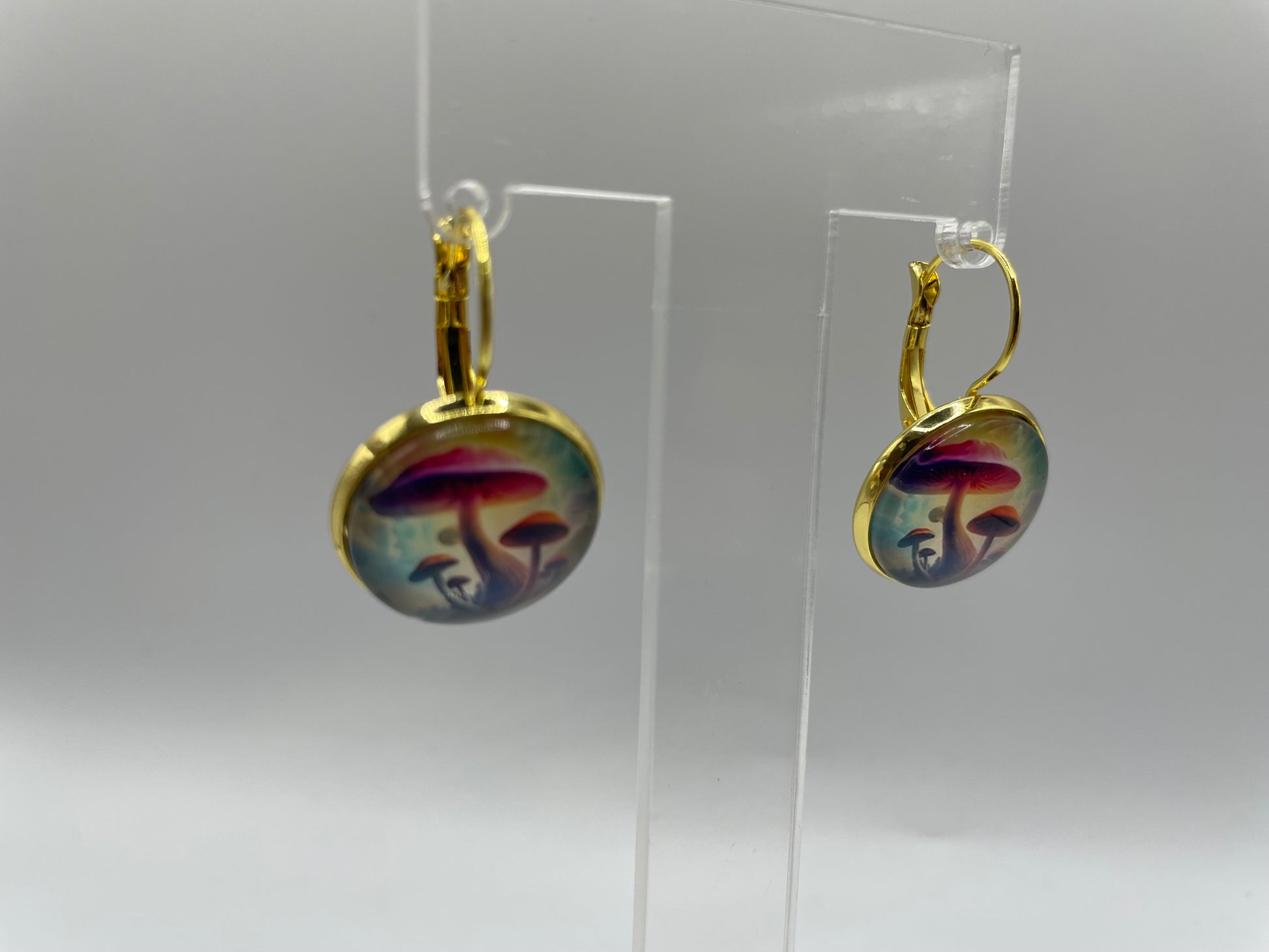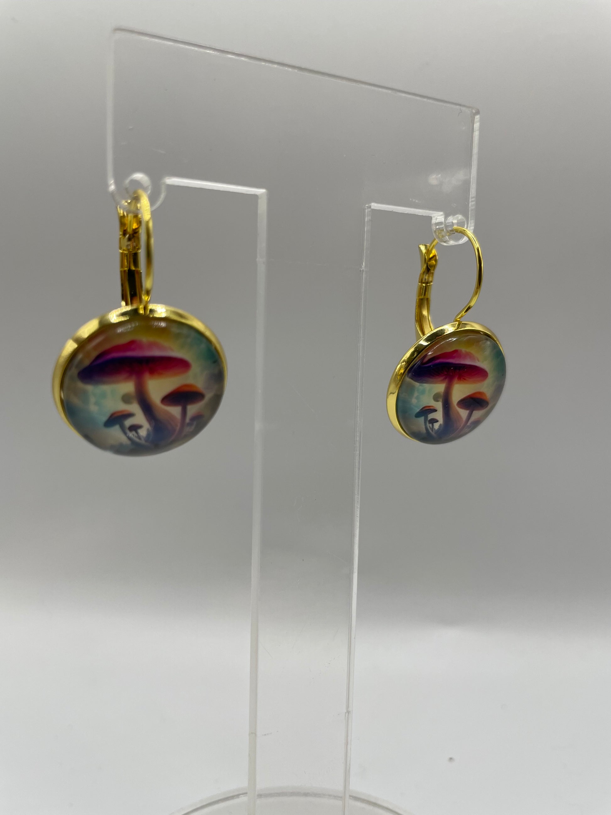 Apportez une touche de fantaisie à votre style avec ces boucles d’oreilles Champignons dorés, ornées d’un motif artistique représentant des champignons lumineux dans des tons de violet, bleu et doré.