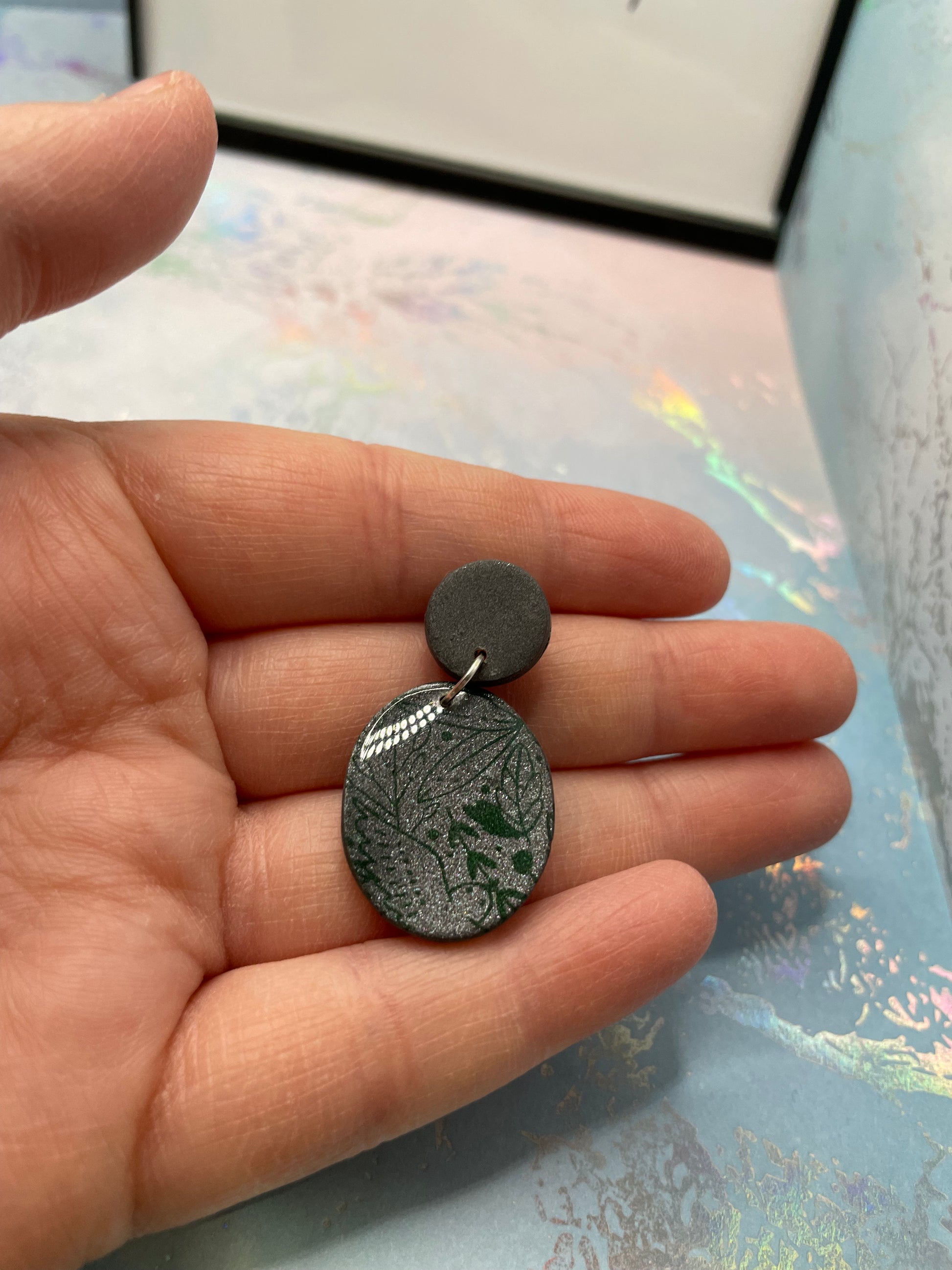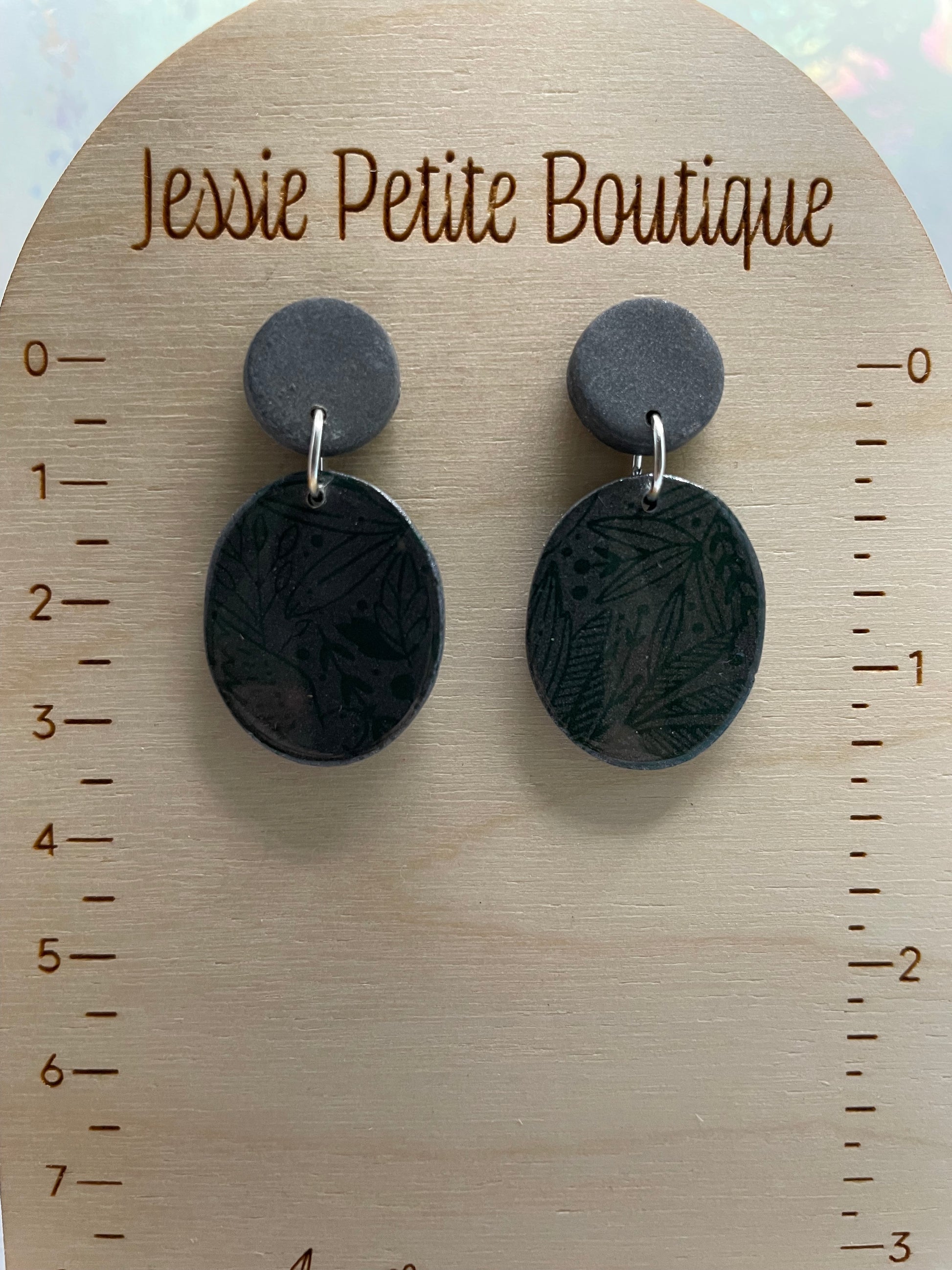 Adoptez l'élégance avec ces boucles d'oreilles ovales à foliage vert sur argile grise . Ornées d'un délicat motif floral vert sur une base élégante en argile polymère grise, ces boucles d'oreilles apportent une touche unique et artistique à vos bijoux. Fabriquées avec soin, elles sont sans nickel , ce qui les rend idéales pour les peaux sensibles.