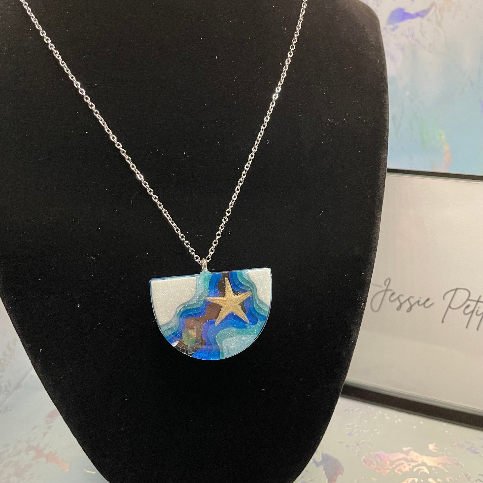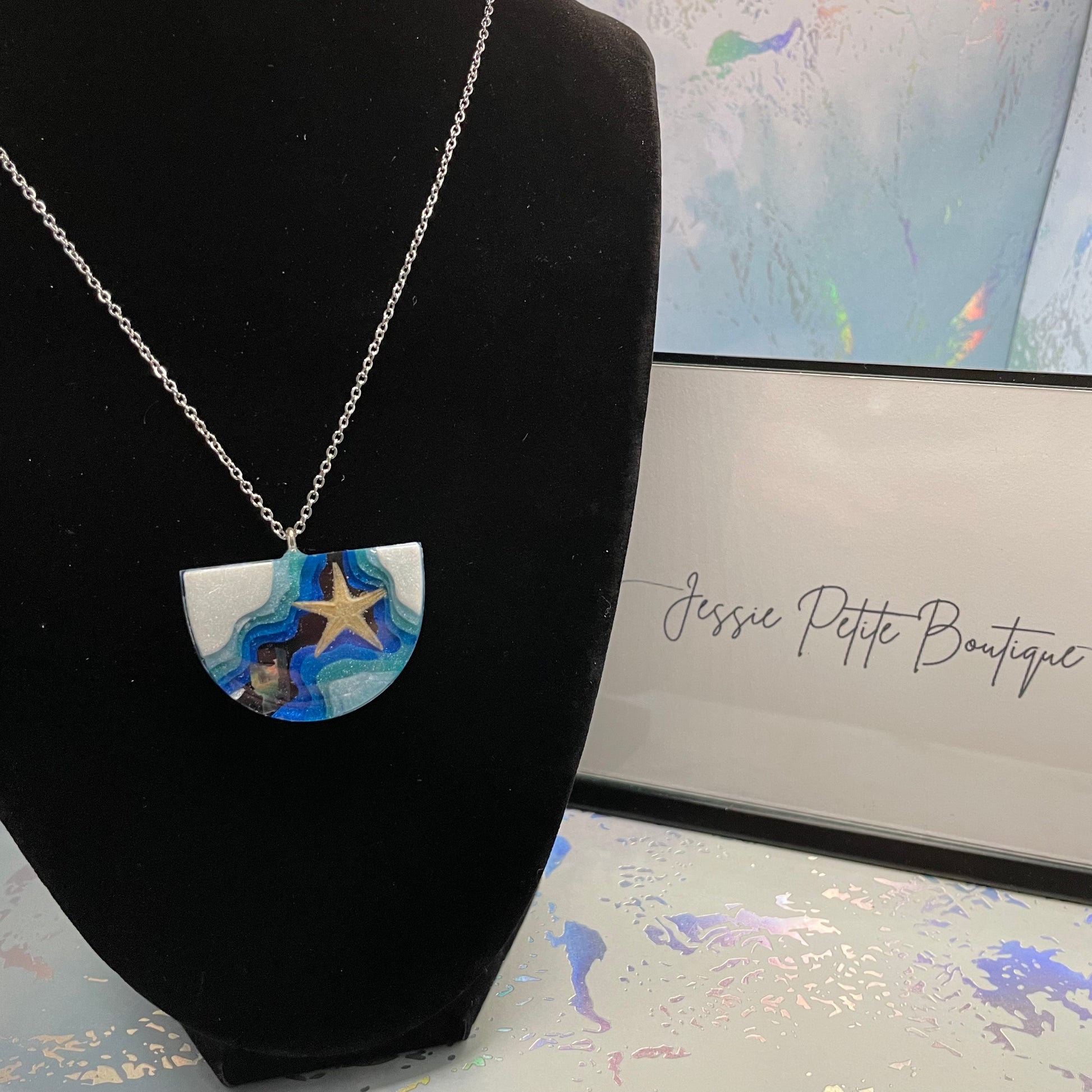 - Couleur : Le pendentif mélange des nuances apaisantes de bleu, de blanc et de clair, avec des détails complexes qui évoquent l'essence de la mer, complétés par un accent d'étoile de mer et de coquillage.