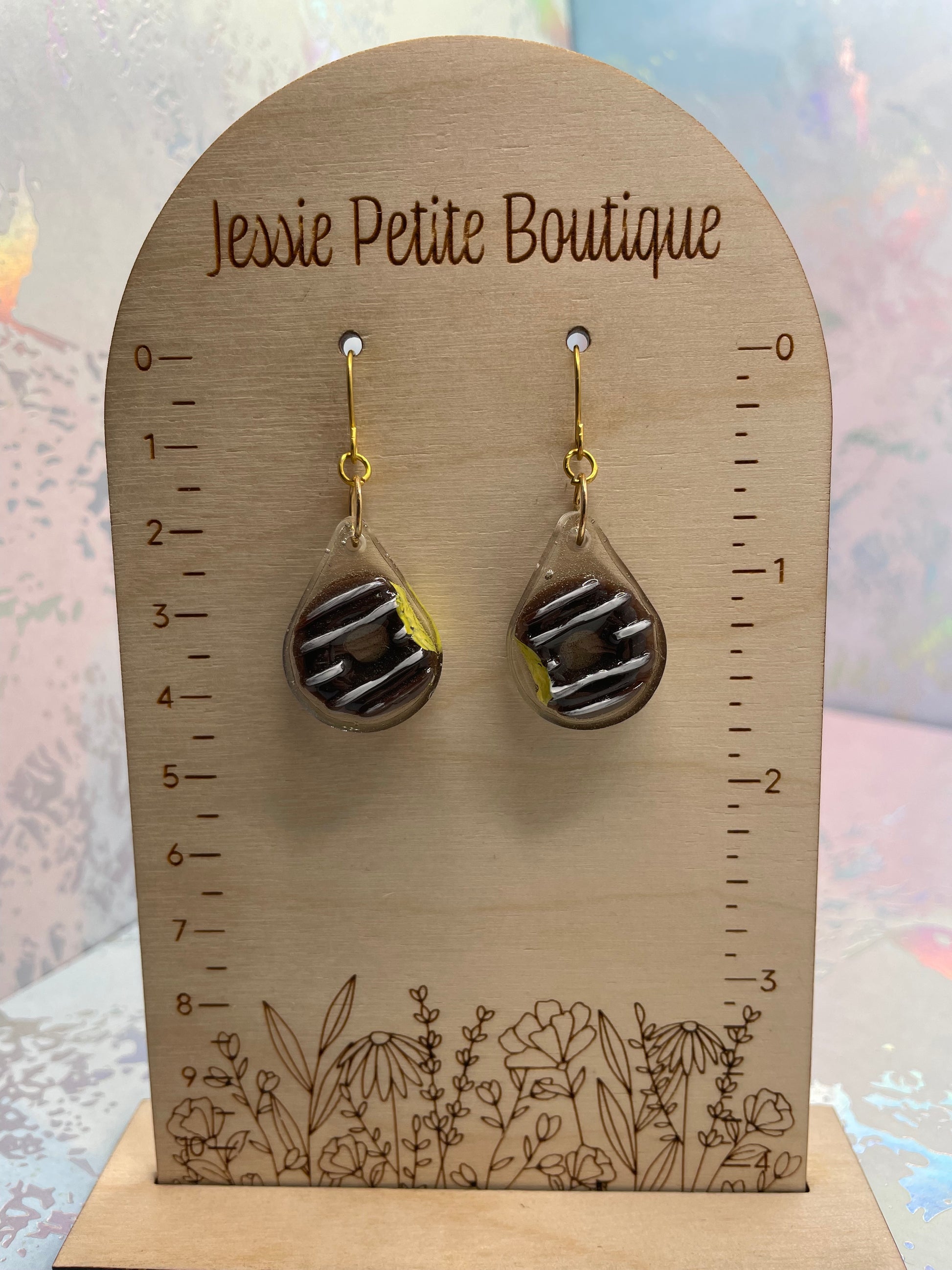 Ajoutez une touche unique à votre collection de bijoux avec ces boucles d'oreilles pendantes en forme de goutte . Composées d'une superbe combinaison de résine transparente, ces boucles d'oreilles présentent une forme de goutte unique avec un accent de donut en plastique.