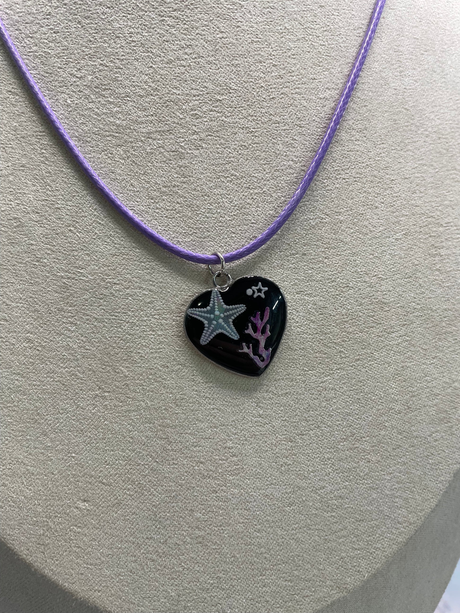Ce collier délicat est orné d’un pendentif en forme de cœur mesurant 2 cm x 1,9 cm, réalisé en résine et poudre mica qui apporte une touche de brillance et de profondeur. Le design met en valeur de jolis détails d’inspiration marine, avec une étoile de mer et un motif de corail, délicatement contrastés sur un fond foncé et lustré.