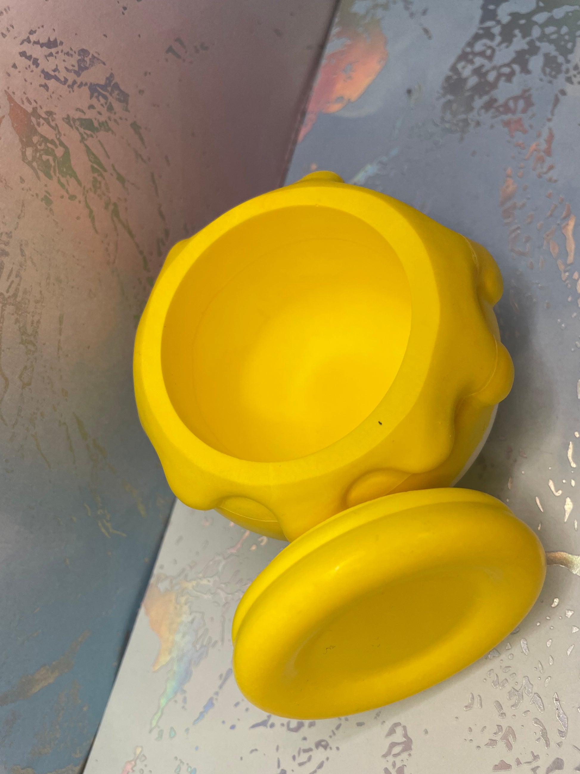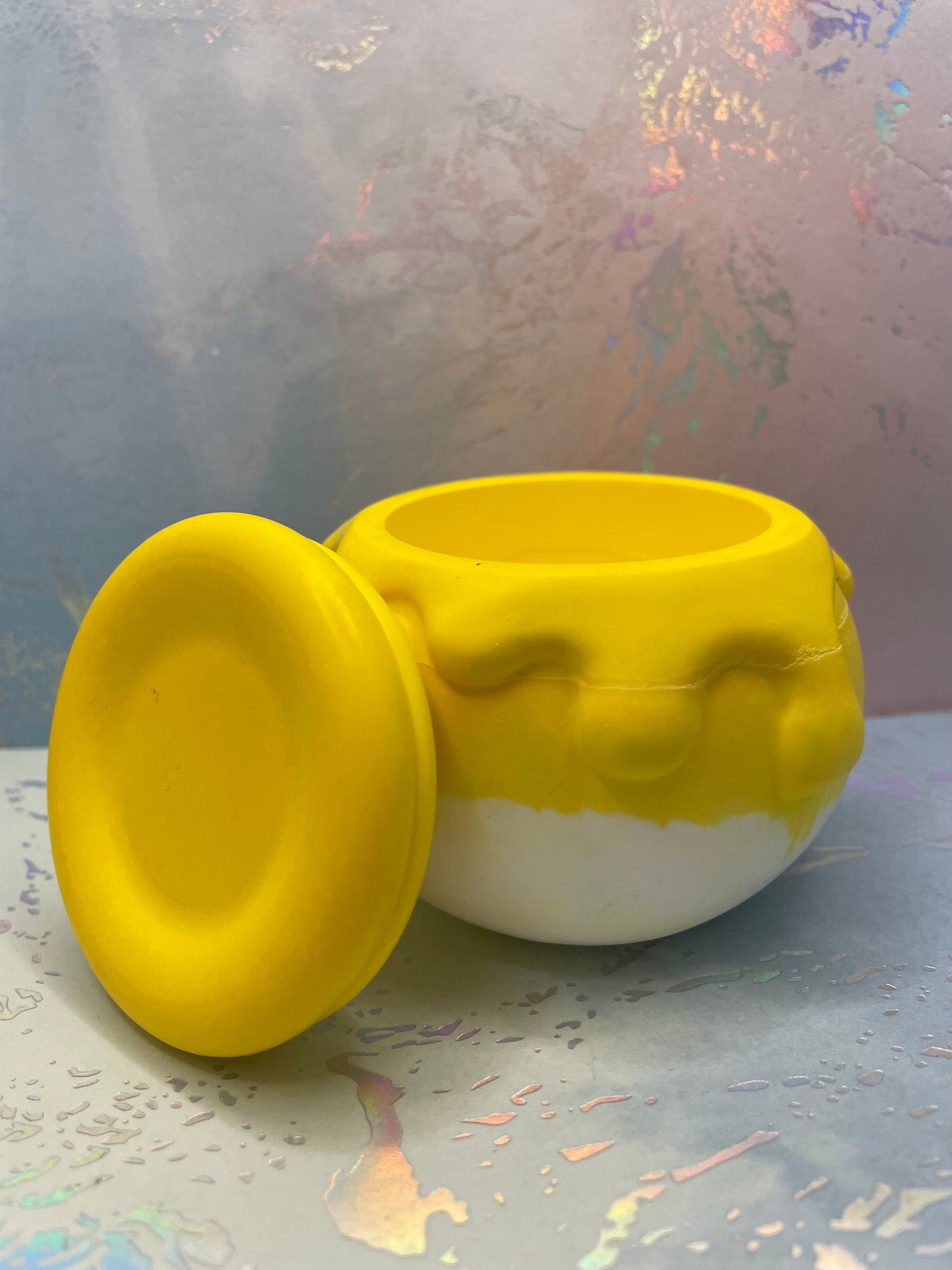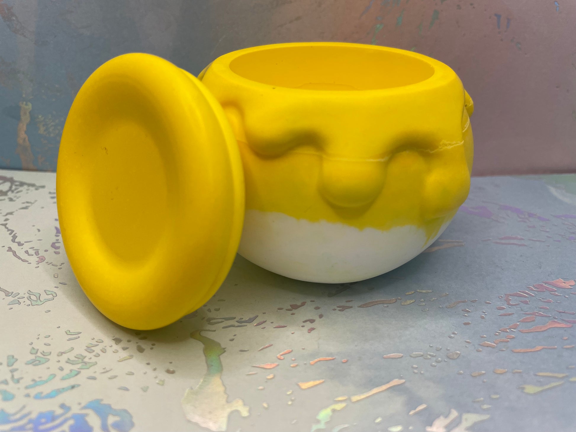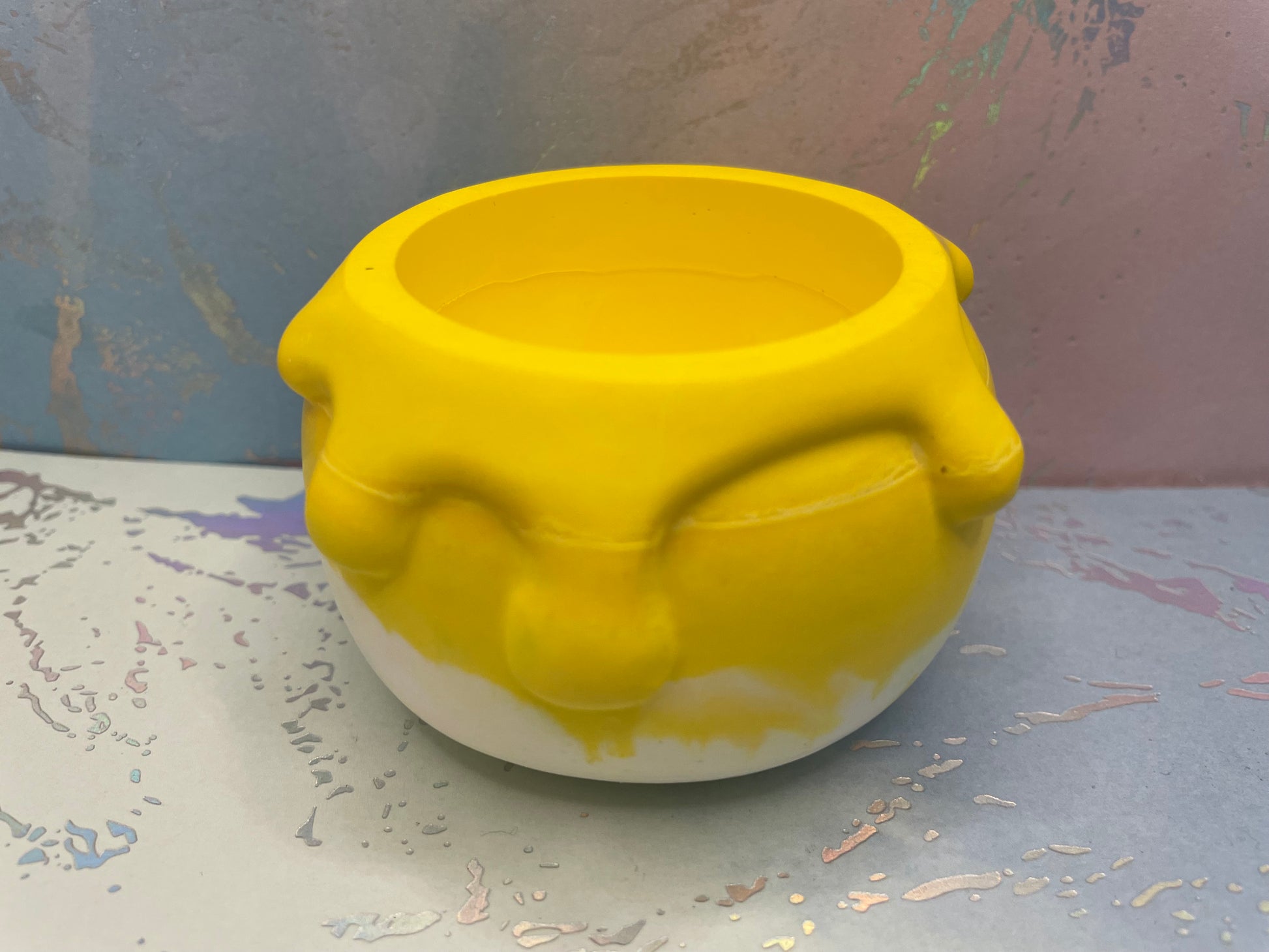 Ce contenant en éco-résine fait à la main se distingue par son design inspiré des coulures et son contraste lumineux entre le jaune éclatant et le blanc doux. Sa forme arrondie et sa finition lisse lui donnent une allure à la fois moderne et ludique.