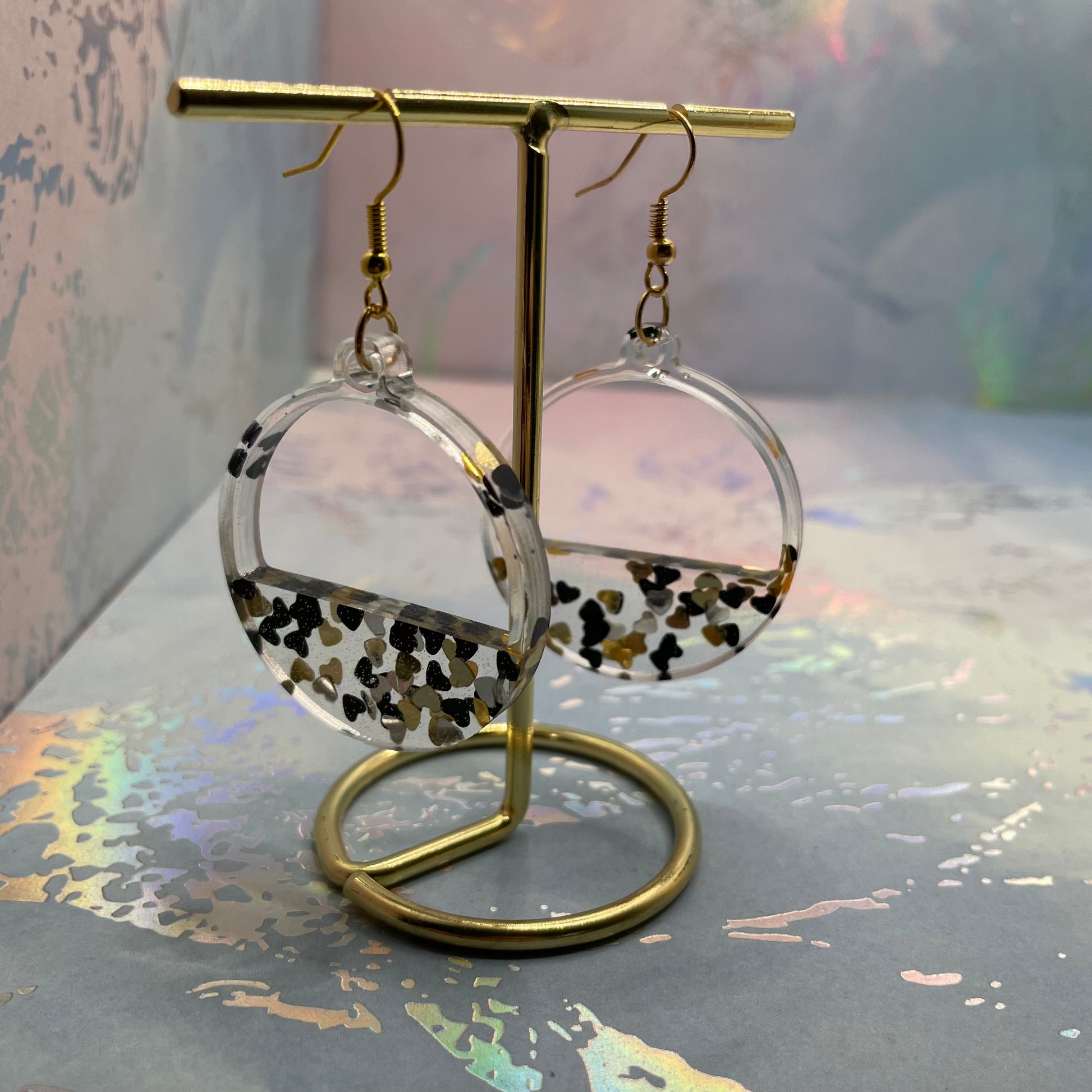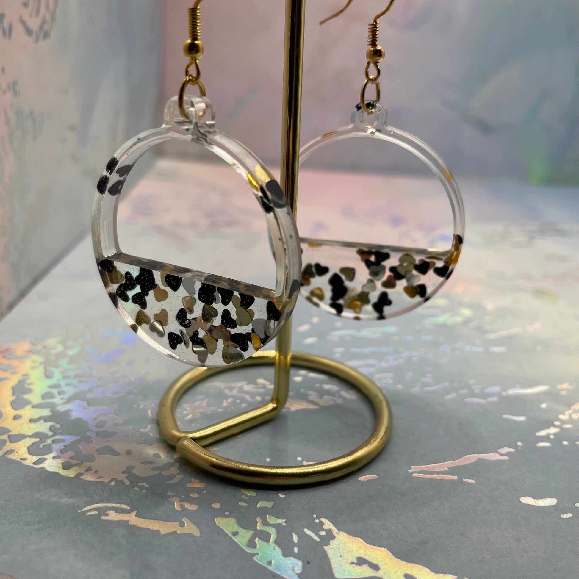 Célébrez l'amour et l'élégance avec ces boucles d'oreilles cœurs flottants . Dotées d'un design unique en demi-cercle, ces boucles d'oreilles mettent en valeur des paillettes dorées et noires en forme de cœur flottant dans la résine transparente, créant un effet visuel saisissant. Suspendues à des crochets confortables, elles sont légères et parfaites pour ajouter une touche de sophistication à n'importe quelle tenue.