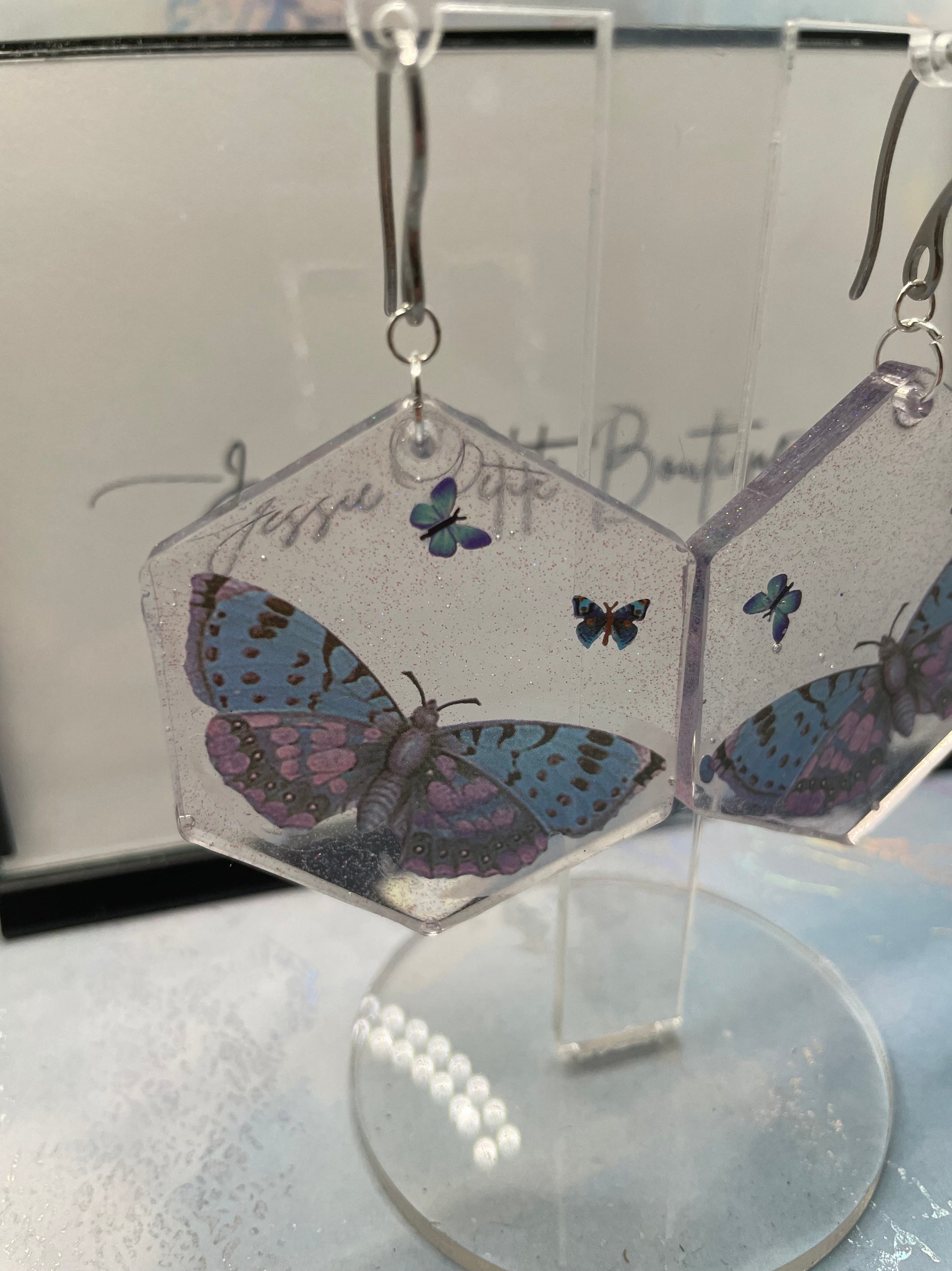 Boucle d'oreille papillon dans gros hexagon scintillant – Acier inoxydable