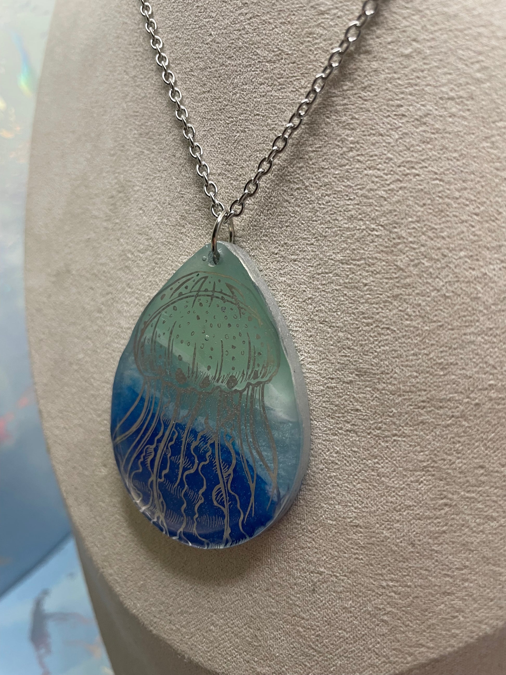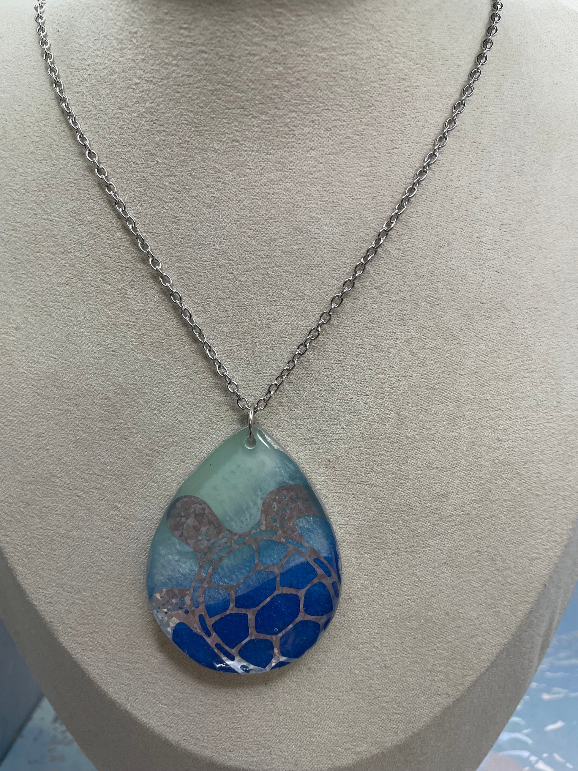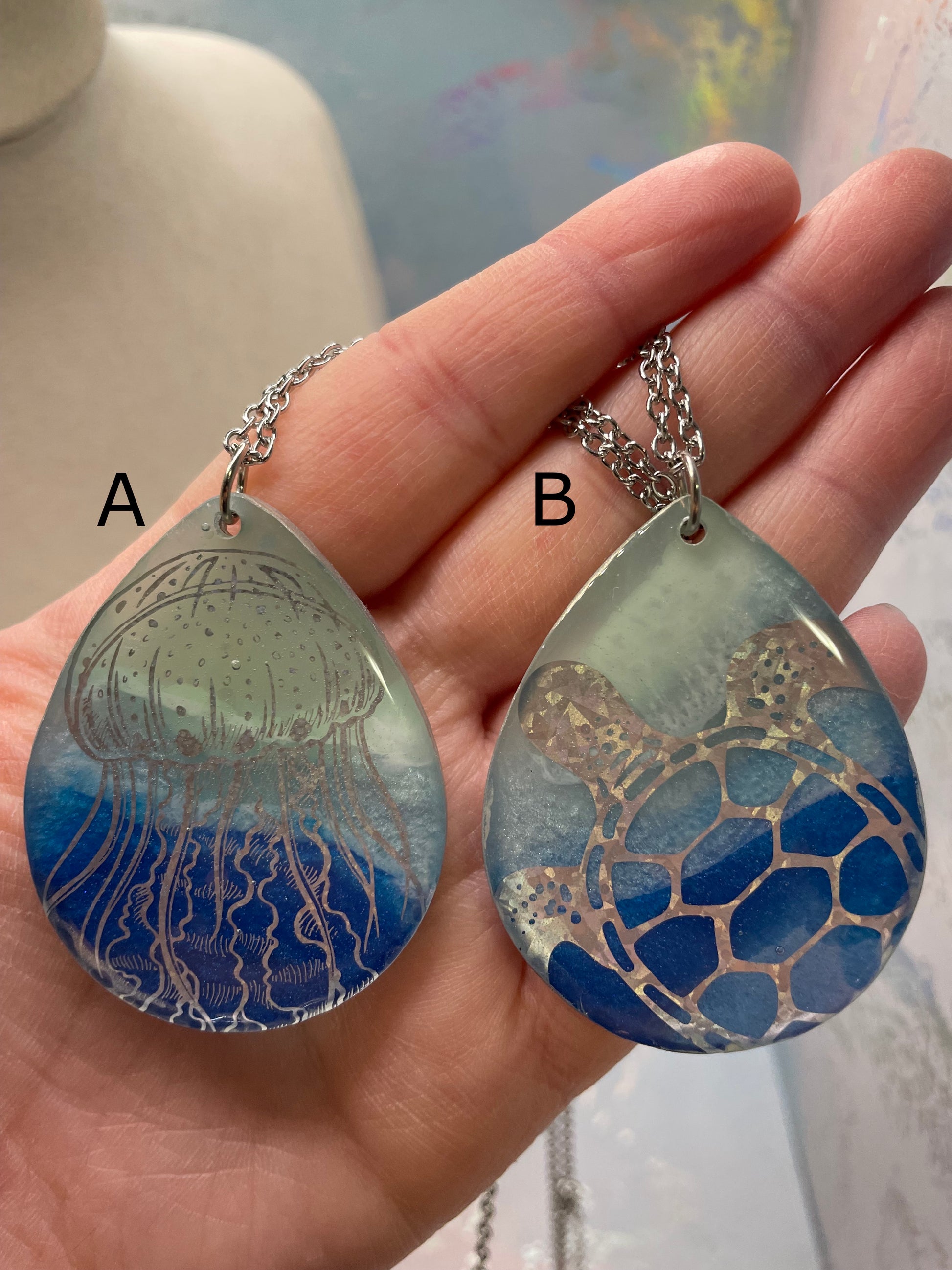 Ce collier audacieux met en valeur un grand pendentif en forme de goutte inspiré de l’univers marin, offert en deux modèles distincts. Chaque pendentif présente des dégradés de bleu océan et de vert d’eau, rehaussés d’un léger effet brillant grâce à la poudre de mica et de fins détails à l’encre. Le contour argenté apporte une finition élégante et met en valeur la profondeur du motif.