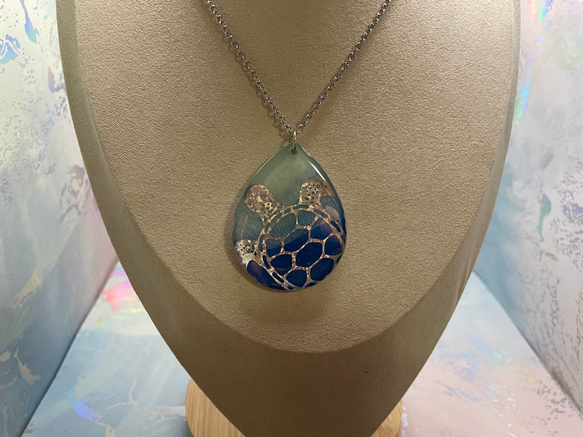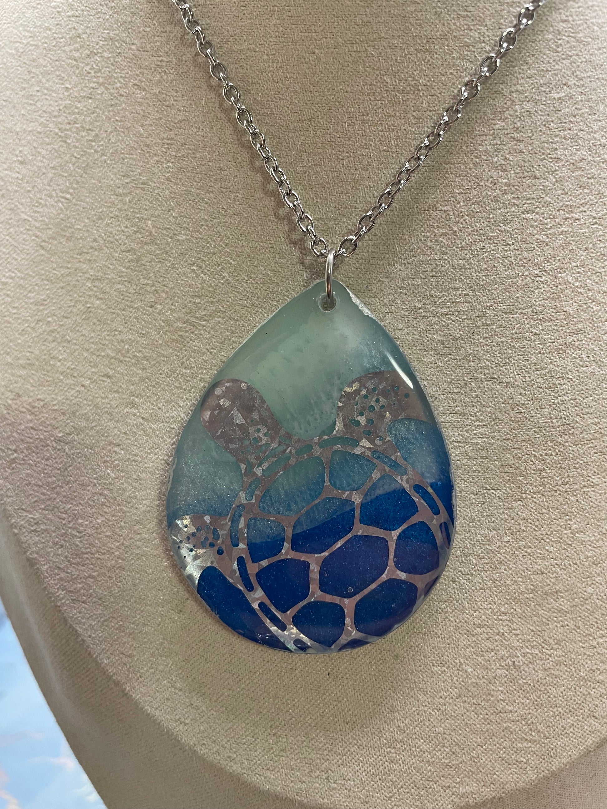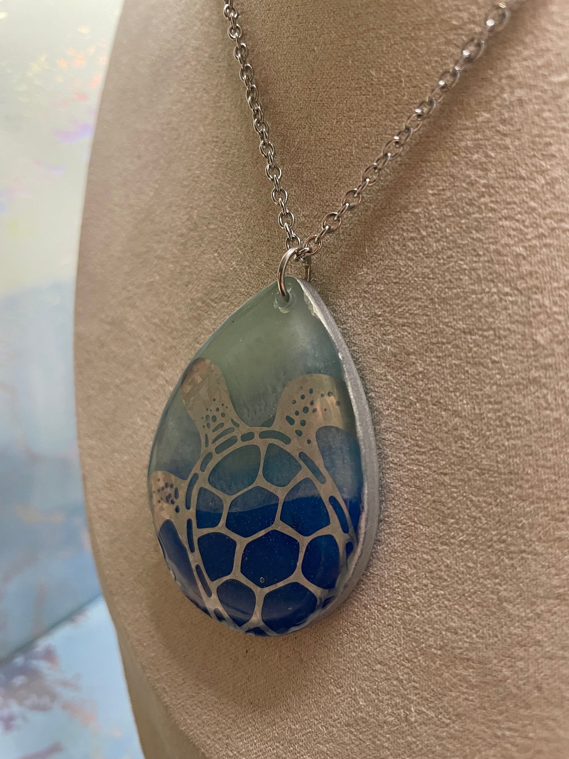 Ce collier audacieux met en valeur un grand pendentif en forme de goutte inspiré de l’univers marin, offert en deux modèles distincts. Chaque pendentif présente des dégradés de bleu océan et de vert d’eau, rehaussés d’un léger effet brillant grâce à la poudre de mica et de fins détails à l’encre. Le contour argenté apporte une finition élégante et met en valeur la profondeur du motif.
