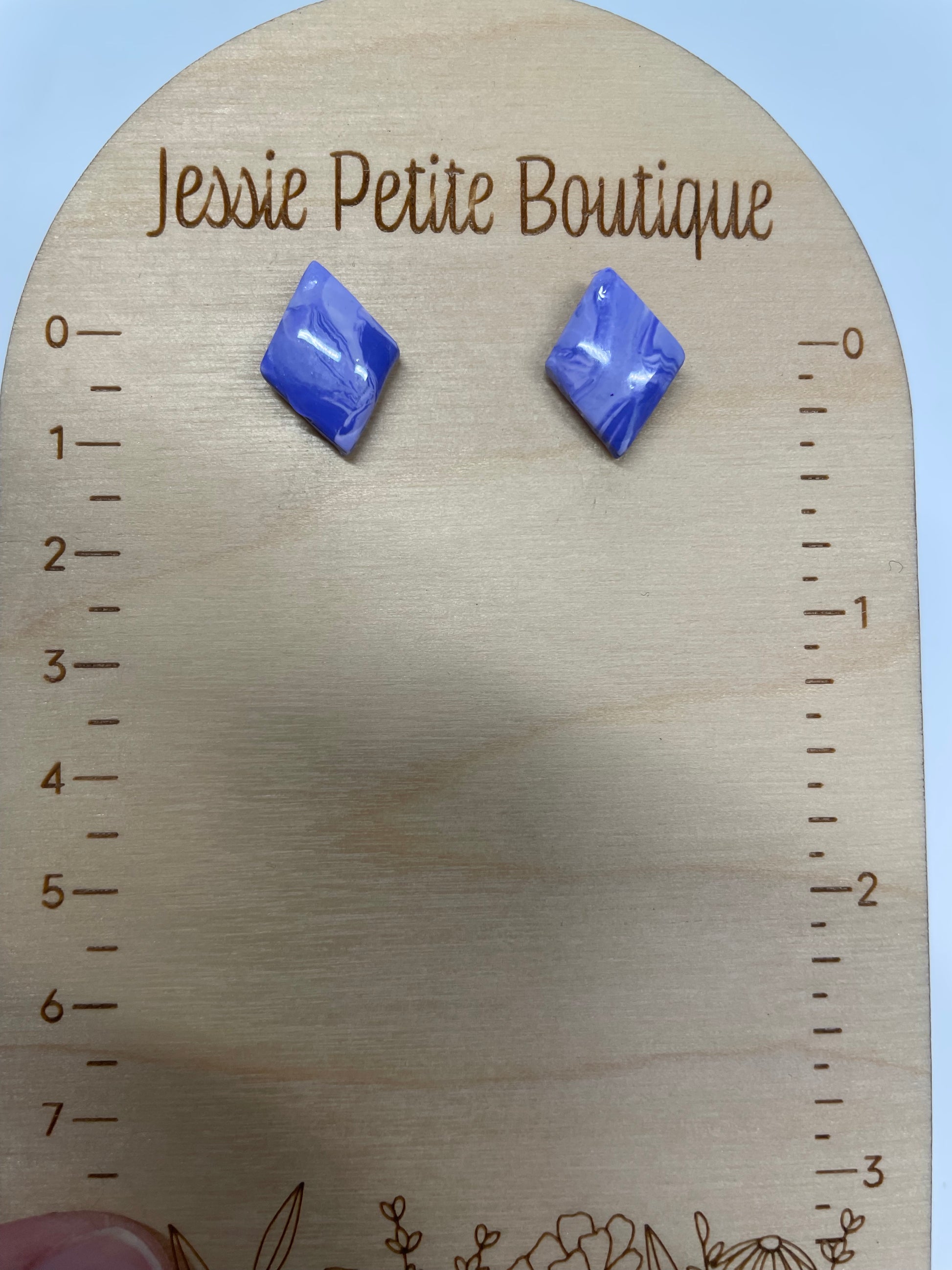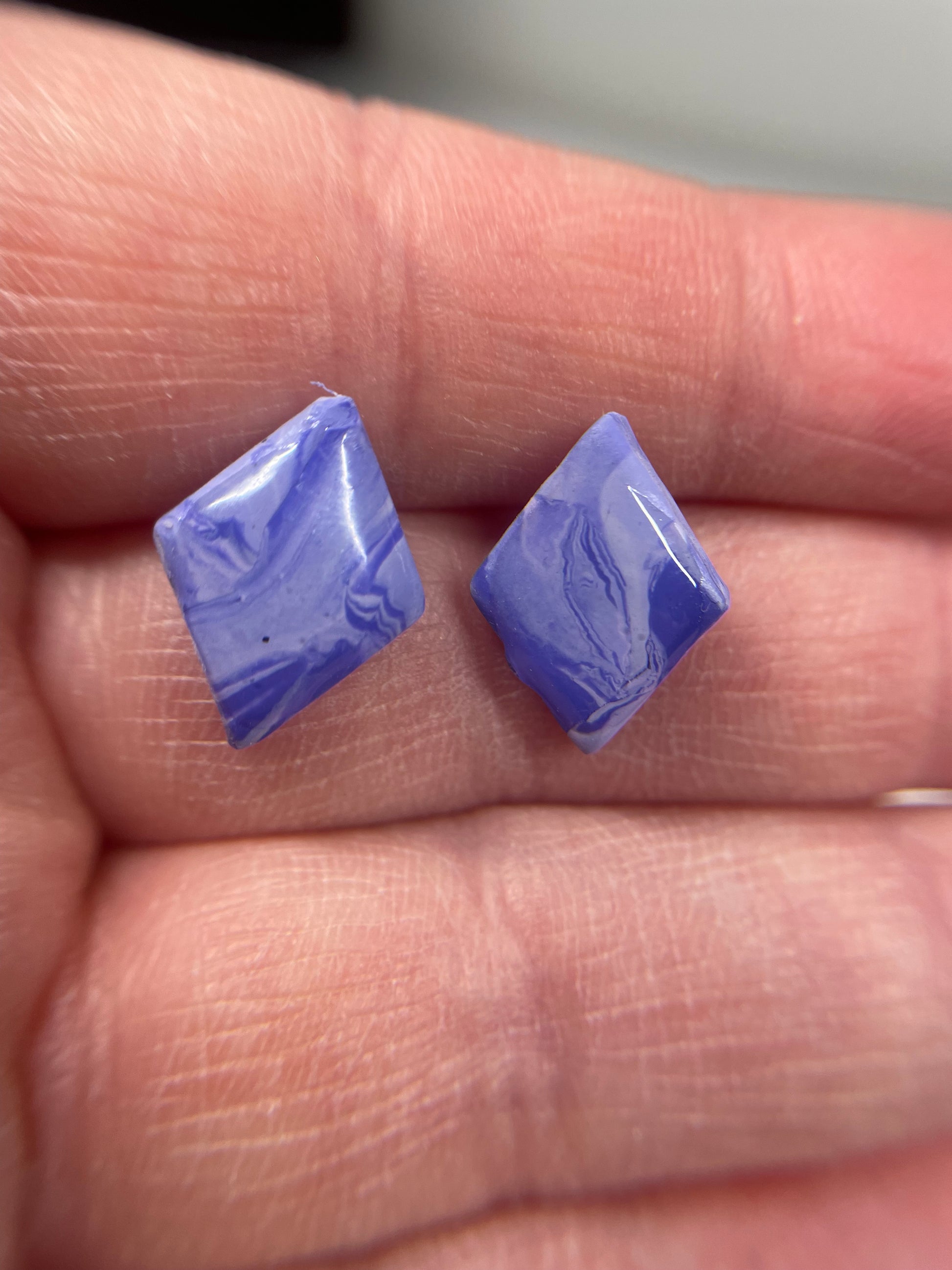 Ces boutons d’oreille en forme de losange présentent un délicat effet marbré dans des tons de bleu et de mauve, créant un motif fluide et organique. Réalisés en résine et en argile polymère, chaque bouton d’oreille possède de légères variations naturelles, rendant chaque paire unique.