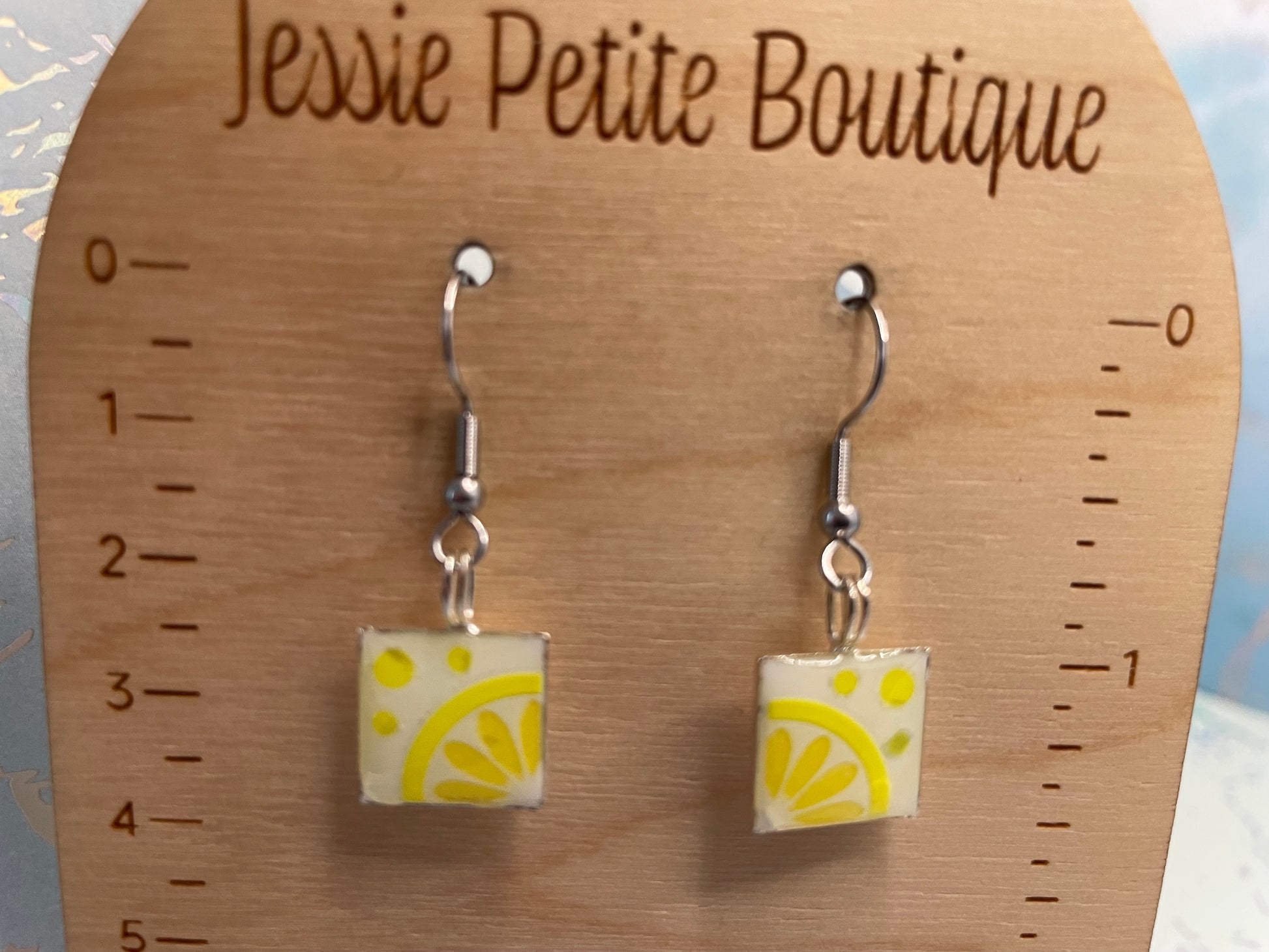 Fraîches et pleines de charme, ces boucles d’oreilles carrées en résine présentent un fond blanc lumineux rehaussé de motifs inspirés des agrumes. Offertes en deux options de couleur—jaune citron ou vert lime—elles ajoutent une touche estivale et joyeuse tout en restant légères et confortables. Montées sur des crochets en acier inoxydable, elles sont idéales pour un port quotidien.