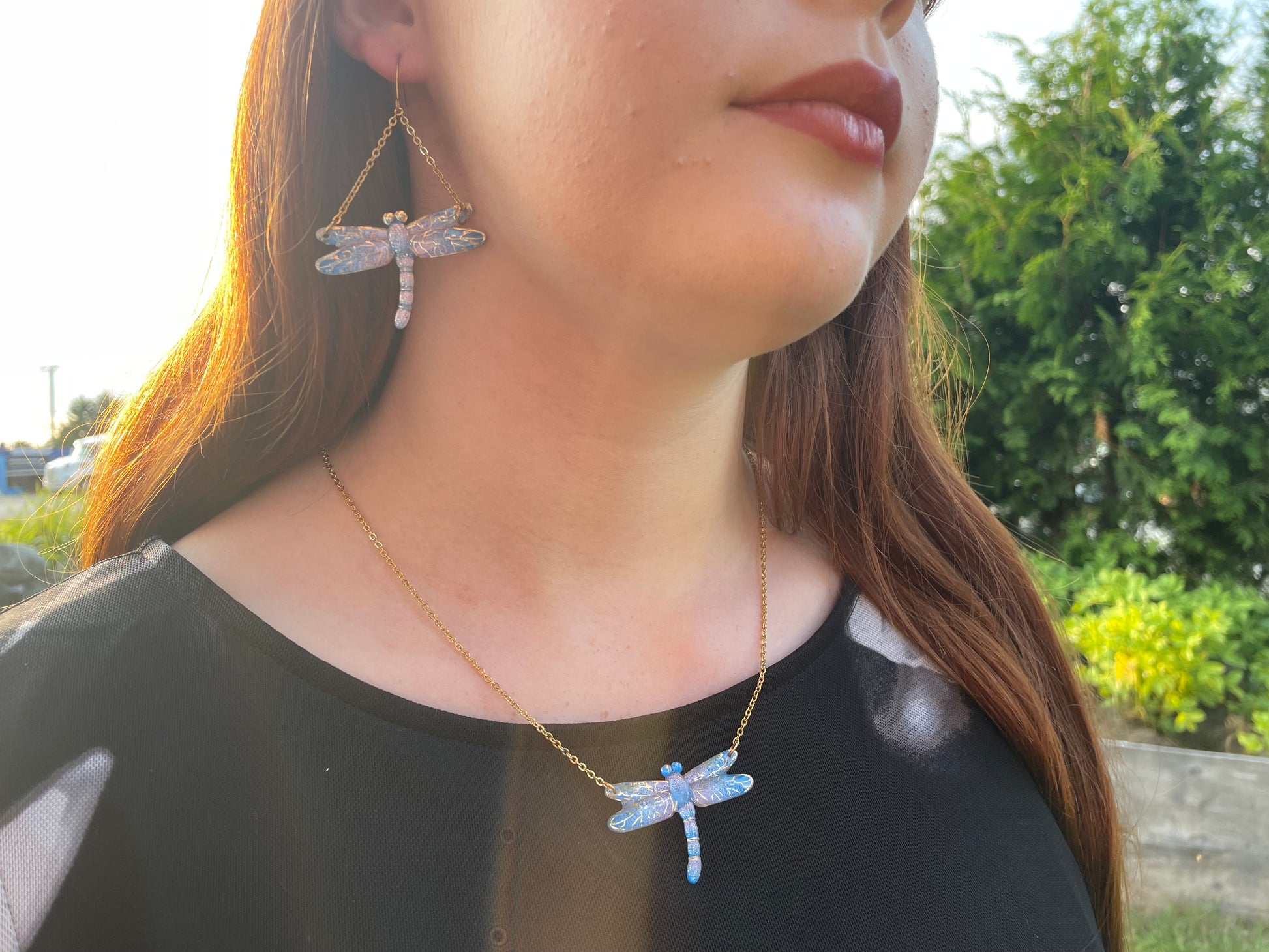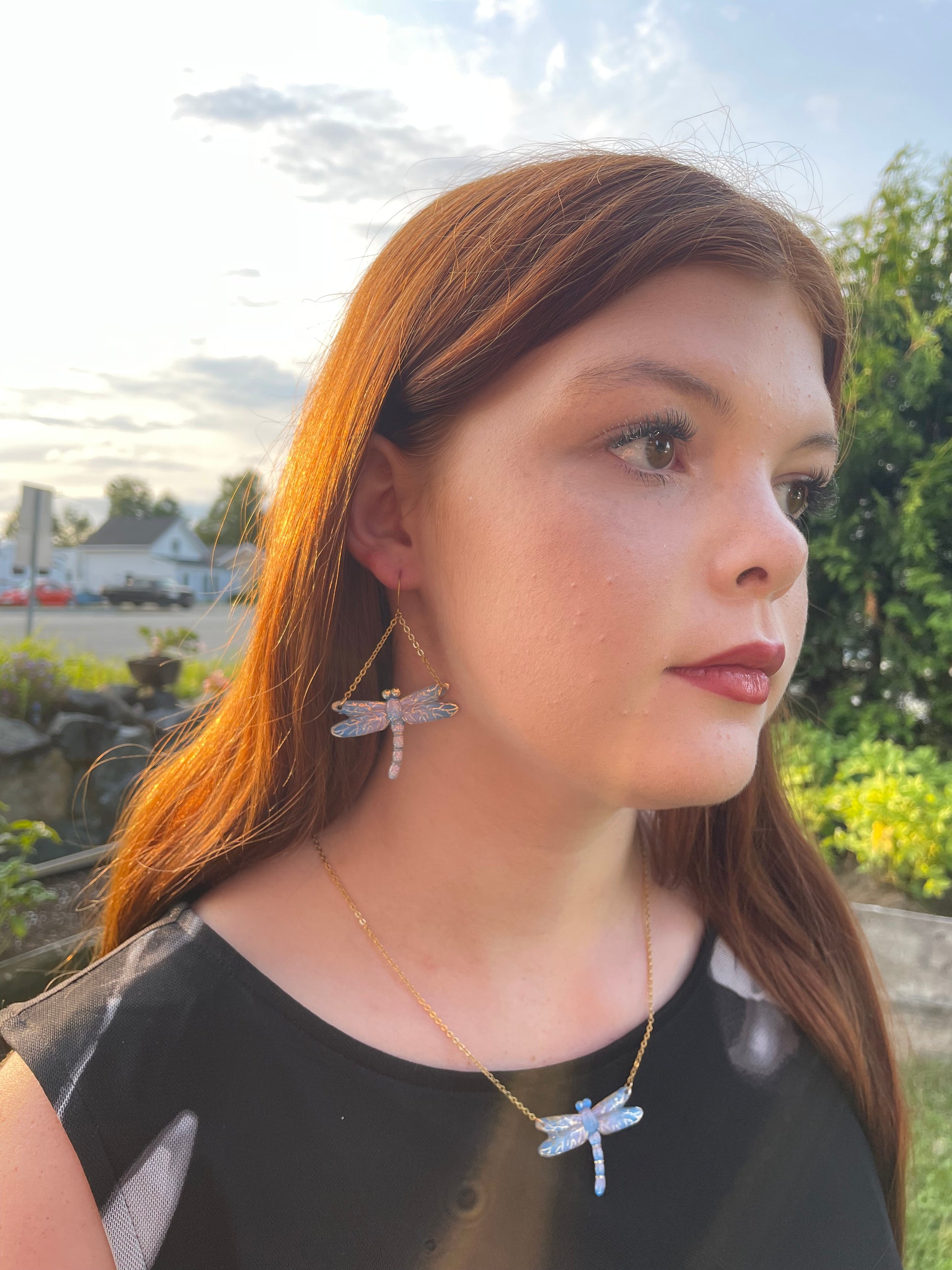 Ces libellules brillent avec des tons de bleus et de délicats détails dorés , capturant la magie des soirées chaudes et la légèreté de la nature. Que vous vous habilliez pour une soirée ou que vous voulez ajouter une pièce unique à votre look, cet ensemble vous fera sentir radieuse et unique.