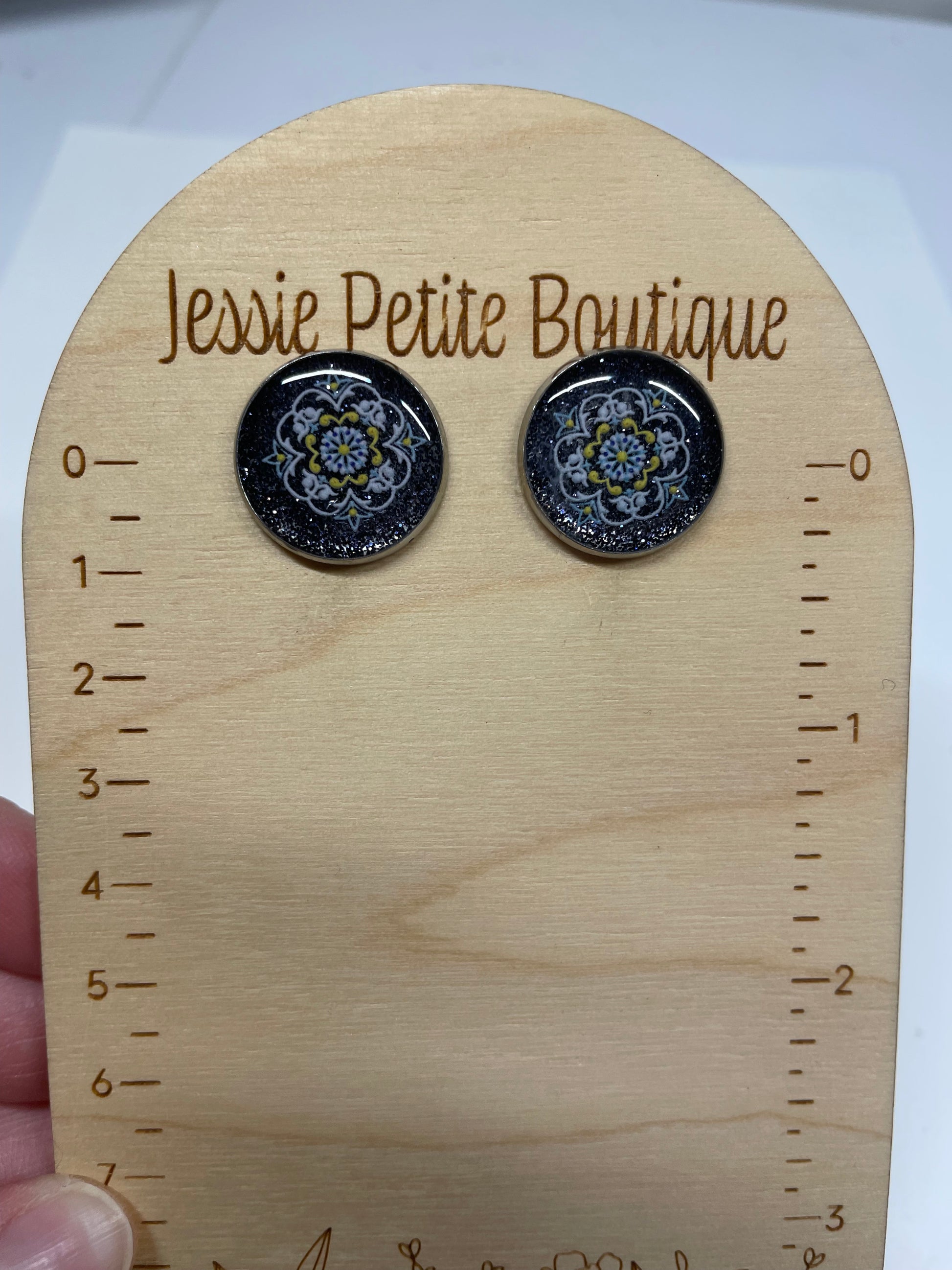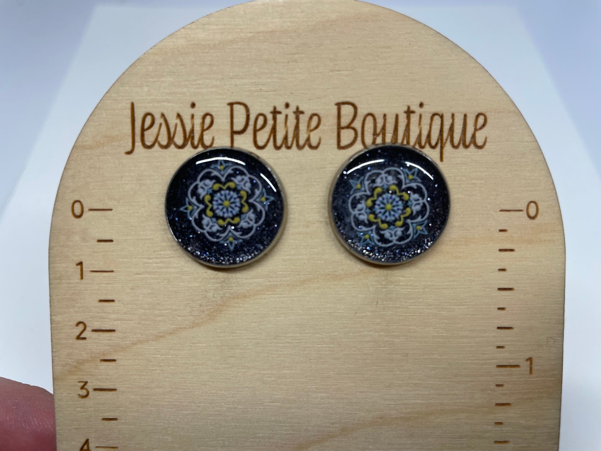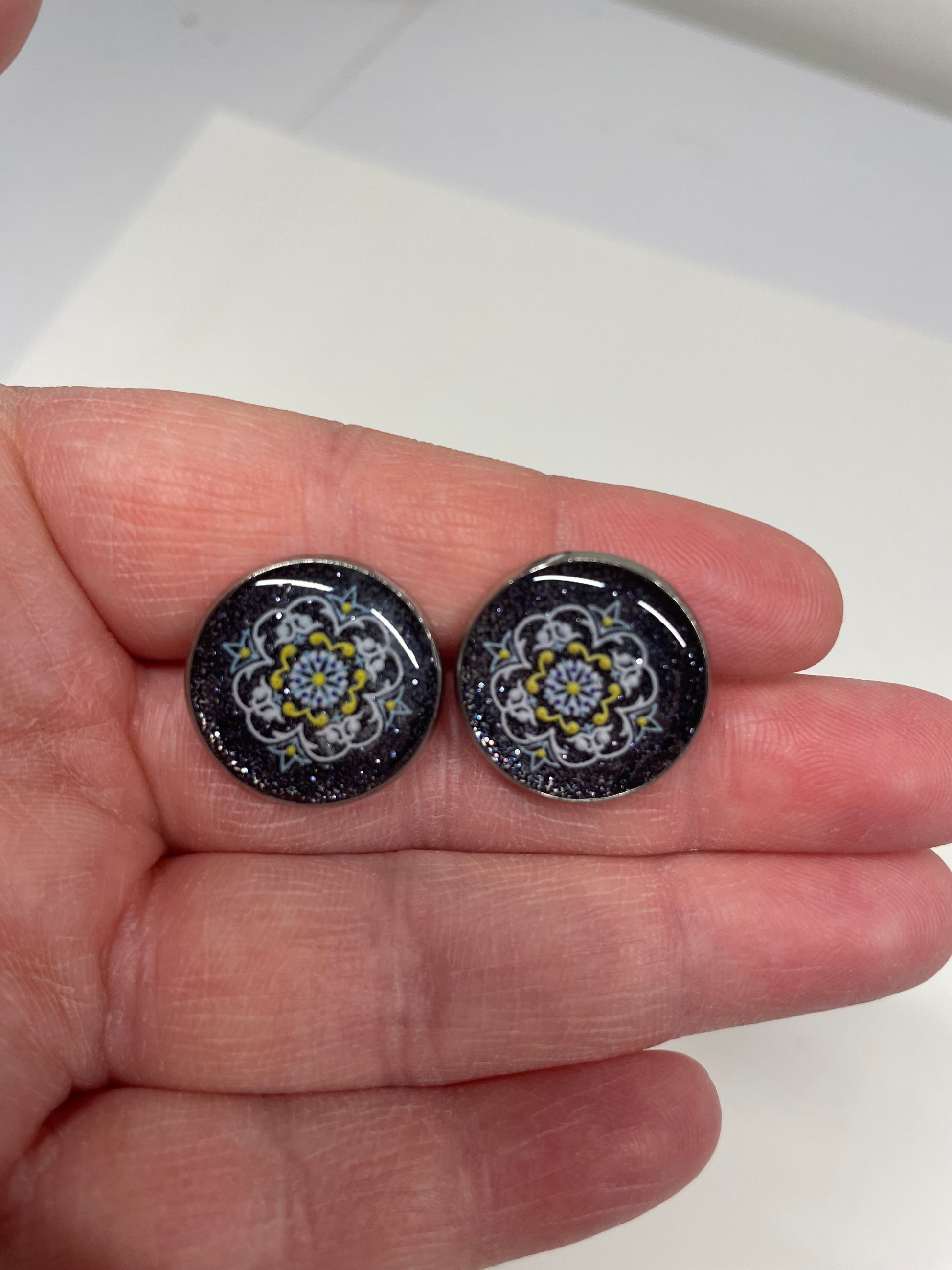 Ces boutons d’oreille inspirés de mandalas présentent un motif symétrique détaillé sur un fond foncé profond. Des touches subtiles de paillettes et de poudre de mica apportent un léger éclat, donnant de la profondeur et une finition lumineuse au design.