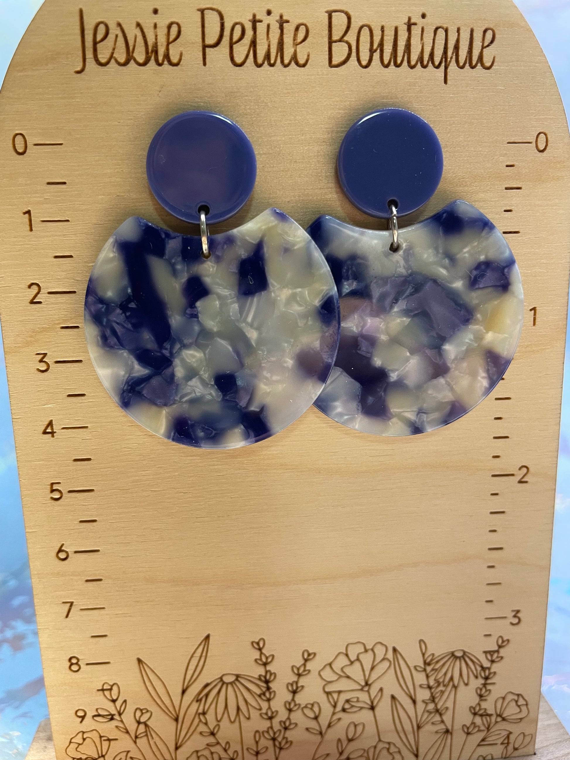 Ces boucles d’oreilles avec bouton d’oreille présentent une silhouette ronde audacieuse, mise en valeur par un motif marbré mêlant des tons de bleu marine profond, de mauve doux et de crème translucide. Leur fini lisse en acrylique leur confère une allure moderne et soignée, tandis que le marbrage organique rend chaque paire unique.