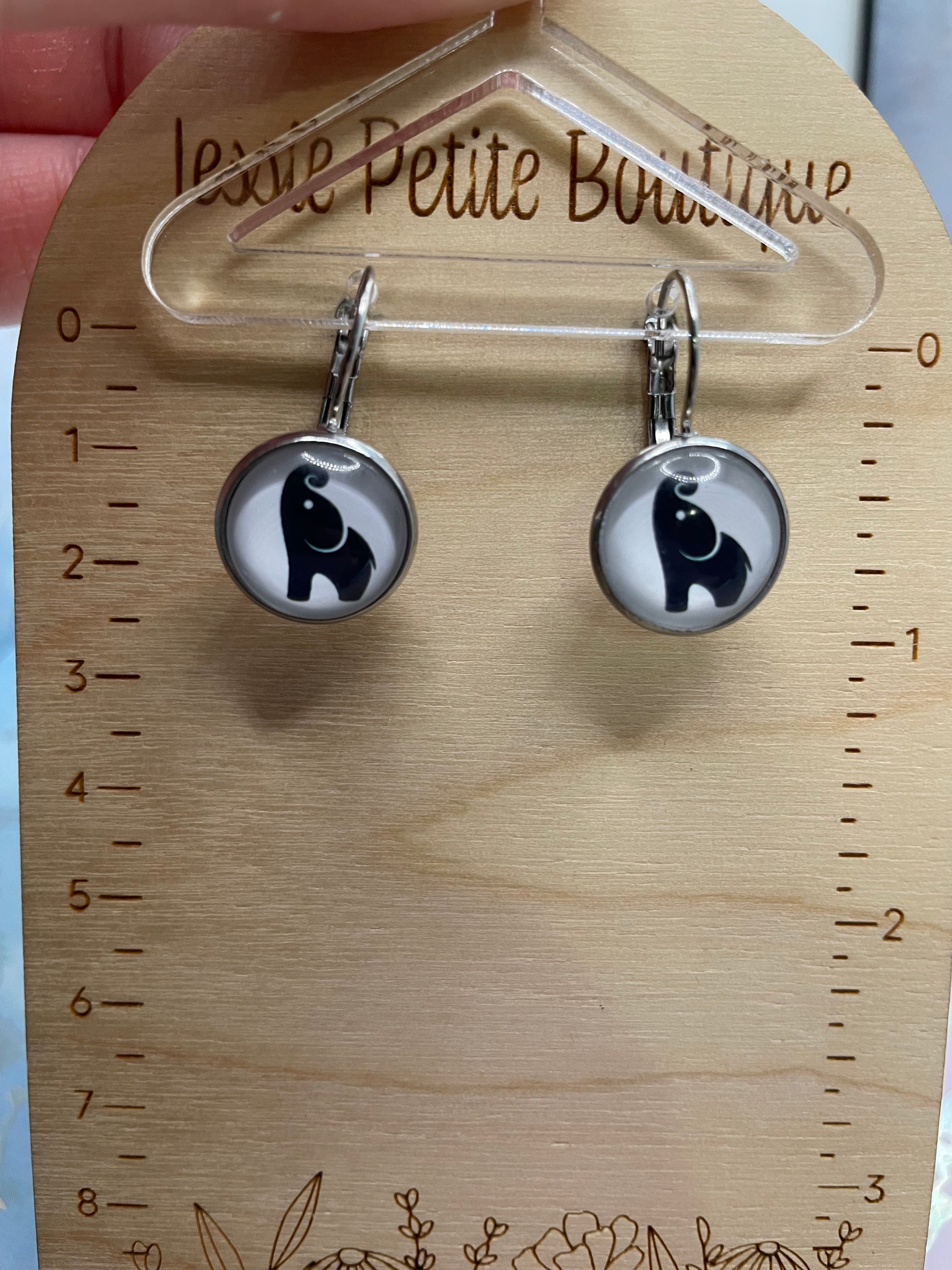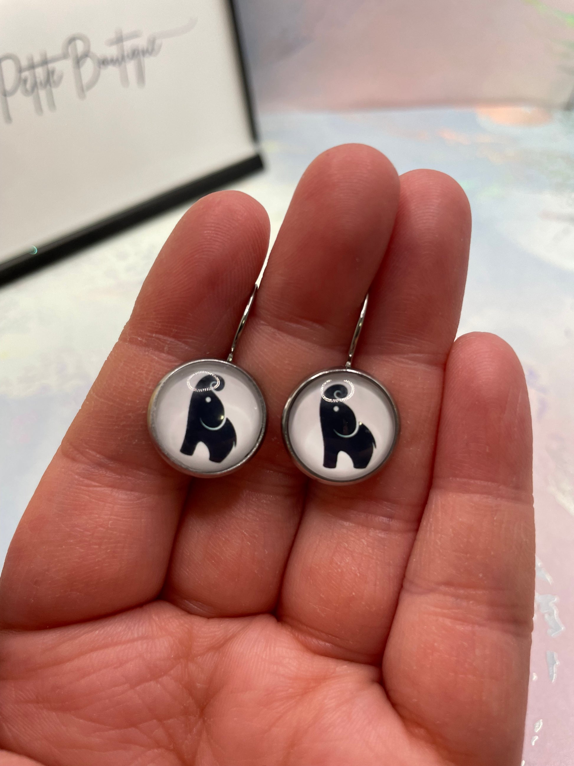Ces boucles d’oreilles dormeuse minimaliste présentent une silhouette d’éléphant noire épurée sur un fond doux et neutre. Le cabochon en verre apporte une finition brillante et une belle profondeur au motif.