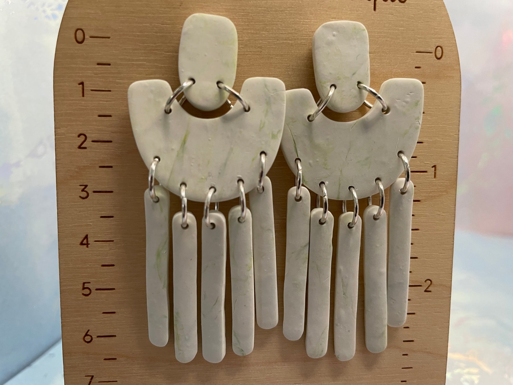 Les boucles d’oreilles Monique se distinguent par leur silhouette organique et leur design à franges délicates qui bougent avec élégance. Façonnées à la main en argile polymère, elles présentent un marbré vert pâle sur fond blanc, rehaussé de subtiles veinures naturelles pour un rendu doux et raffiné.