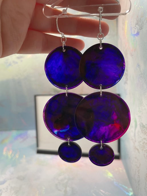 Rehaussez votre style avec Morgan, des boucles d'oreilles pendantes audacieuses et artistiques, faites en rouge foncé, mauve et bleu. Ces boucles d'oreilles accrocheuses sont faites de formes circulaires superposées qui cascadent de façon spectaculaire, créant un look saisissant grâce à leurs couleurs riches et profondes et à leur finition en résine lisse.