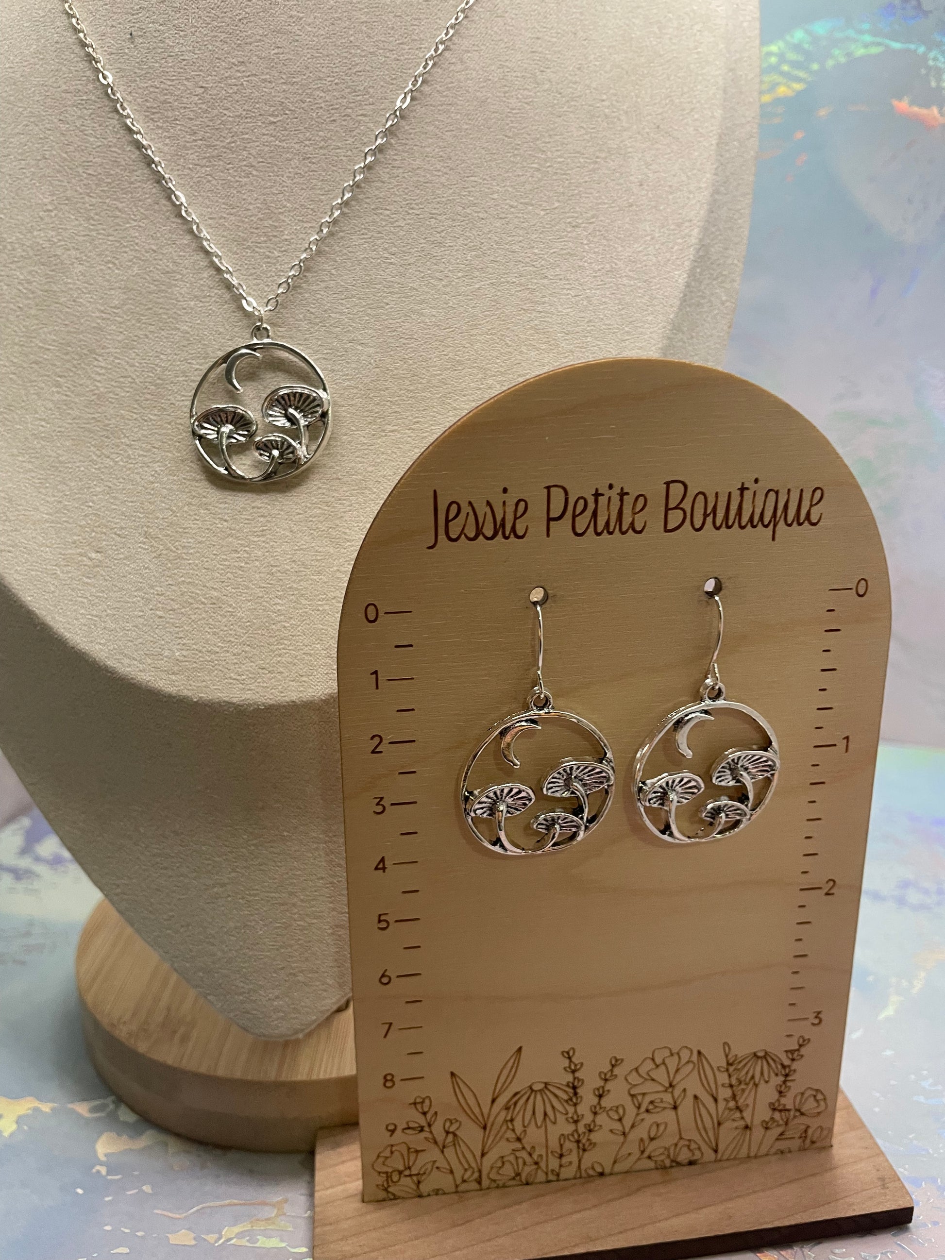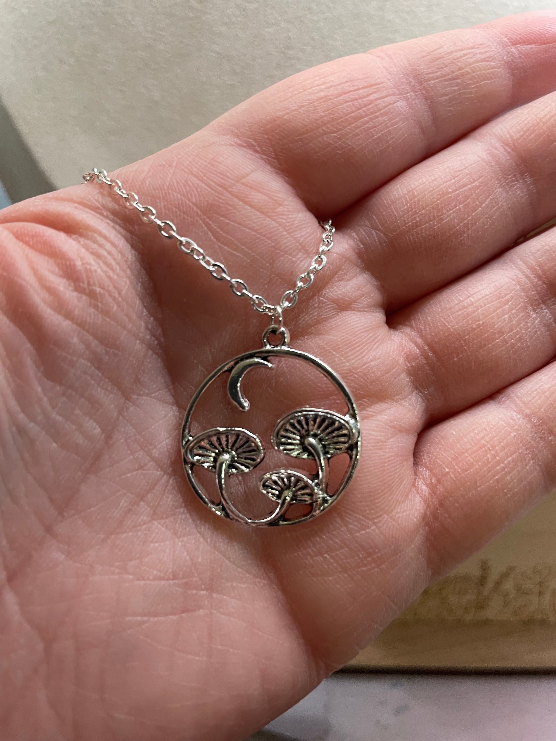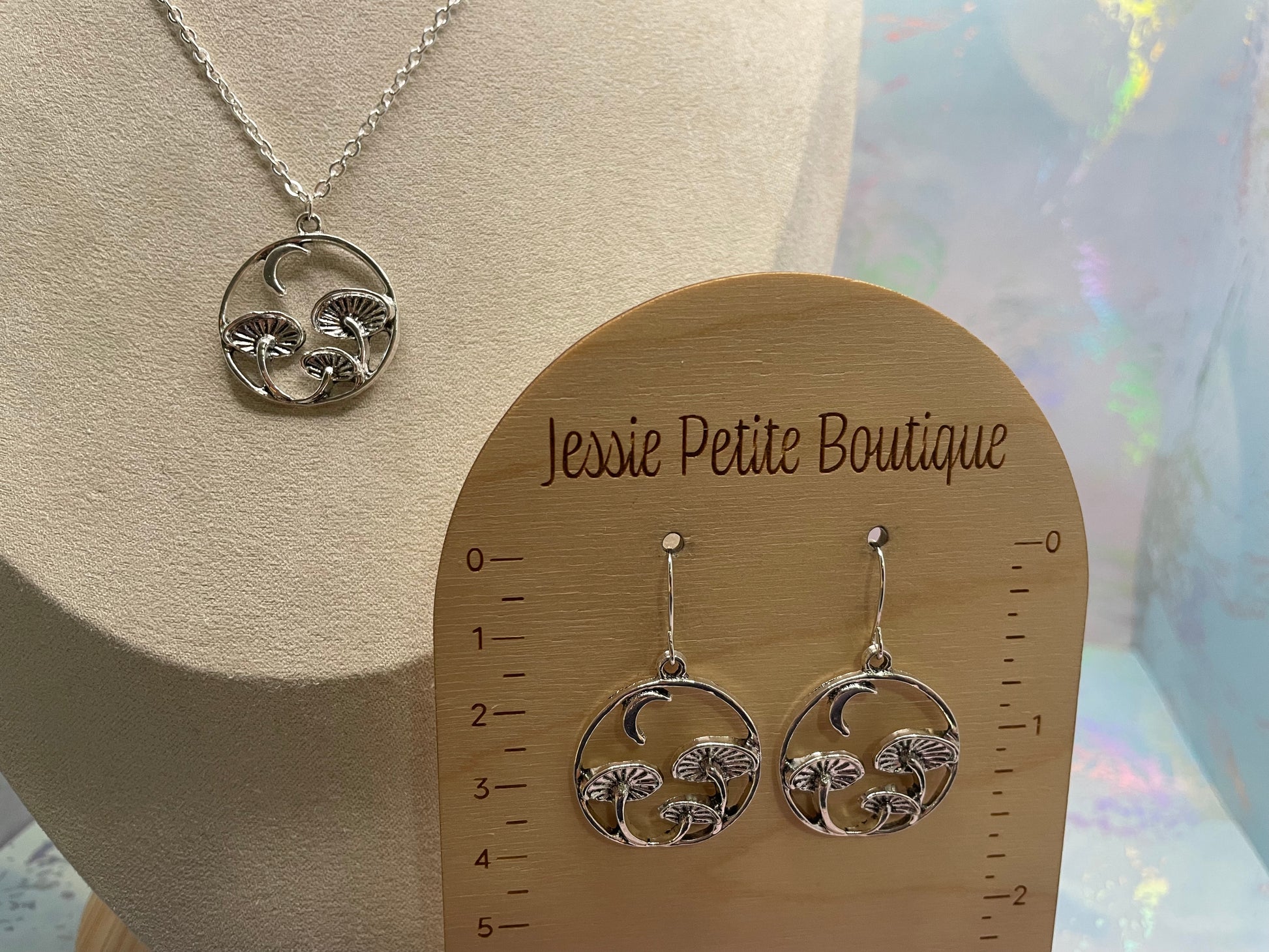 Cet ensemble délicat met en valeur un pendentif circulaire orné de champignons sculptés et d’un croissant de lune, offrant un design à la fois poétique et élégant. La finition argentée fait ressortir les détails tout en conservant une allure légère et facile à porter.