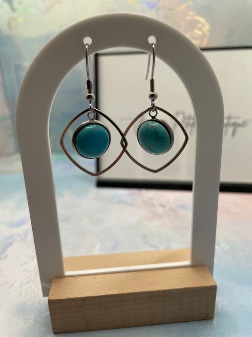 Admirez la beauté de la turquoise naturelle avec ces magnifiques boucles d'oreilles pendantes, disponibles en cinq formes uniques : étoile, cercle, goutte, hexagone et carré arrondi. Chaque modèle est orné de véritables turquoises serties sur de l'acier inoxydable argenté, garantissant durabilité et confort. La turquoise naturelle est fixée à la résine, ajoutant une touche délicate et sophistiquée à ces boucles d'oreilles polyvalentes.