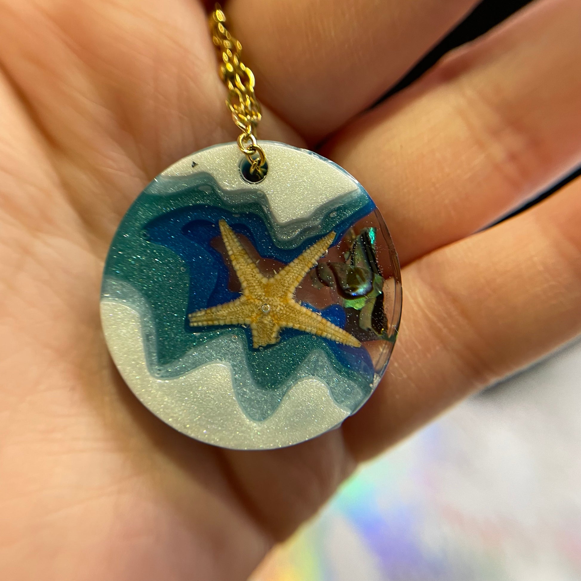 - Matière : Résine, poudre de mica, coquillage, étoile de mer