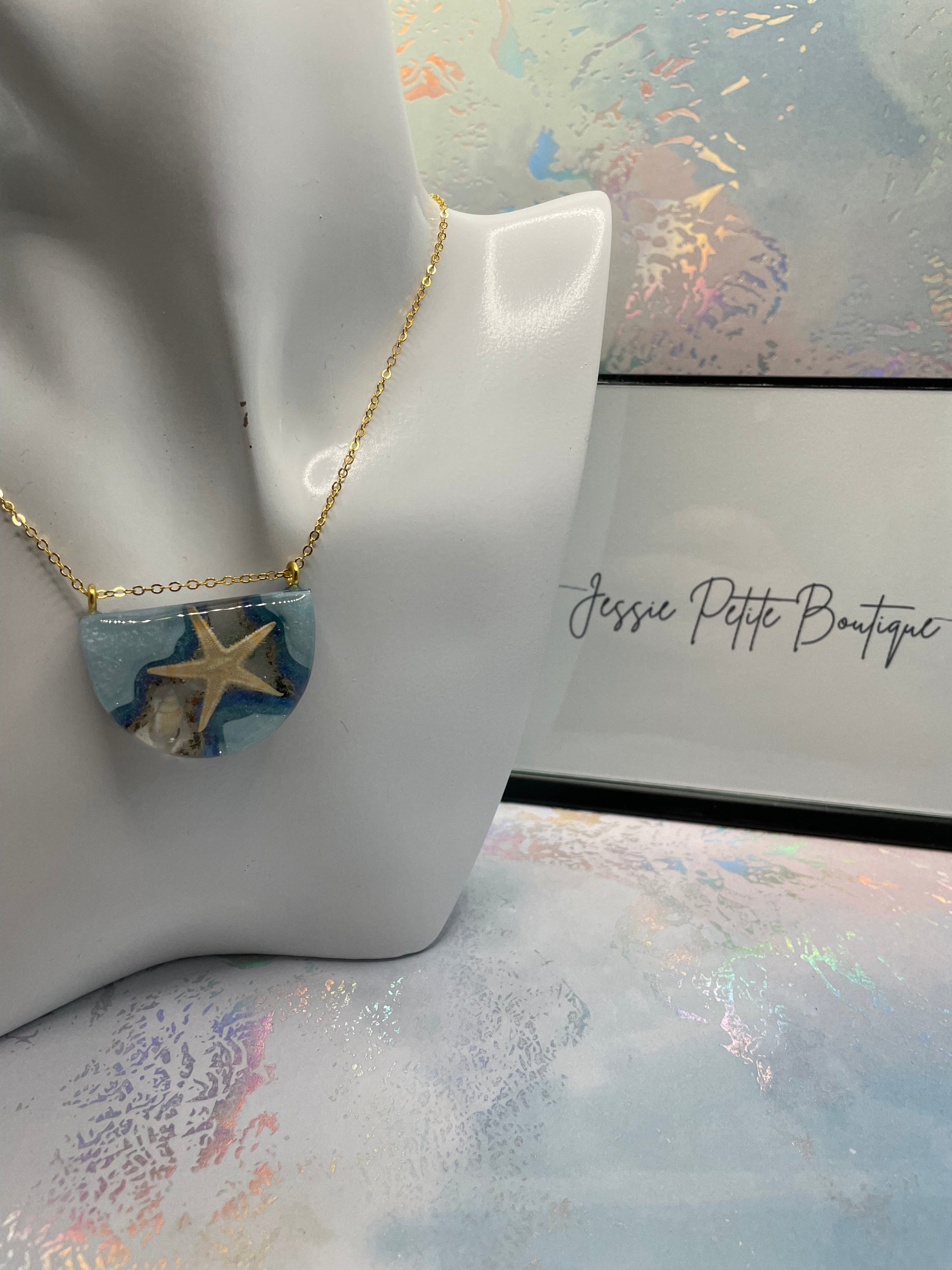 Ce magnifique collier est orné d'un superbe pendentif en demi-cercle qui capture l'essence de l'océan, avec ses tons clairs et bleus, rehaussés de détails complexes d'étoile de mer et de coquillages. Sa chaîne en or de 25 pouces (63 cm) est sans nickel, garantissant un confort optimal. Idéal pour les amoureux de la plage et ceux qui apprécient l'élégance côtière!