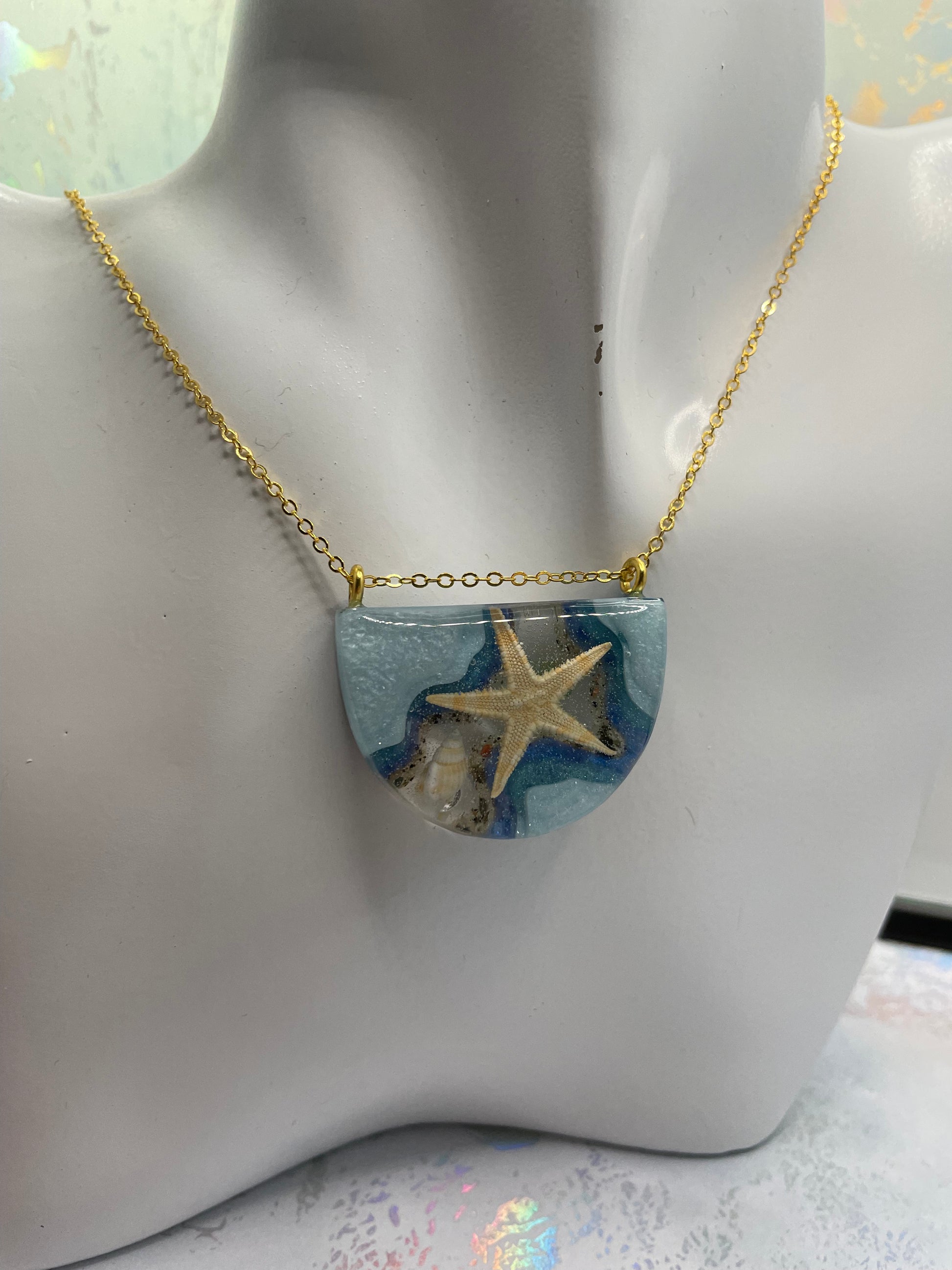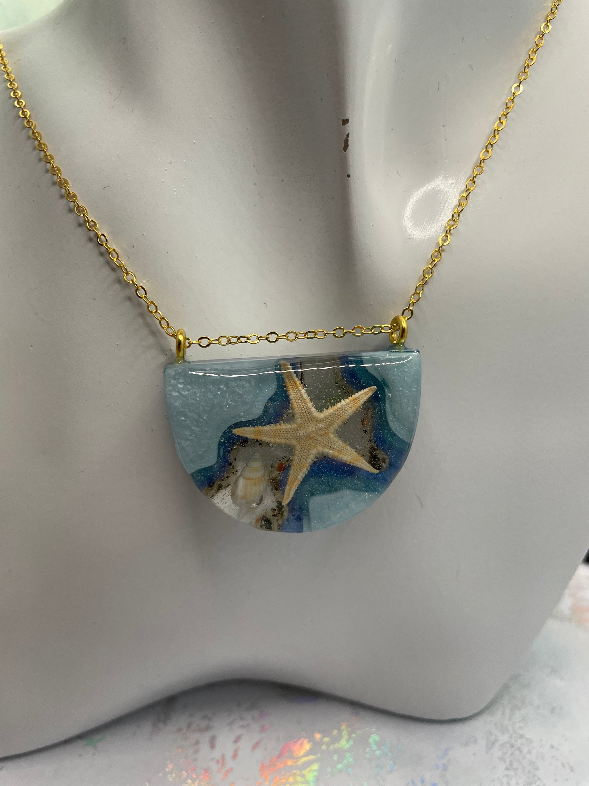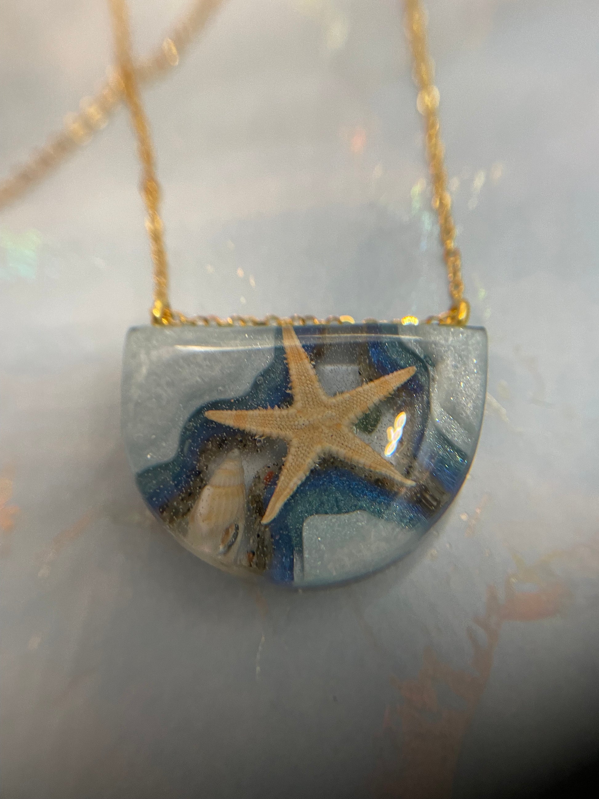 - Matériau : résine, poudre de mica, sable, coquillage, étoile de mer, chaîne sans nickel