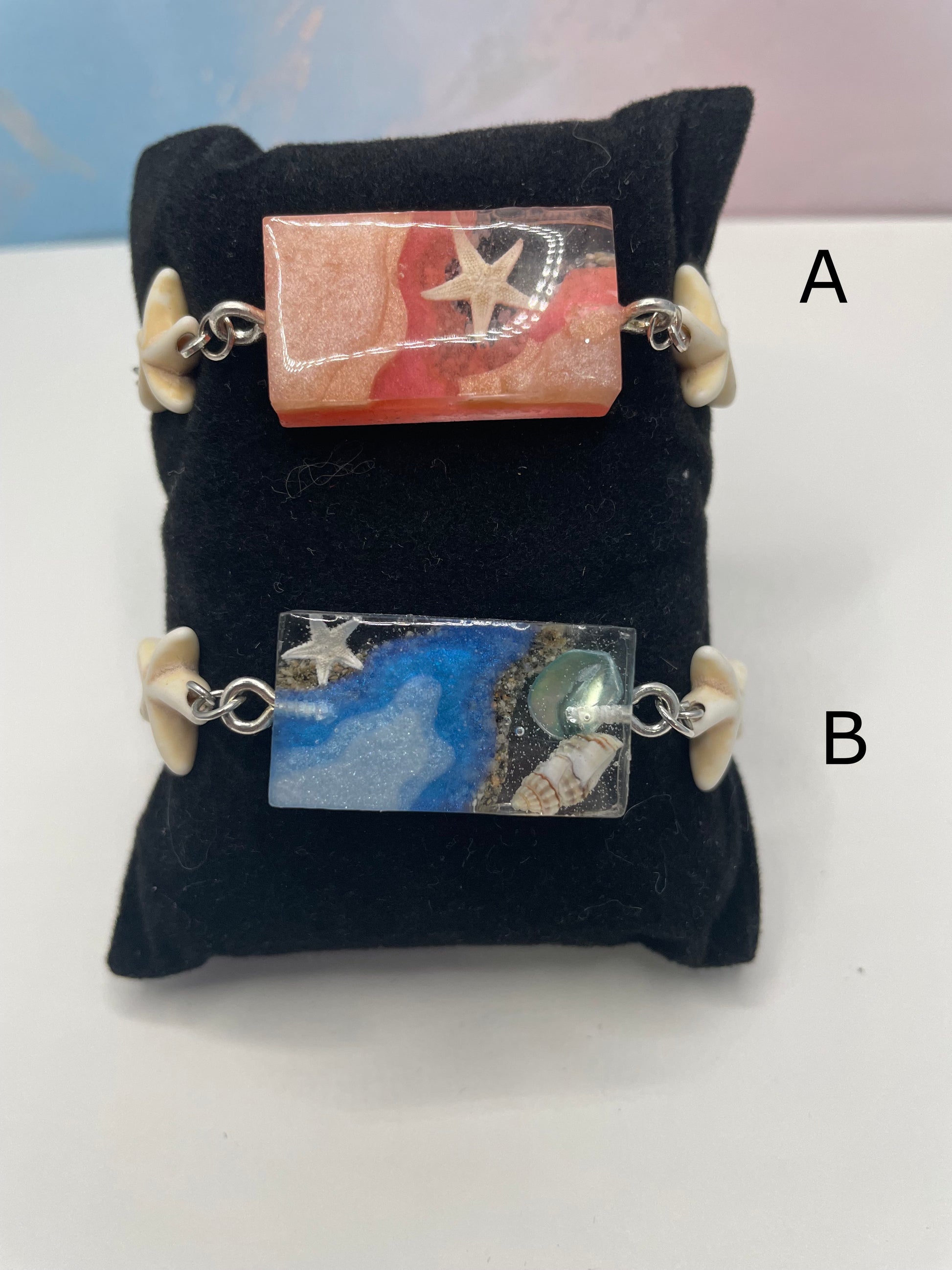 Apportez une touche marine à votre poignet avec ce bracelet ajustable inspiration océan, soigneusement fait à la main. Chaque bracelet est composé d’un pendentif rectangulaire en résine mettant en valeur des couches délicates rehaussées de poudre de mica, de sable naturel, de coquillages et d’une étoile de mer intégrée. Chaque création est unique et évoque une petite scène côtière.