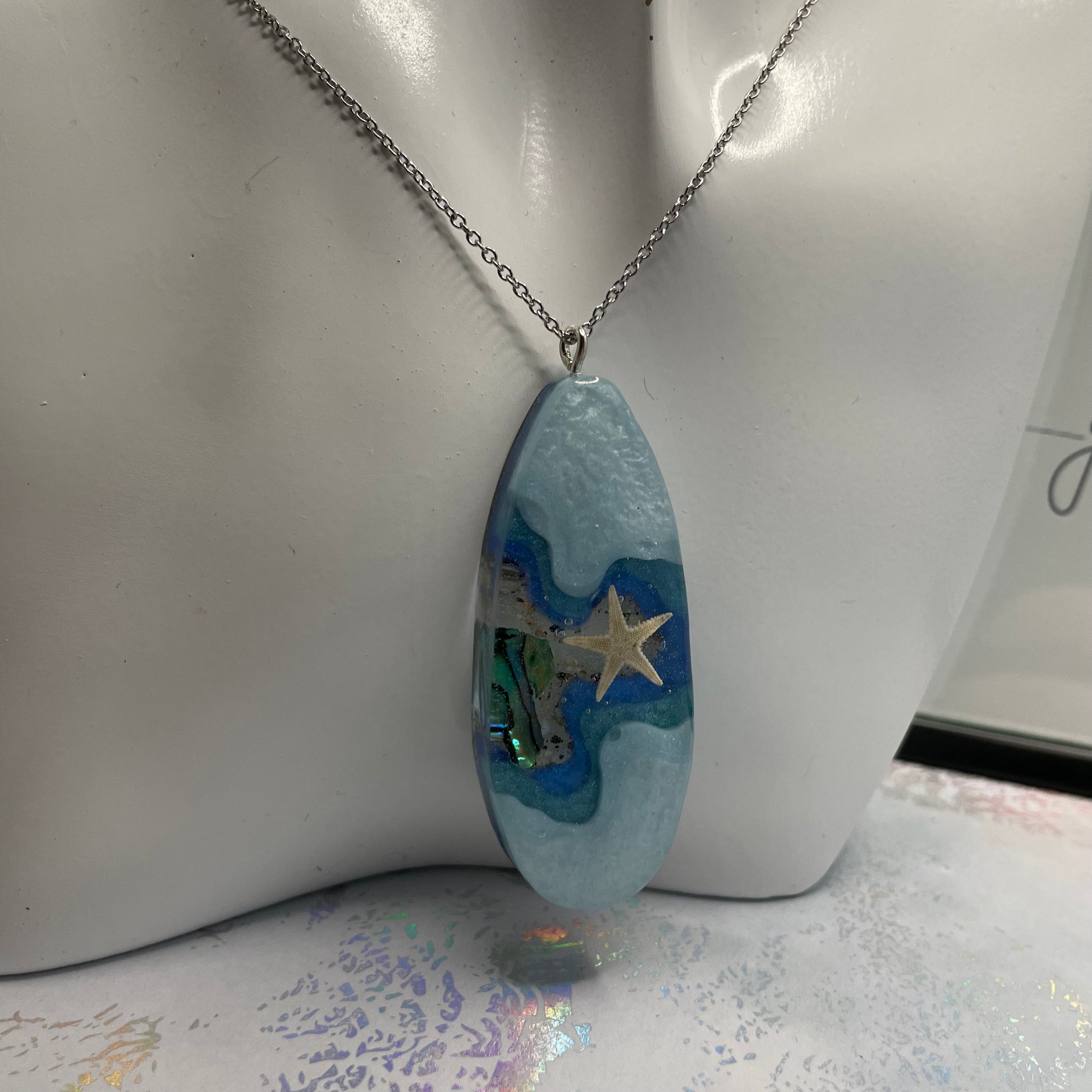 - Matériaux : Résine, poudre de mica, sable, étoile de mer, coquillage
