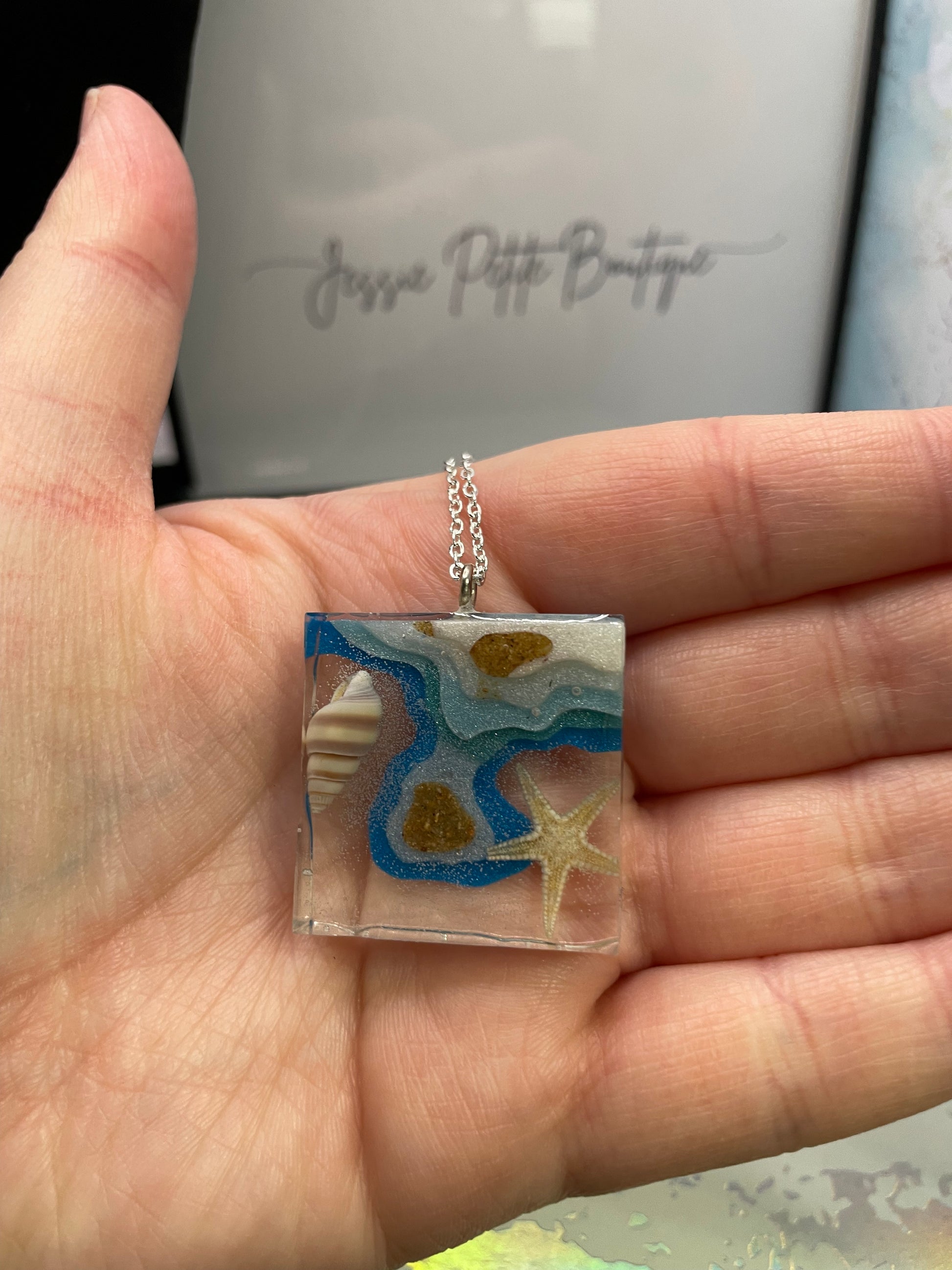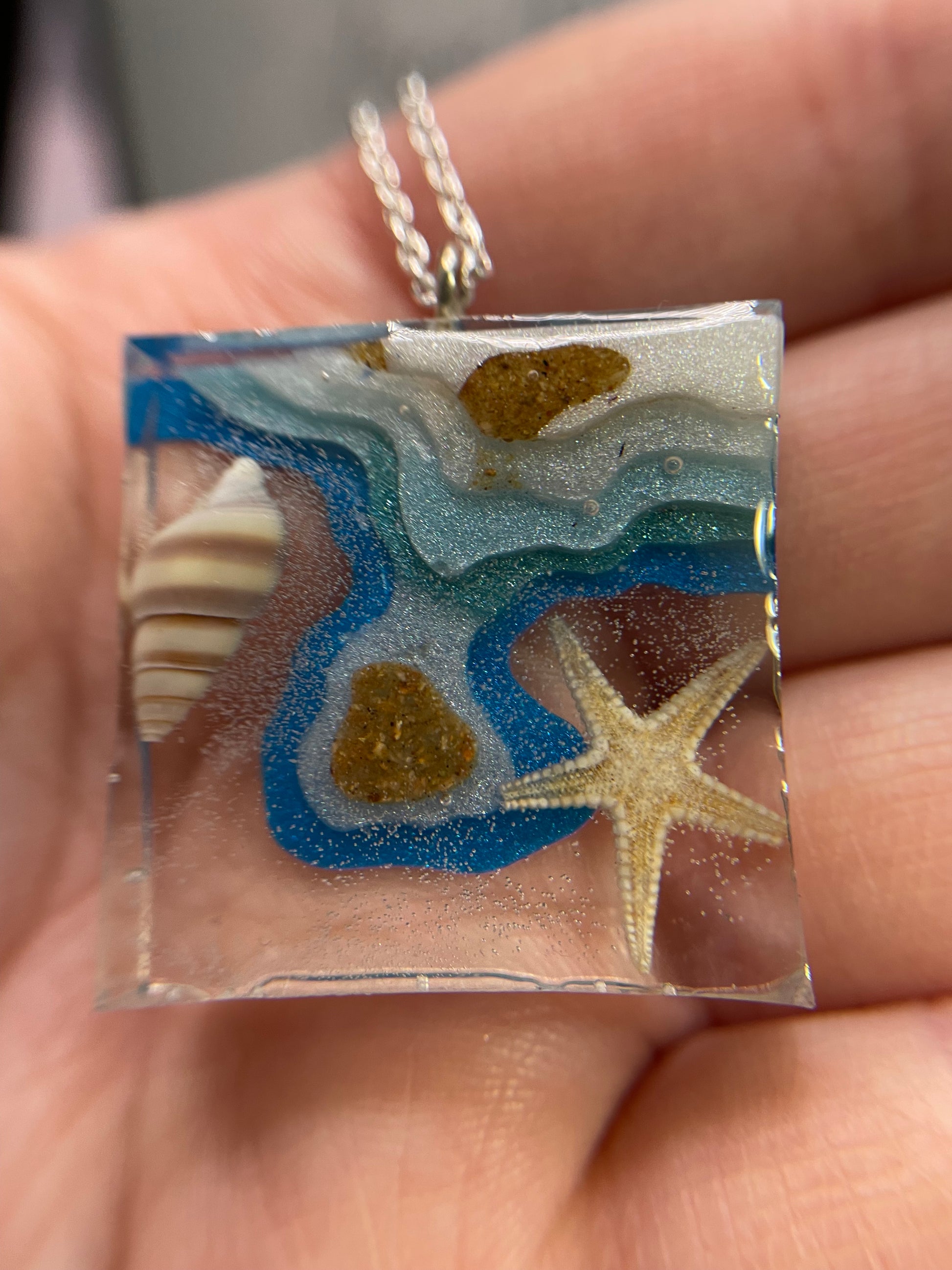 Ce magnifique collier carré sur le thème de l'océan présente un magnifique pendentif en résine avec un mélange de bleu, de blanc, de sable et de nuances claires, évoquant la beauté sereine de la mer. Le pendentif est orné d'accents d'étoile de mer, de coquillage et de sable, rehaussés par le chatoiement de la poudre de mica, ce qui en fait une pièce remarquable pour tout amoureux de l'océan.