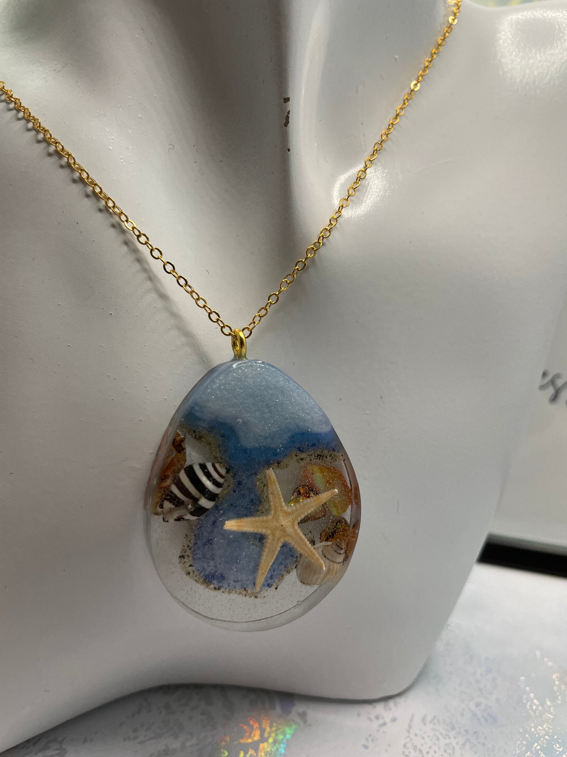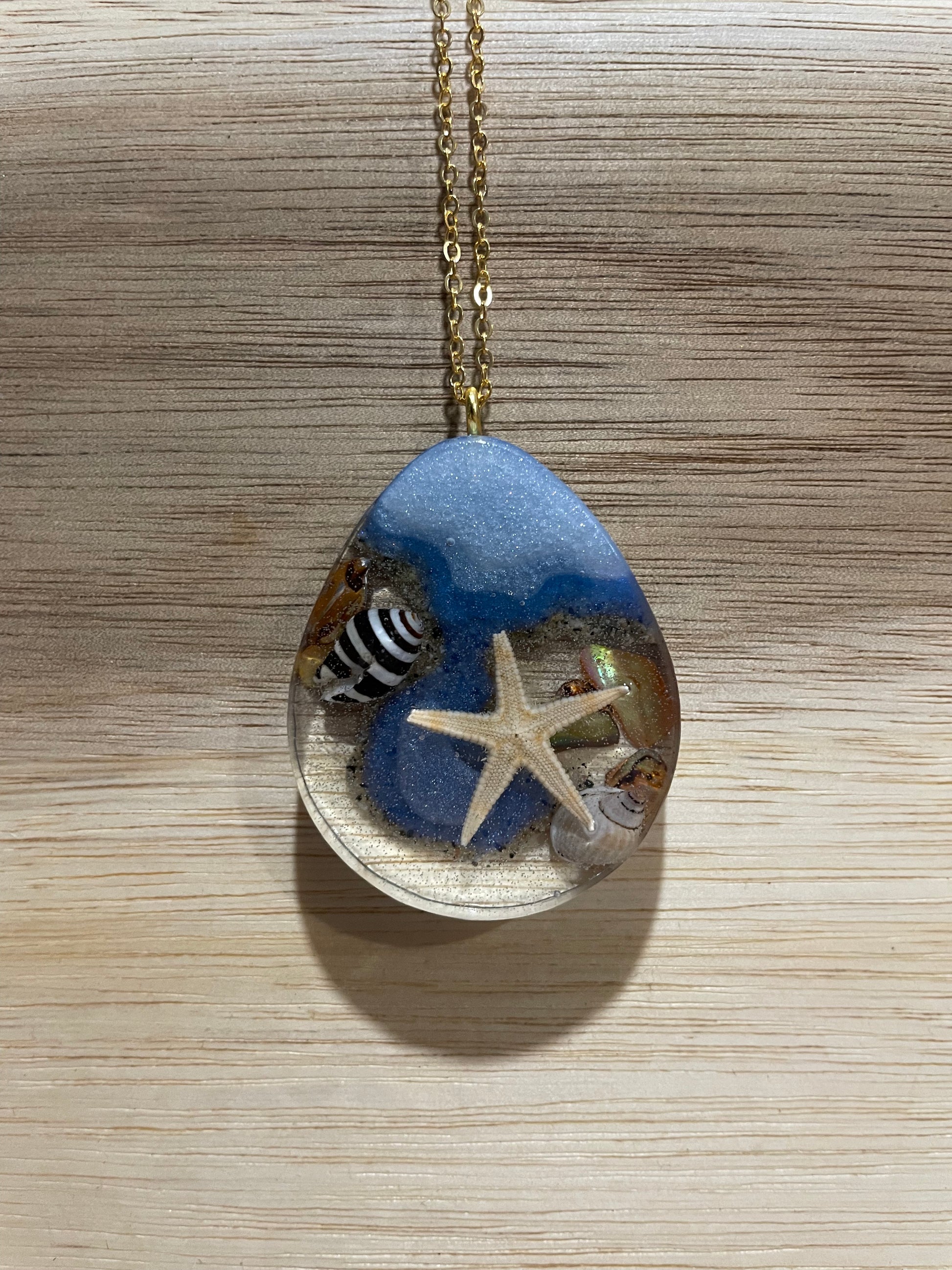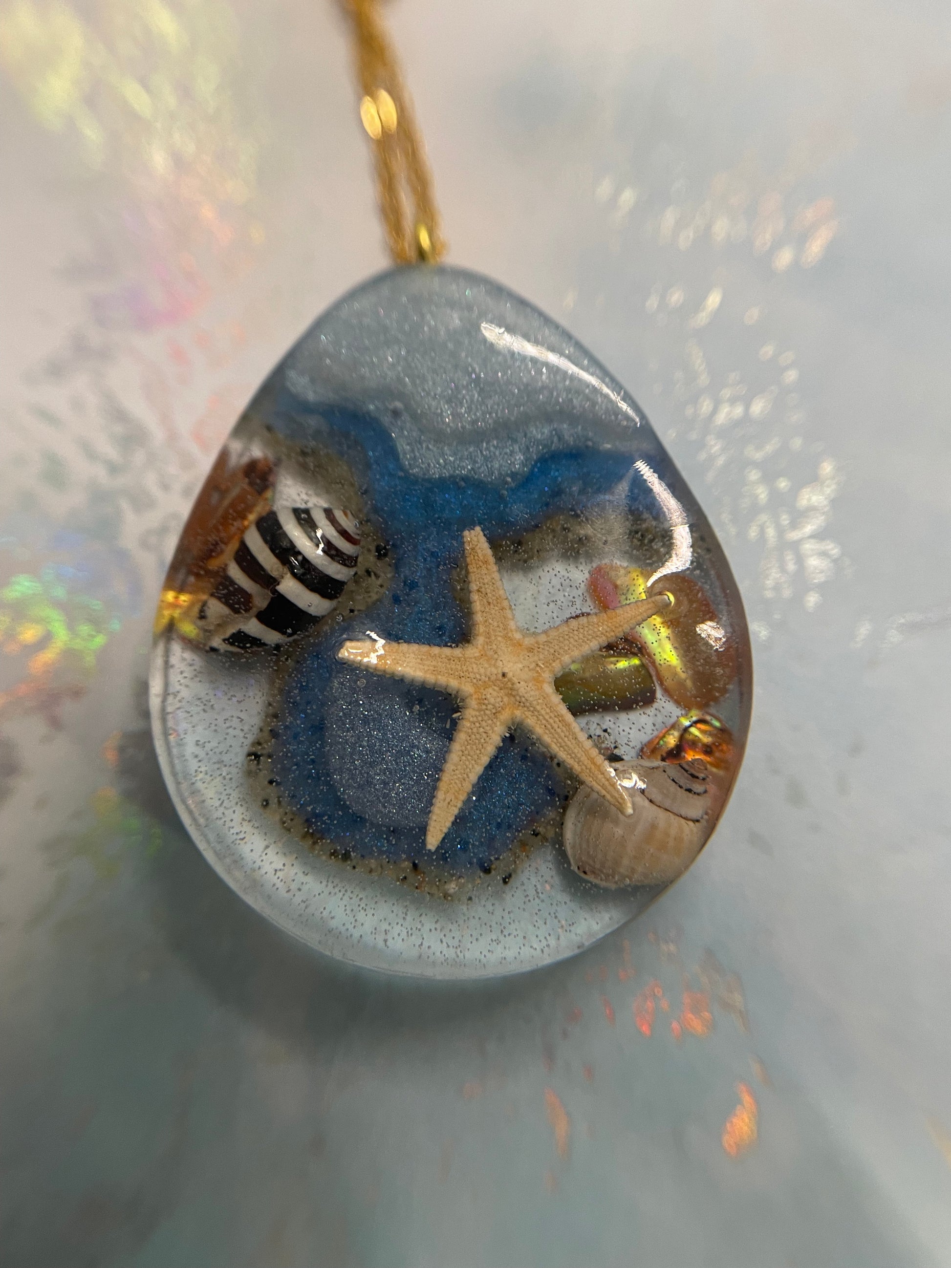 - Matériaux : Résine, poudre de mica, étoile de mer, coquillage, sable, chaîne sans nickel