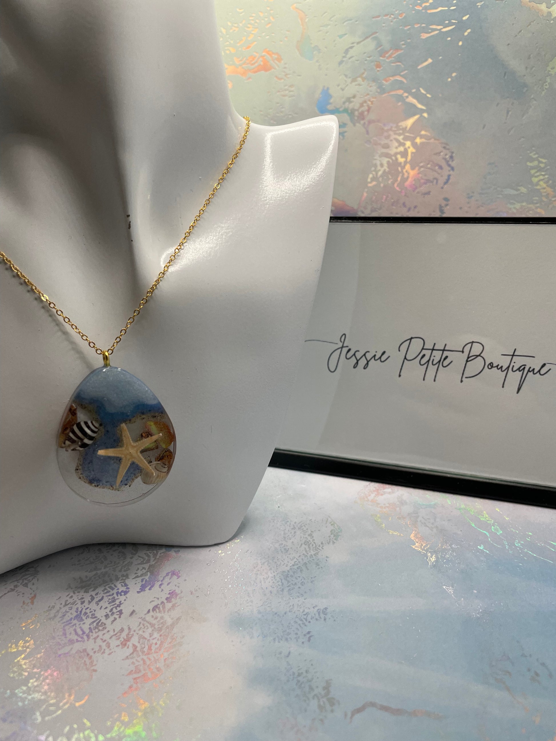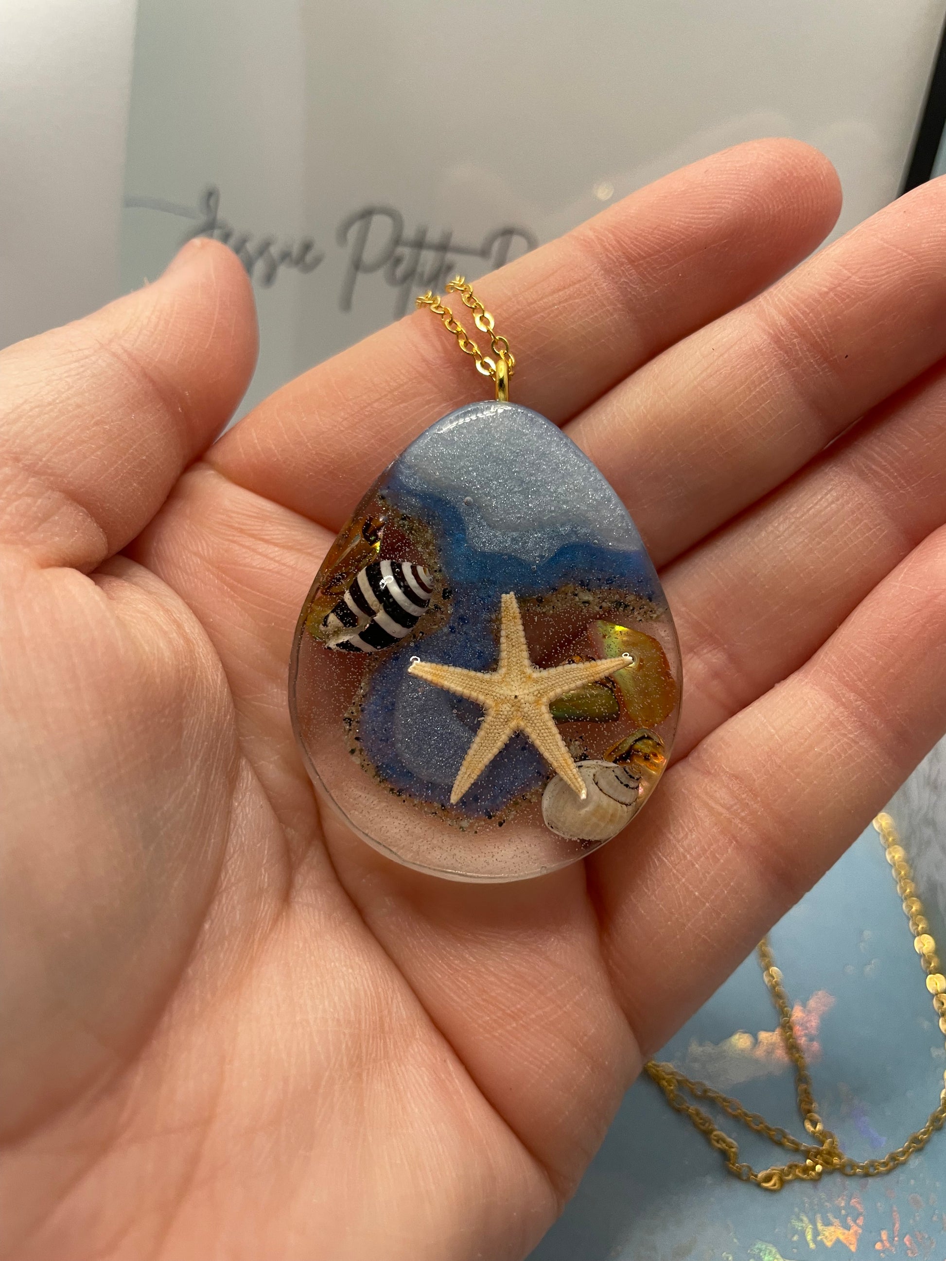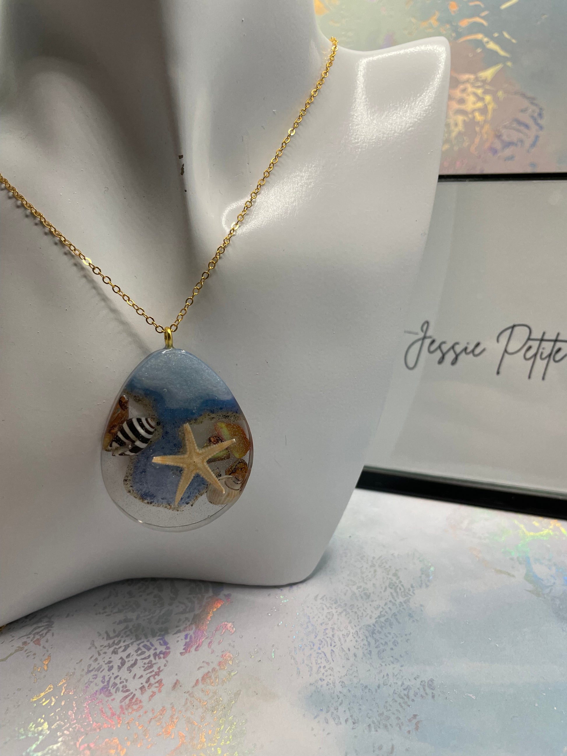 - Matériaux : Résine, poudre de mica, étoile de mer, coquillage, sable, chaîne sans nickel