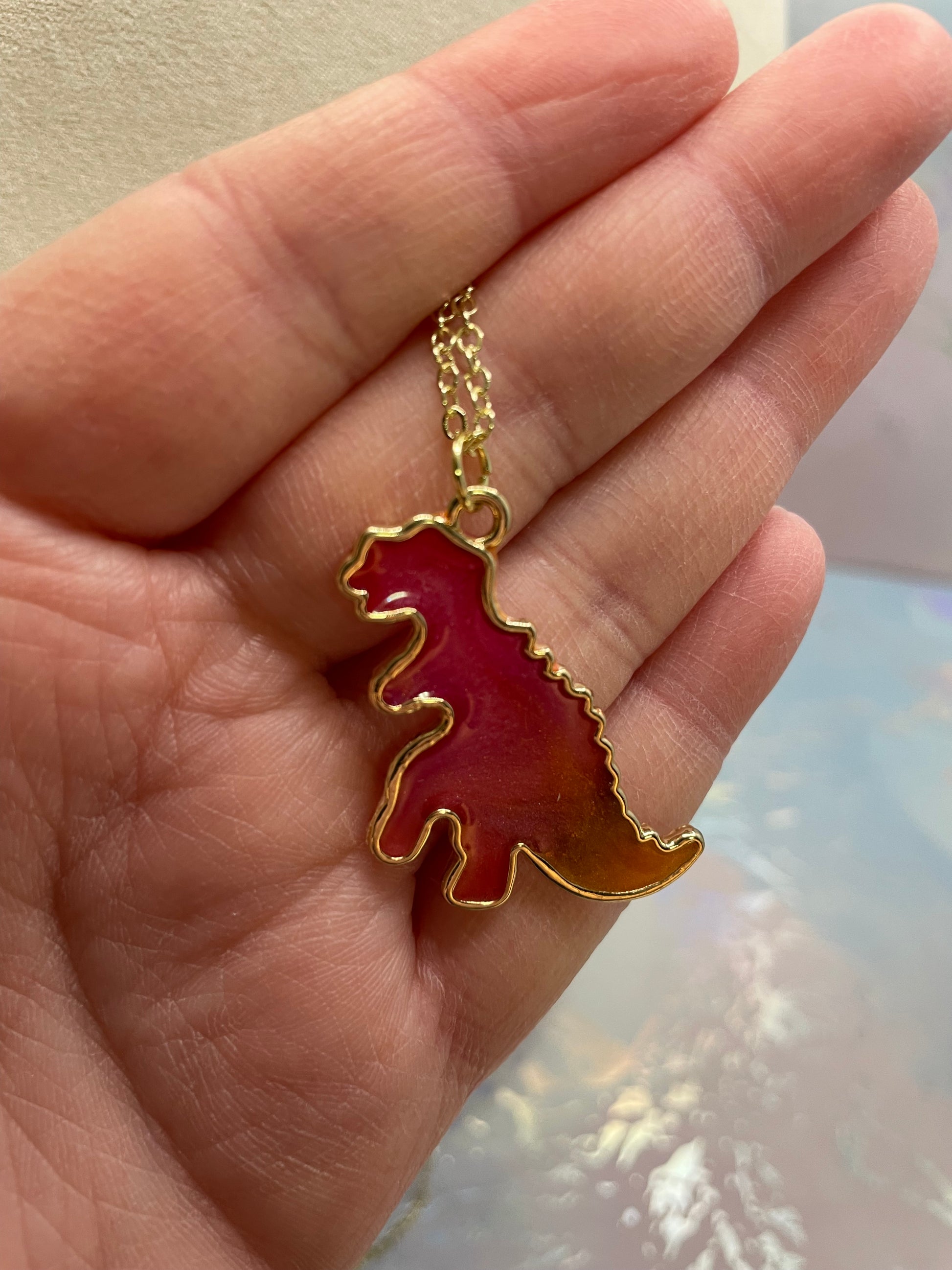 Ce collier original met en valeur un pendentif en forme de dinosaure au fini dégradé allant de l’orange chaleureux au fuchsia éclatant. La poudre de mica apporte un léger effet brillant qui rehausse la profondeur des couleurs et crée un éclat doux et lumineux. Sa silhouette arrondie et son contour doré ajoutent une touche élégante à ce bijou original.