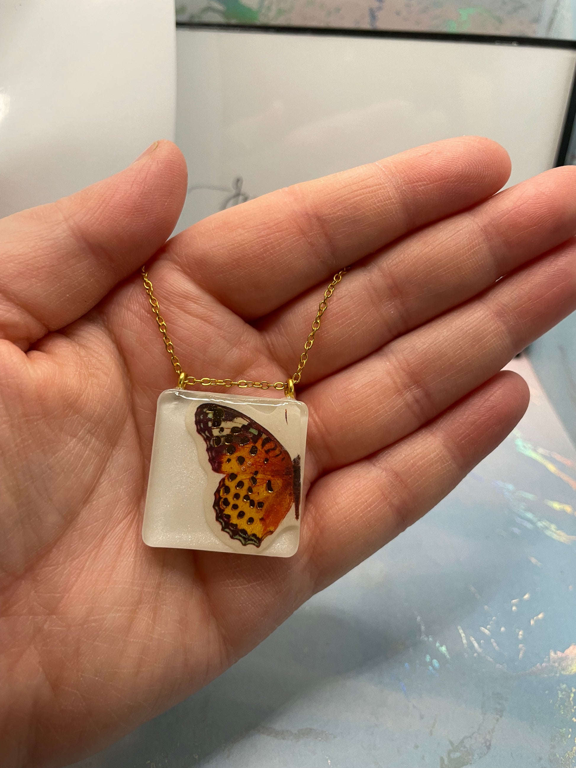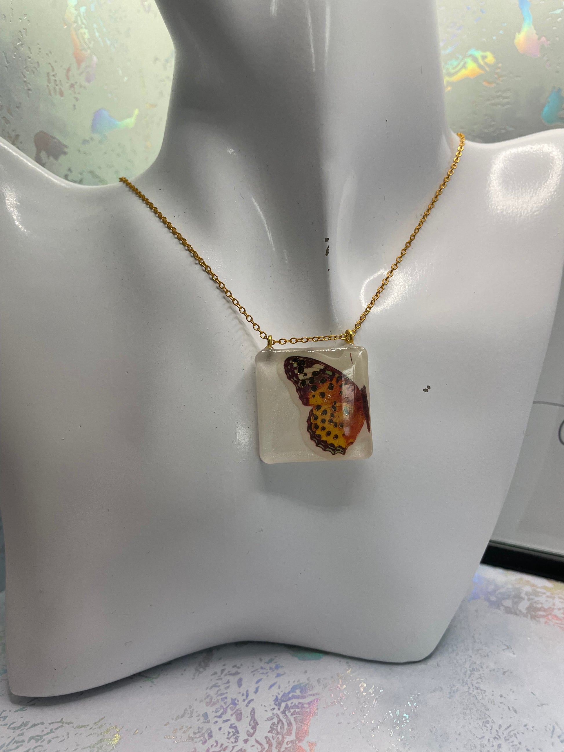 Ce collier combine la beauté naturelle d'un papillon avec un carré blanc minimaliste, créant un accessoire intemporel qui ajoute une touche de charme à n'importe quelle tenue.