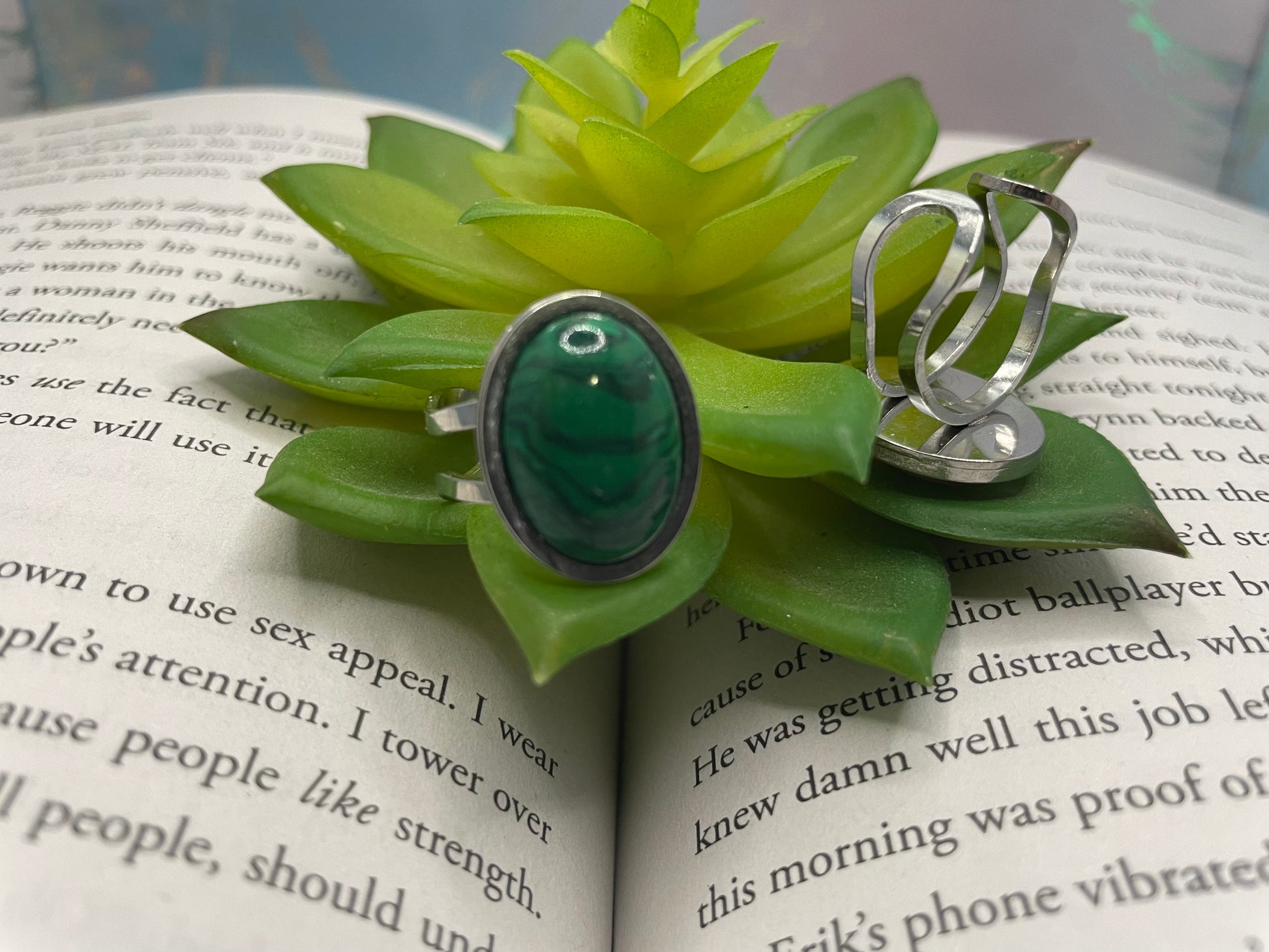 Une sélection raffinée de bagues ovales mettant en valeur différentes pierres, chacune montée sur un anneau ajustable en acier inoxydable.