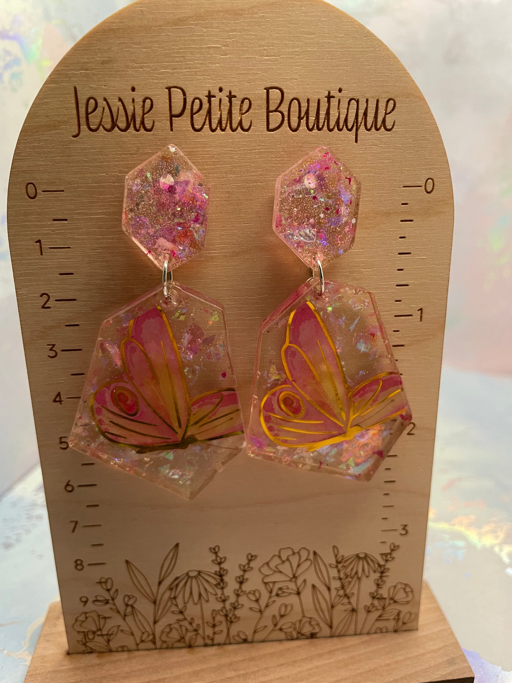 Boucles d'oreilles hexaèdre papillon rose – Hypoallergéniques