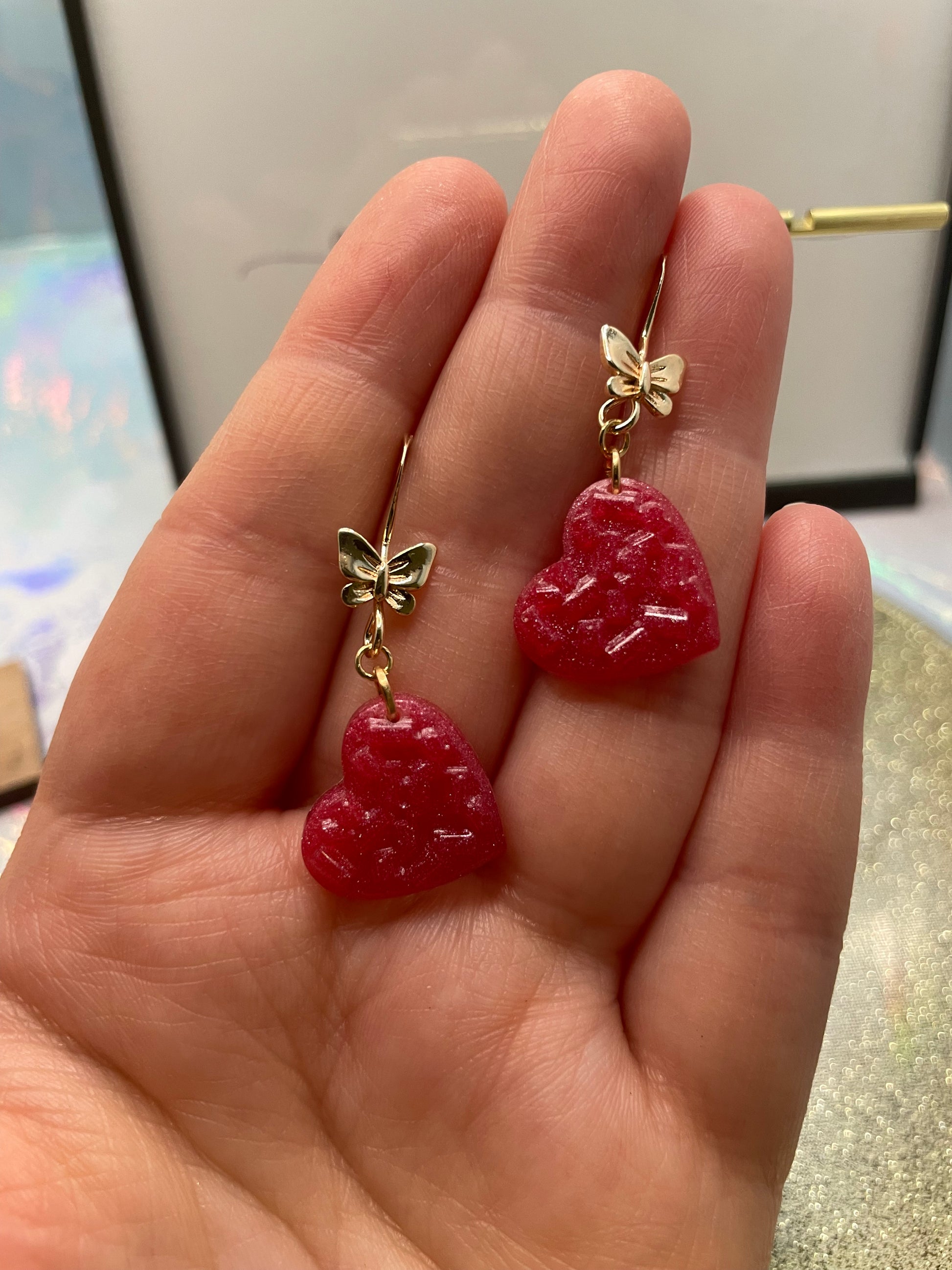 Boucles d'oreilles cœur rose bonbon avec accent papillon