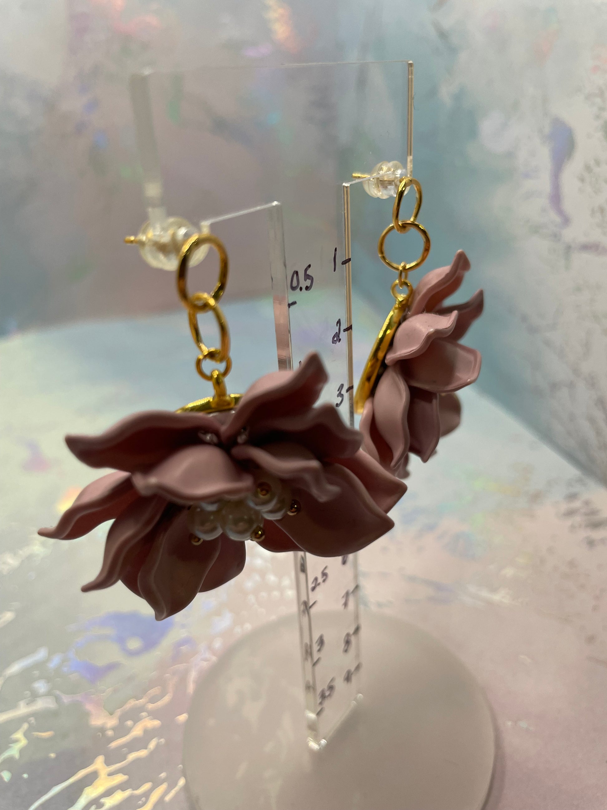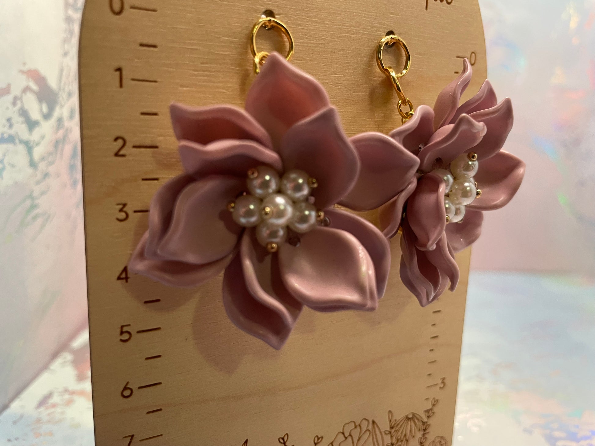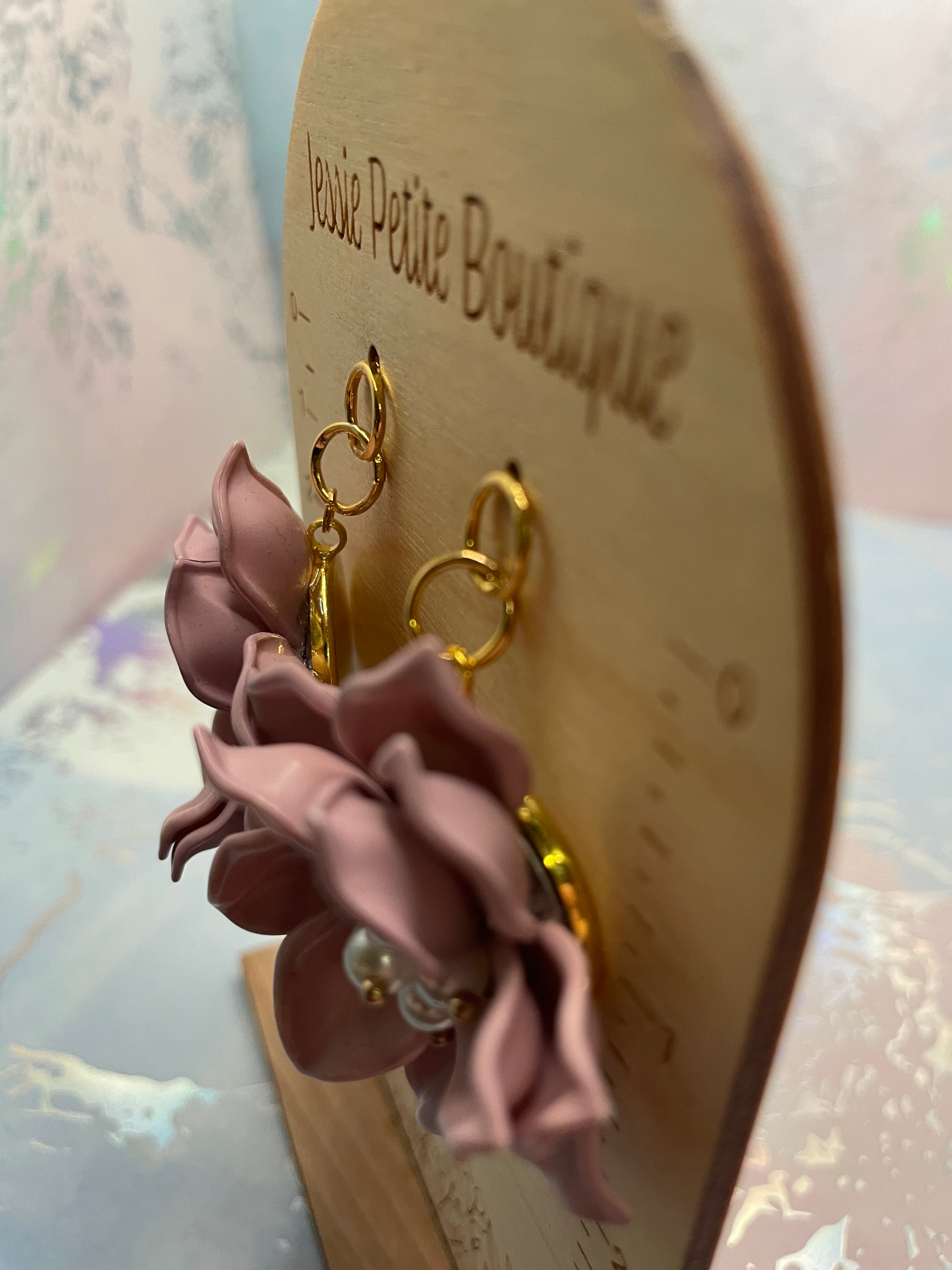 Boucles d’oreilles fleur rose avec perles pendante-Sans Nickel