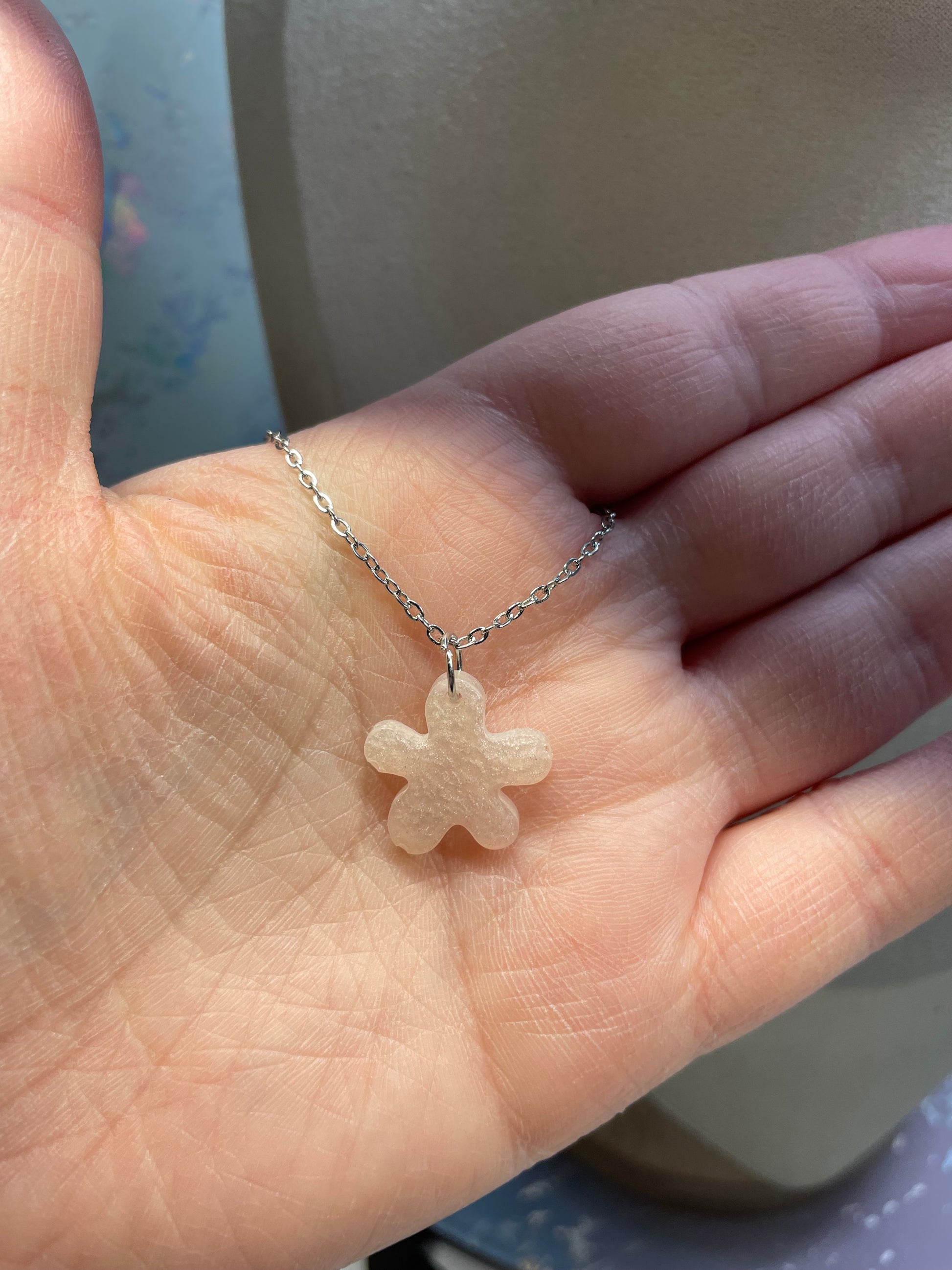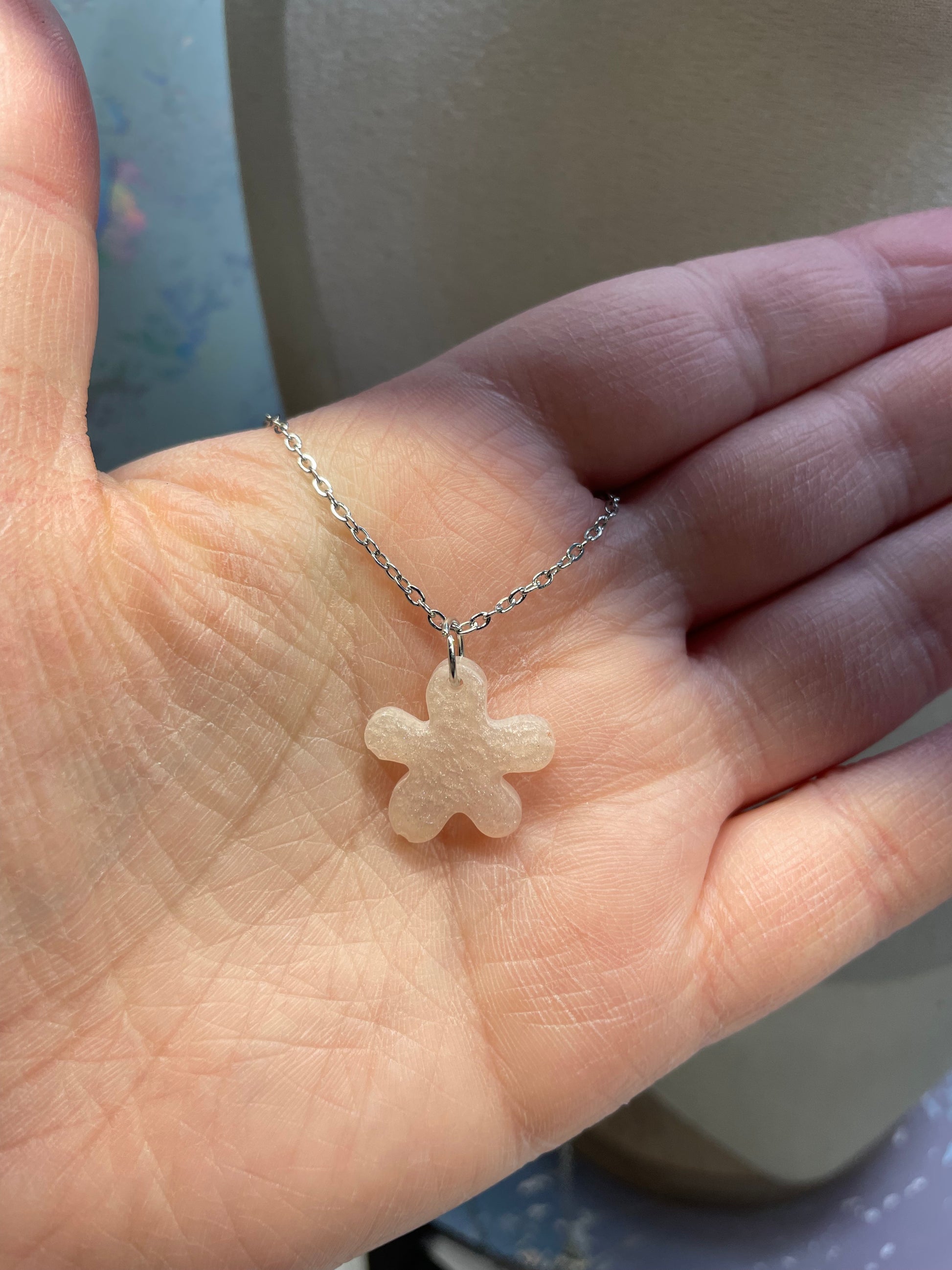 Ce collier délicat met en valeur une charmante fleur rose en résine aux subtils reflets de poudre de mica. Ce délicat pendentif est associé à une chaîne en argent sans nickel de 18 pouces (45 cm), offrant légèreté et confort.