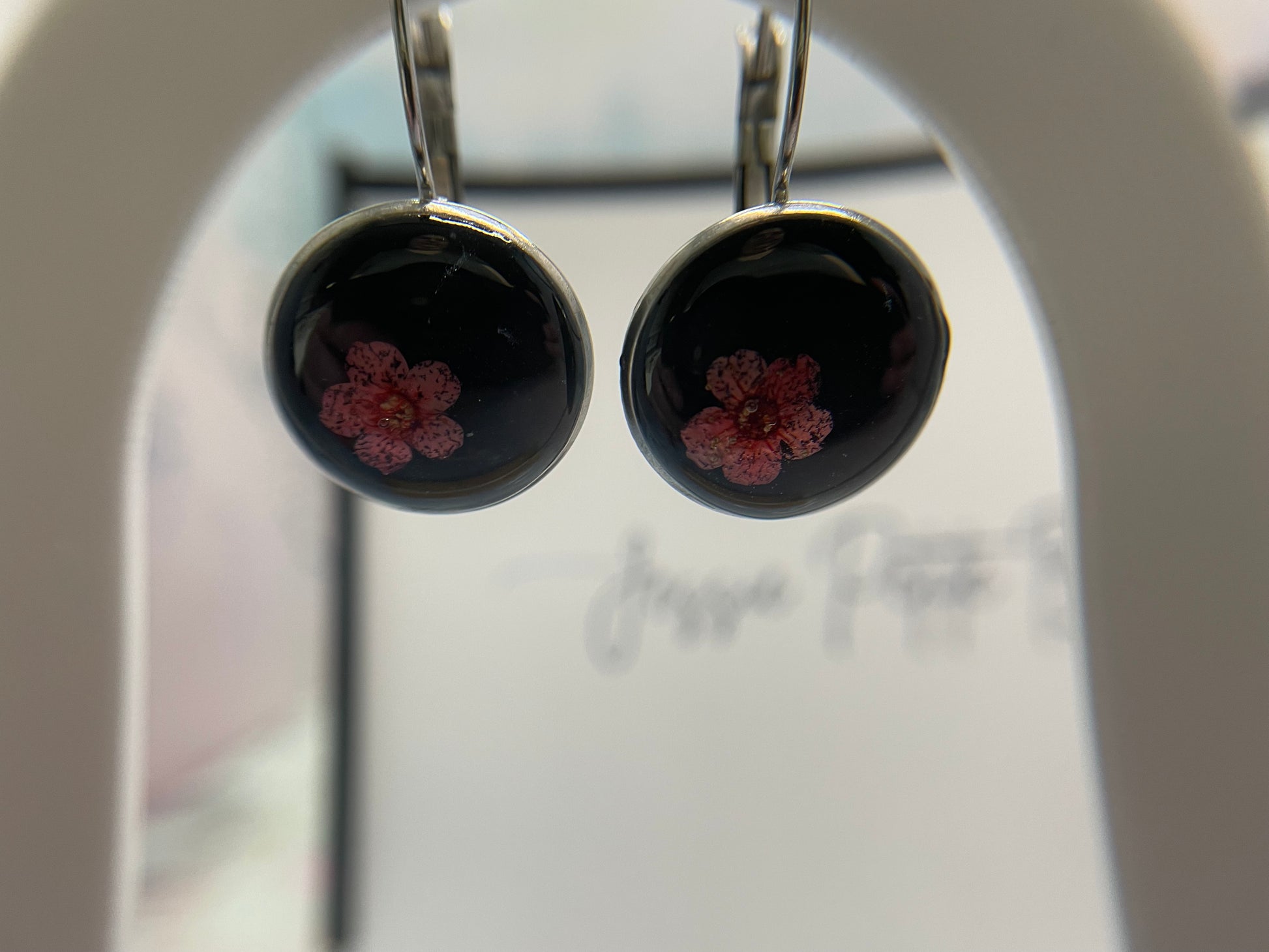 Fines et intemporelles, ces boucles d’oreilles à cabochon mettent en valeur une véritable fleur de myosotis rose séchée, délicatement préservée dans la résine sur un fond noir profond. Le contraste souligne les détails naturels de la fleur et crée un bijou à la fois élégant et tout en douceur.