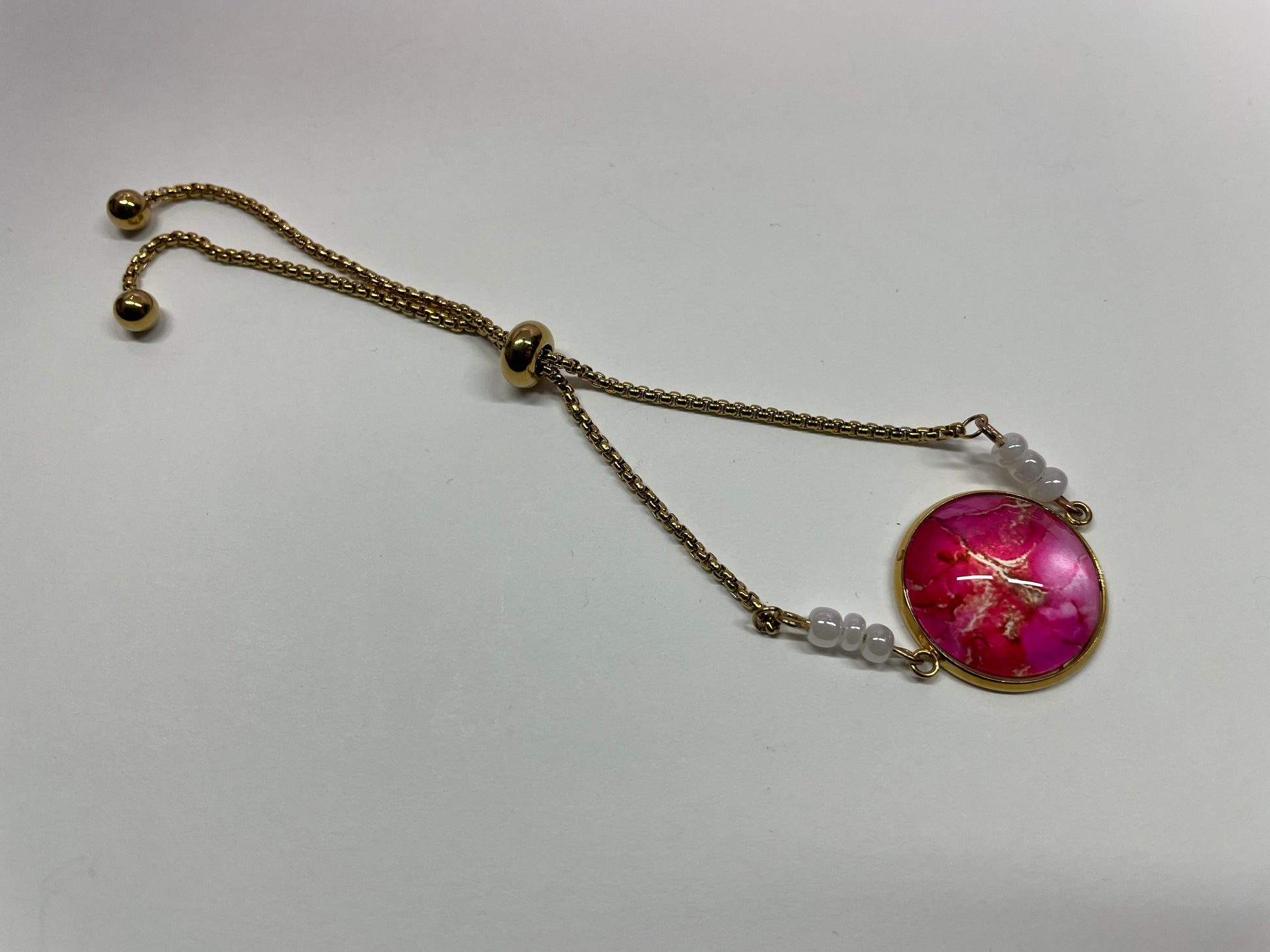 Ce bracelet ajustable en acier inoxydable est orné d’un cabochon en verre de 20 mm aux tons rose vif, rehaussé de délicats motifs marbrés. Des billes blanches de 4 mm viennent adoucir le design et apporter une touche lumineuse et élégante.