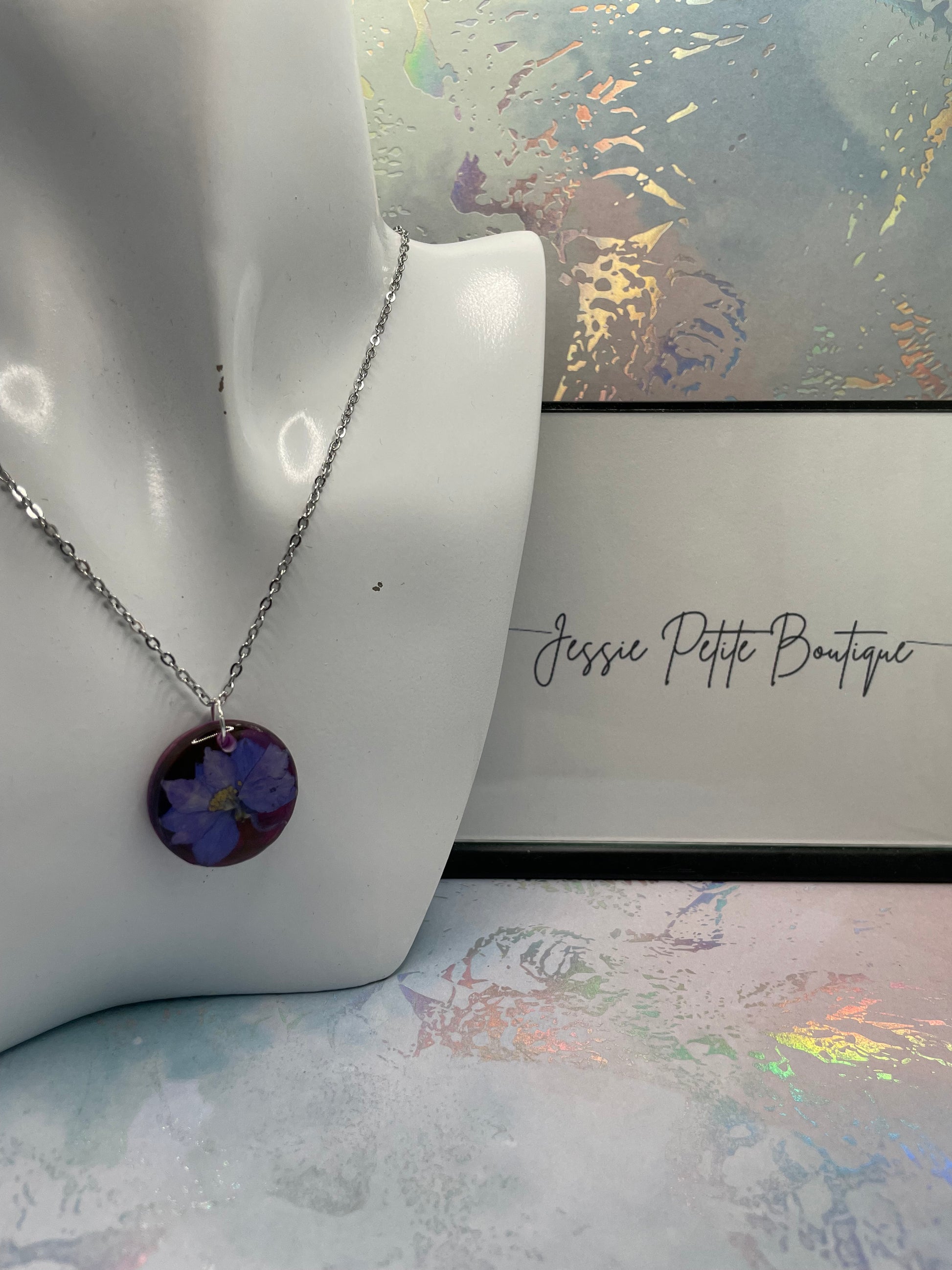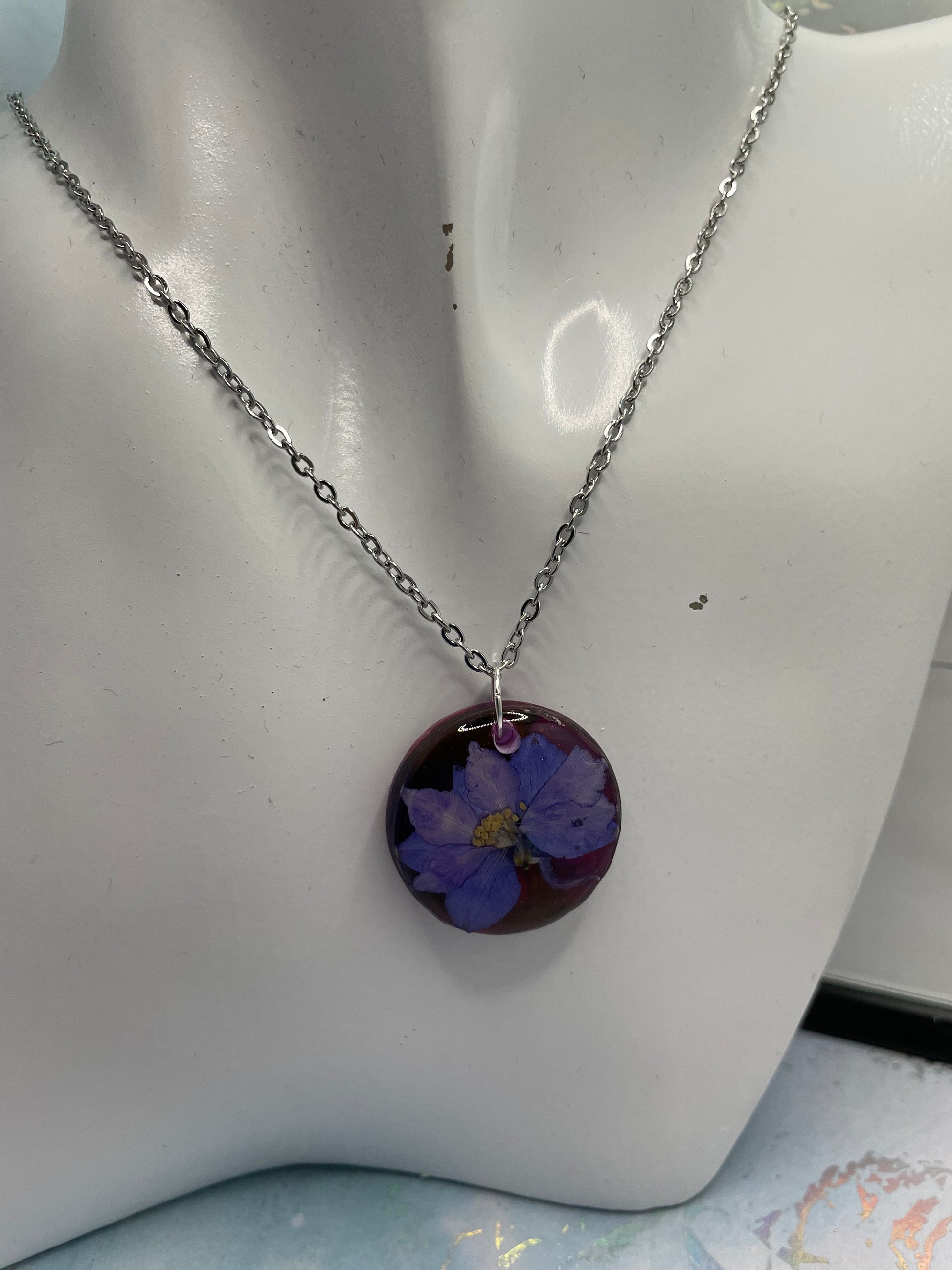 Ce magnifique pendentif présente une délicate fleur mauve enfermée dans une résine translucide rouge et mauve , offrant un look vibrant et élégant.