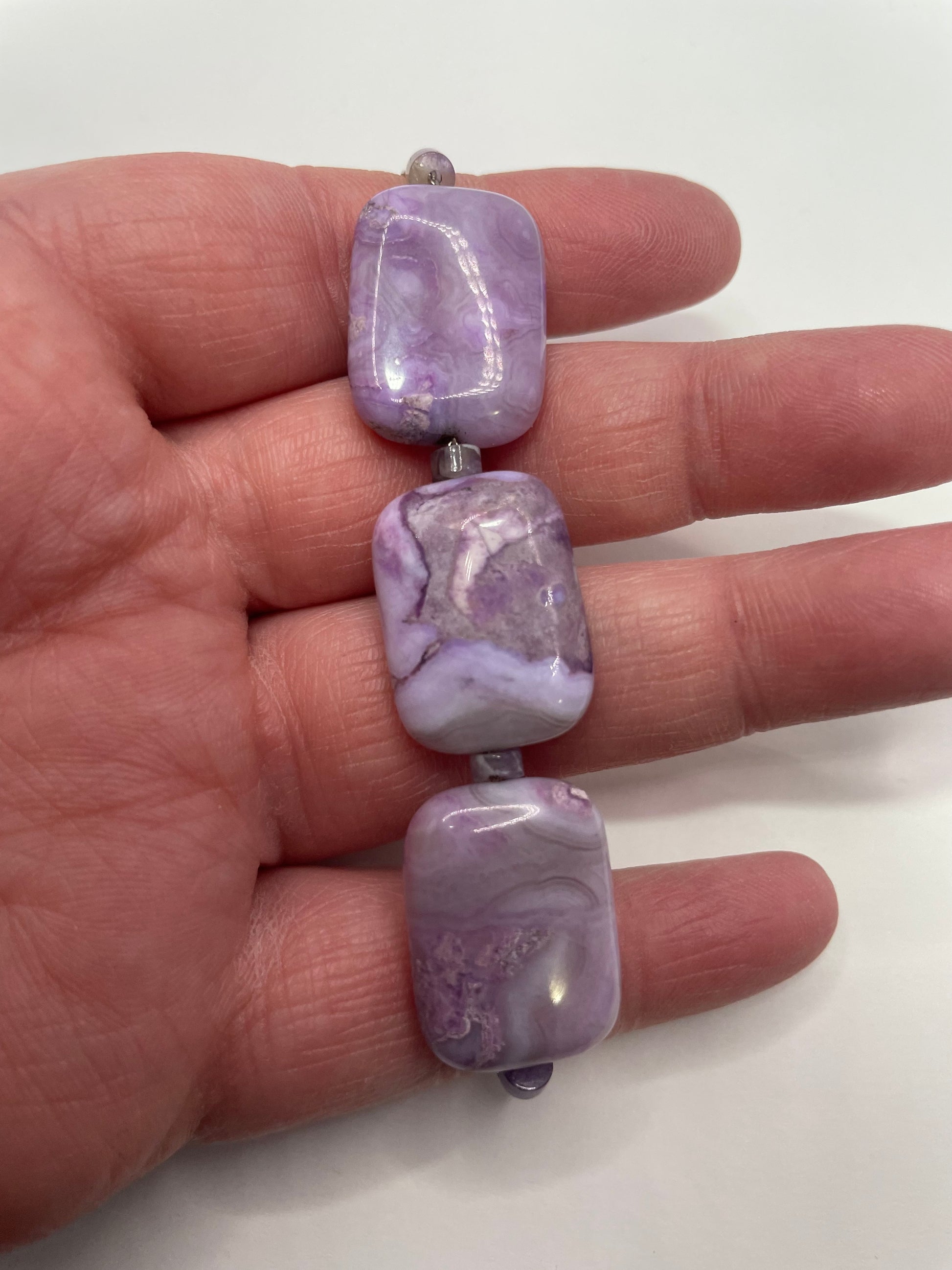 Ce bracelet élégant est composé de trois pierres mauves polies, chacune présentant des marbrures naturelles uniques et de subtiles variations de couleur. Leur forme rectangulaire apporte une touche audacieuse tout en restant raffinée, parfaitement mise en valeur par des composantes en acier inoxydable.